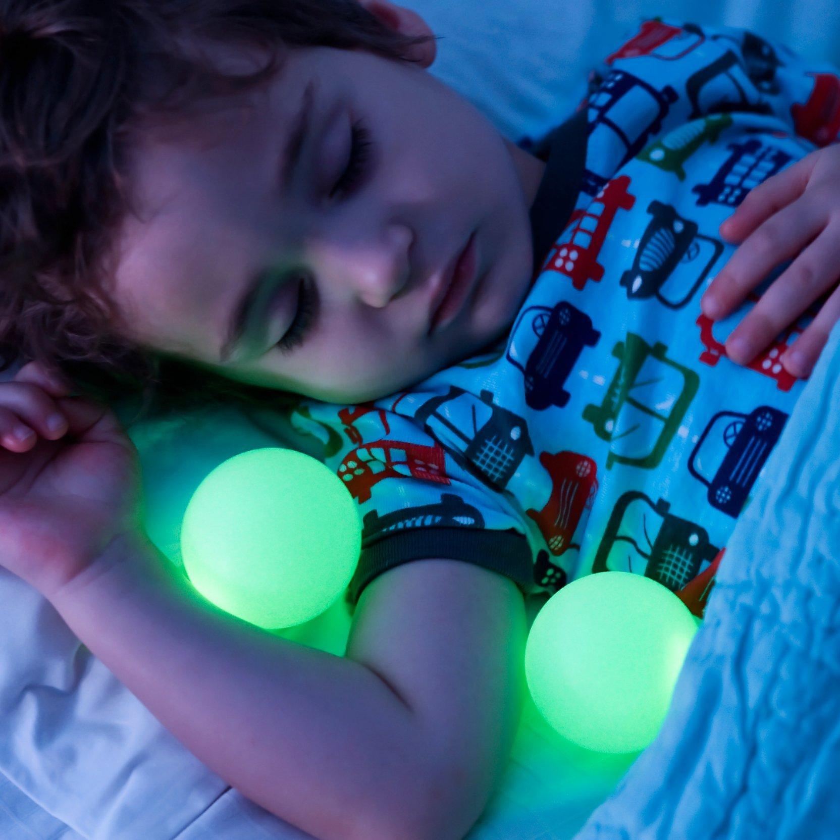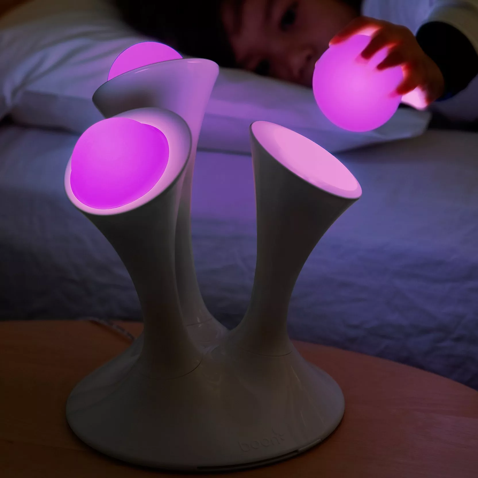 This multi-coloured, interactive nightlight has removable, illuminated Glo balls for a unique bed time experience. With nothing electronic in them, the Glo balls don't get warm and they won't break. The glow fades to dark after 30 minutes, helping children to fall asleep naturally. Choose your favourite Glo colour, or select circulating colours to suit your little one's mood. BPA-free, Phthalate-free, and PVC-free.