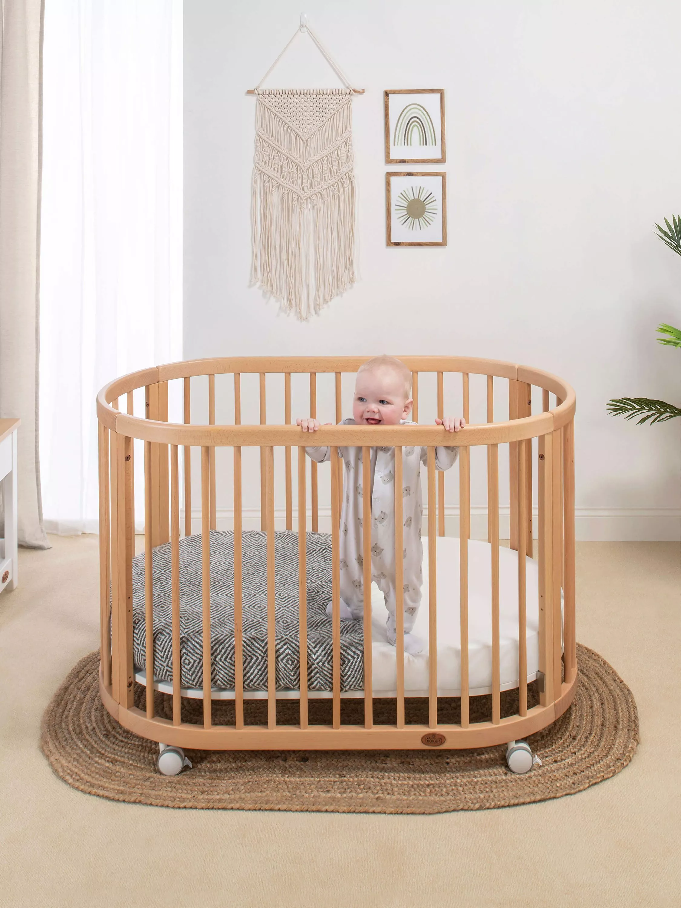 Lockable castors, and the fact it can be manoeuvred through standard door frames, mean easy and safe mobility, so when the time comes your Oasis Oval Cot can be moved into the nursery where it will become a stunning centrepiece to treasure for years to come.