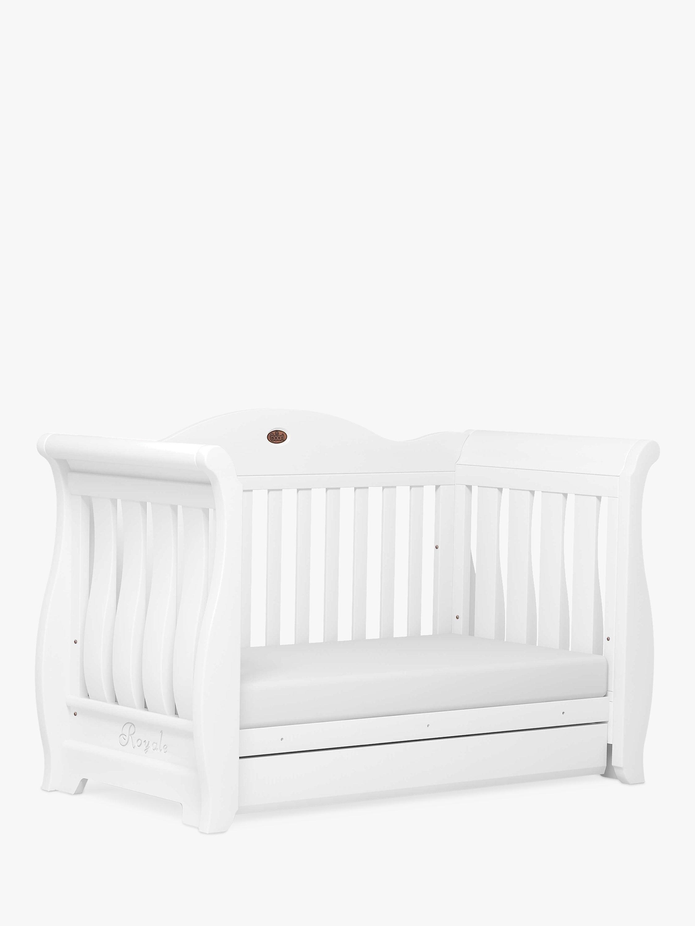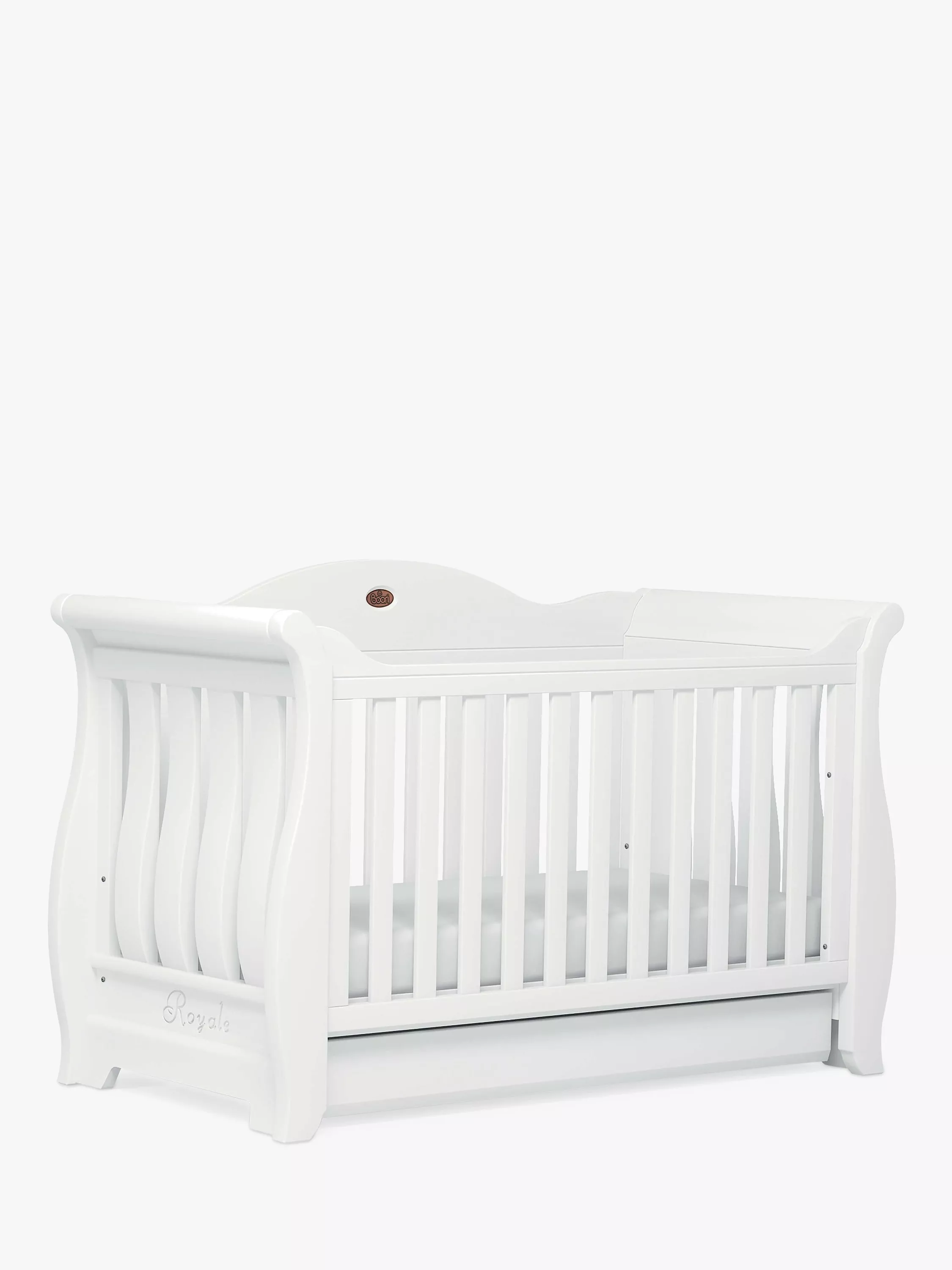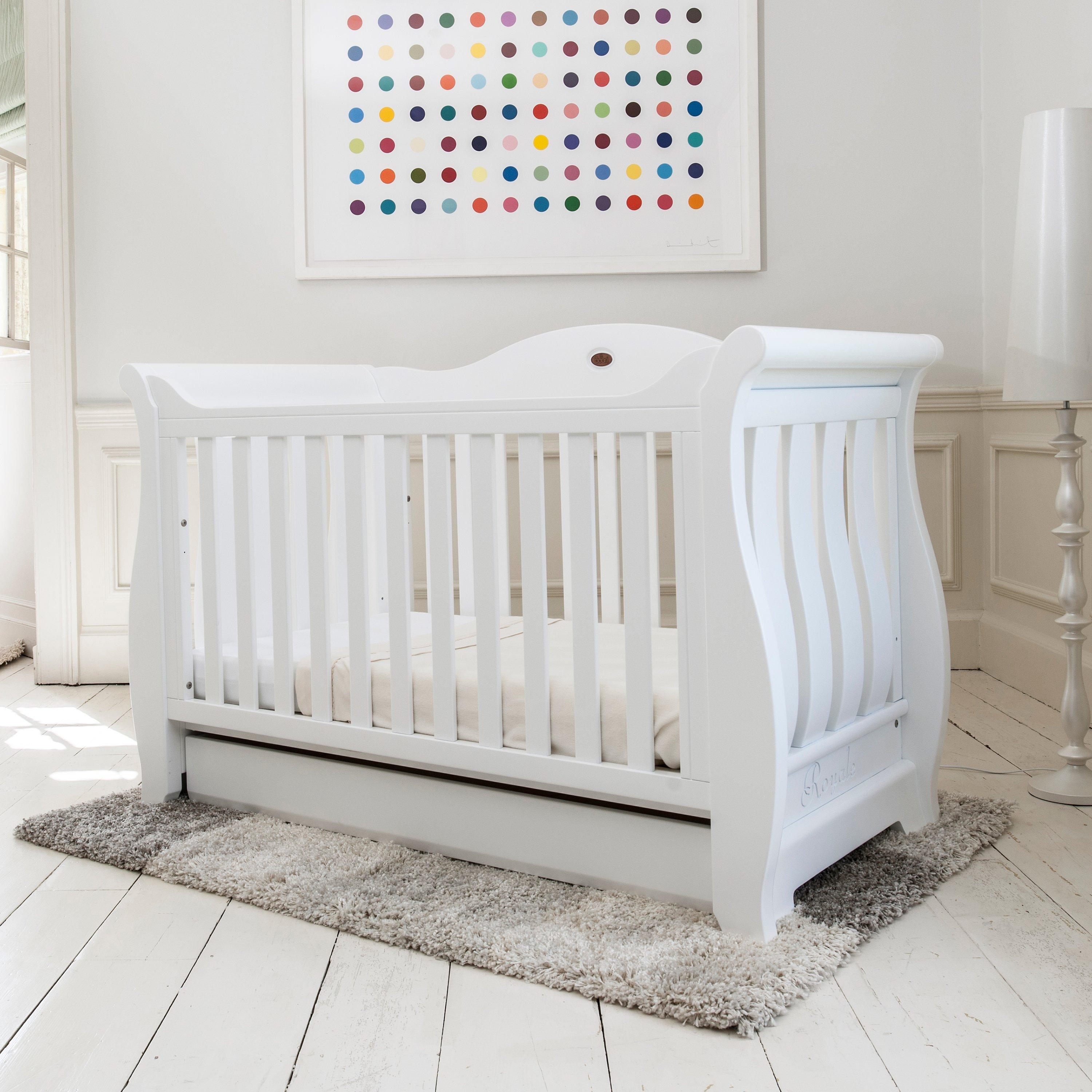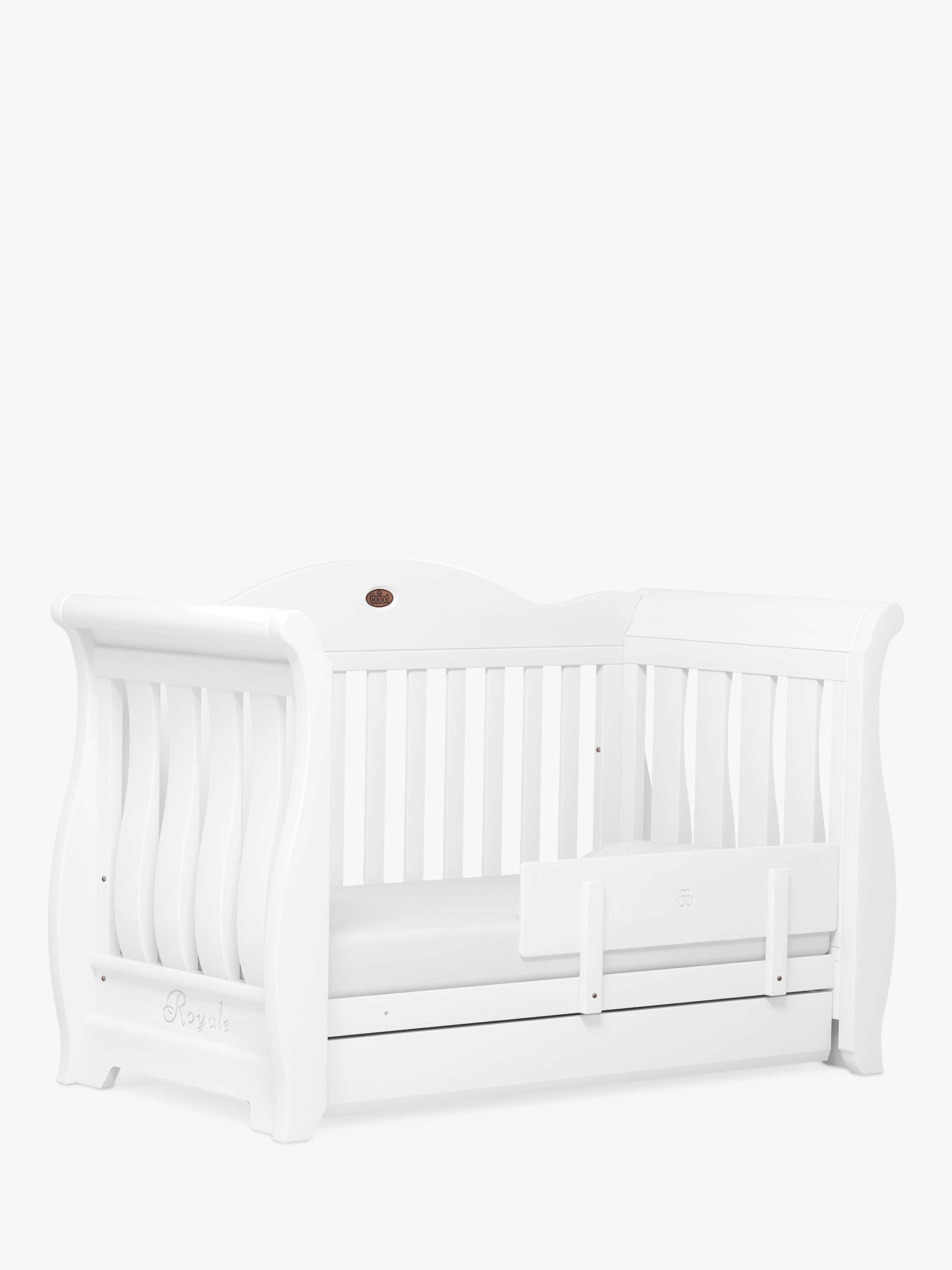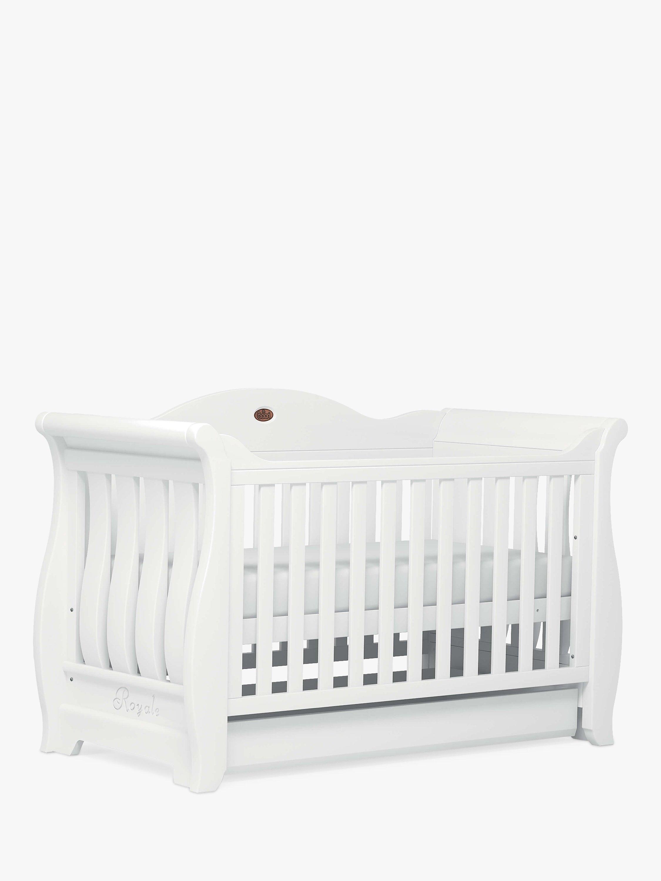 Made from Araucaria timber, which is a plantation timber from Queensland in Eastern Australia, the Sleigh Royale Cot/Cotbed is finished in a fresh shade of white, and features fine groove detailing with elegant trims. The cotbed has two base heights for ease of access and to keep baby safe. It converts easily into a toddler bed by removing the side rail.