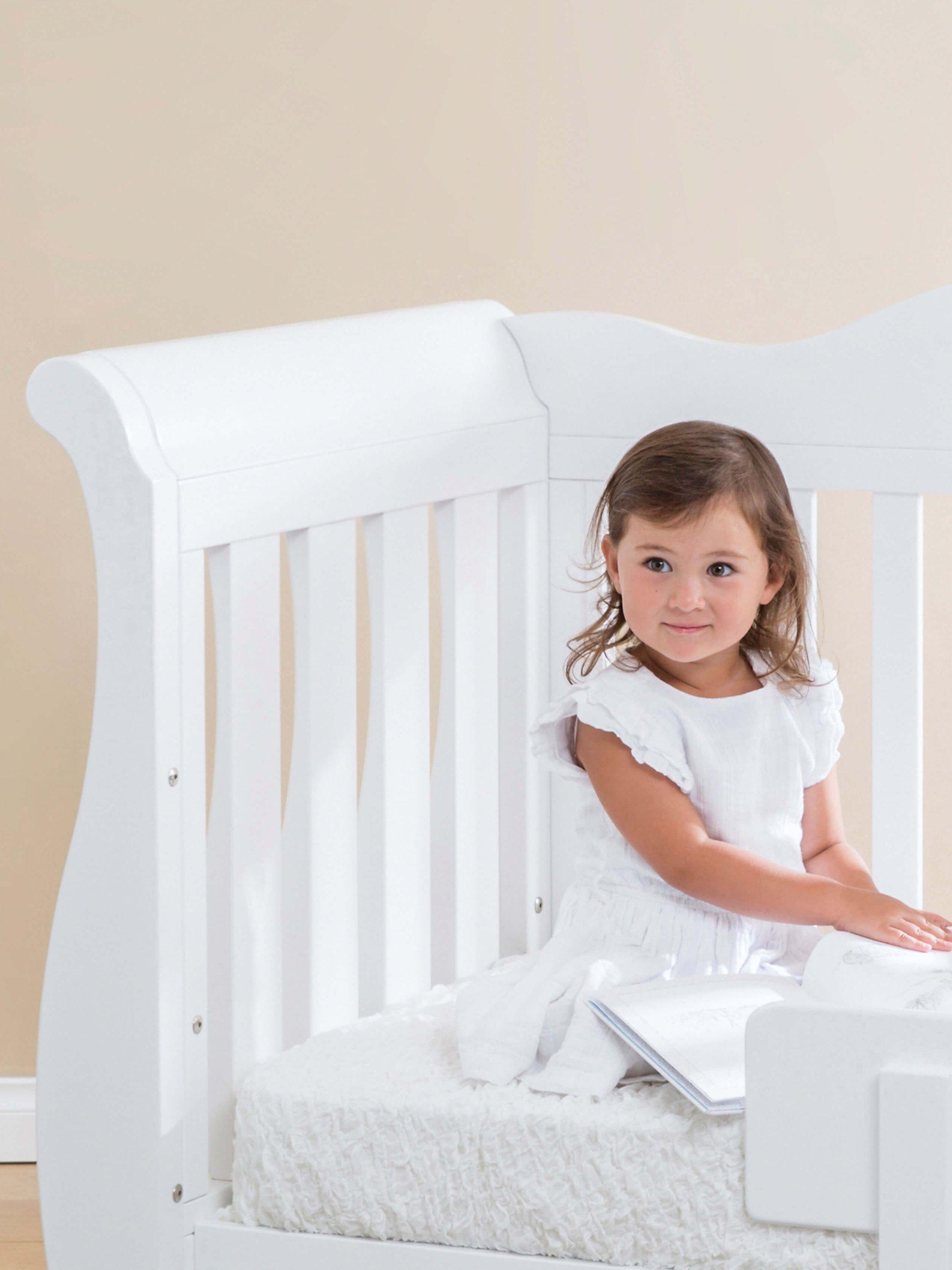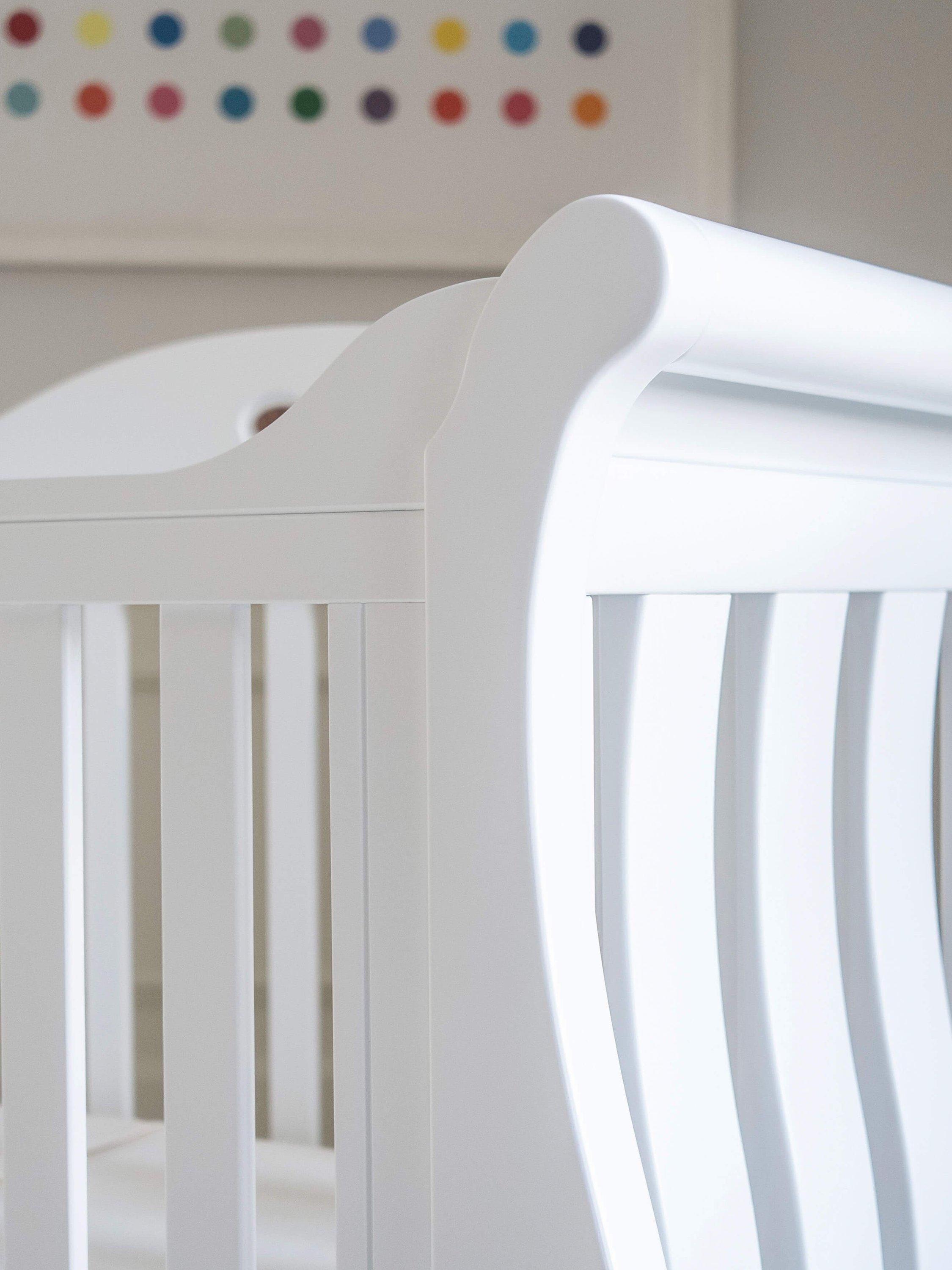 It features a height-adjustable base which means it can evolve with your child's needs. Begin with the higher base level for easy access to your newborn, and as they grow and become more independent, adjust to the lower setting. As your child transitions from the crib, this sleigh cot effortlessly transforms into a cosy toddler bed and subsequently a toddler sofa, ensuring its place in your home for years to come. A Toddler Guard Panel can be added for extra peace of mind.