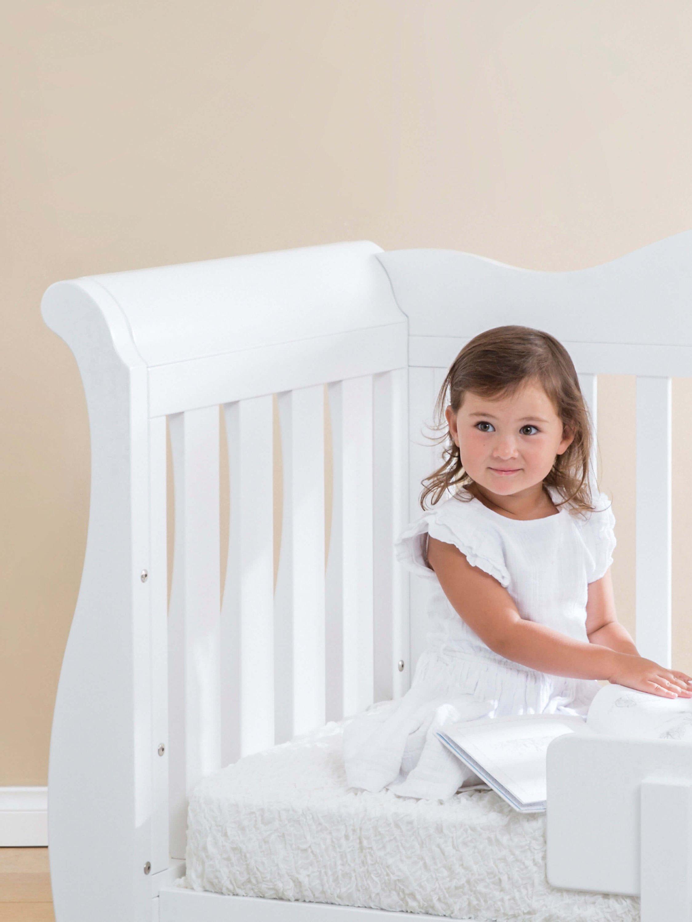 It features a height-adjustable base which means it can evolve with your child's needs. Begin with the higher base level for easy access to your newborn, and as they grow and become more independent, adjust to the lower setting. As your child transitions from the crib, this sleigh cot effortlessly transforms into a cosy toddler bed and subsequently a toddler sofa, ensuring its place in your home for years to come.