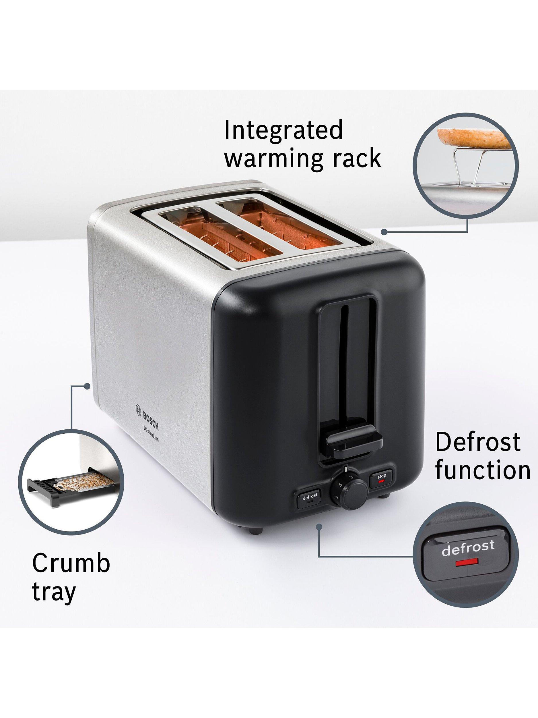 Enjoy the perfect morning with a crispy, evenly toasted toast, high convenience and stylish design. Prepare two slices of crispy toast with the Bosch DesignLine toaster in modern design. But tastes differ. Therefore, the variable browning control in the toasting settings and automatic bread centring ensure perfect toasting results, no matter which bread you prepare.