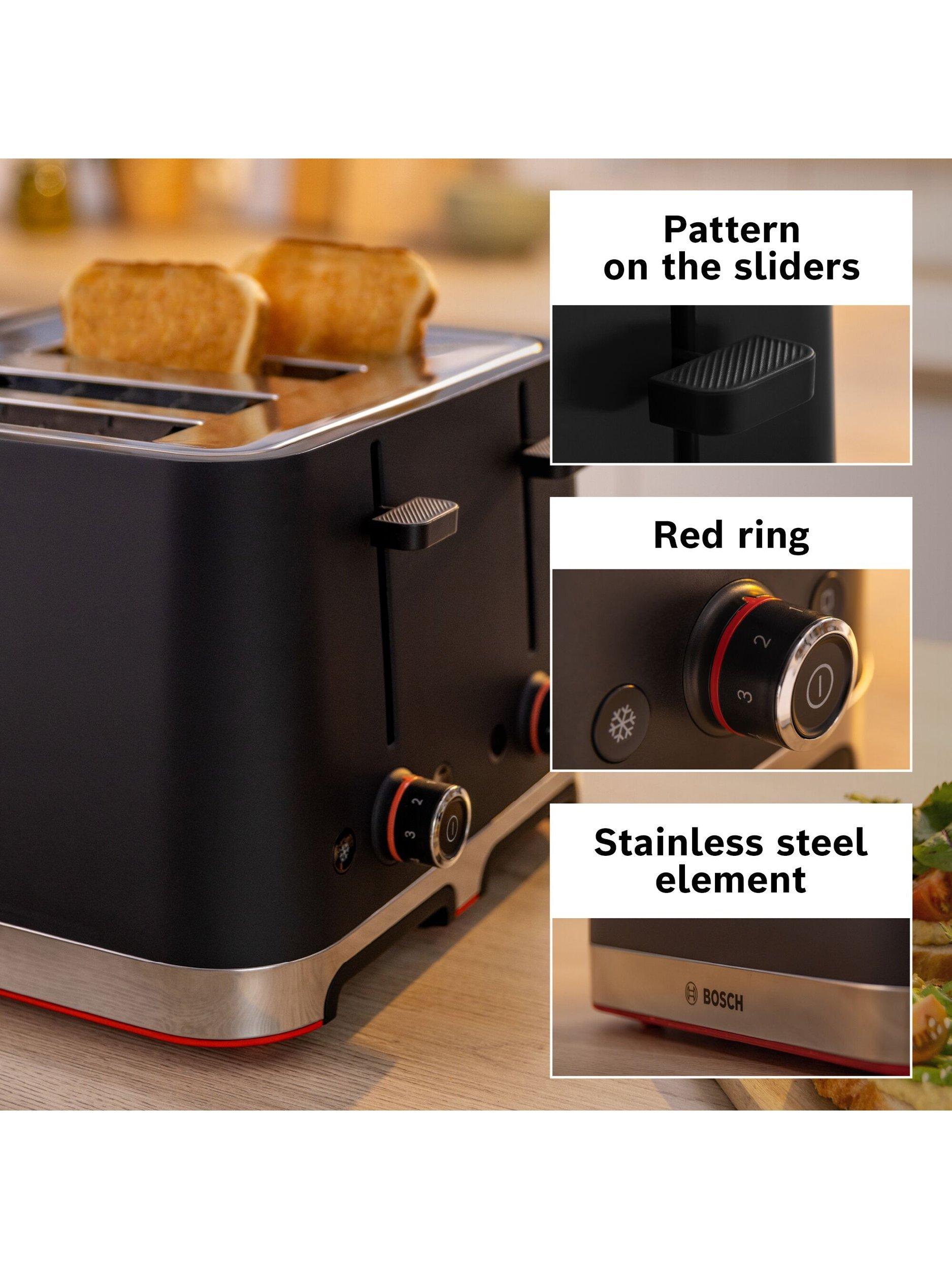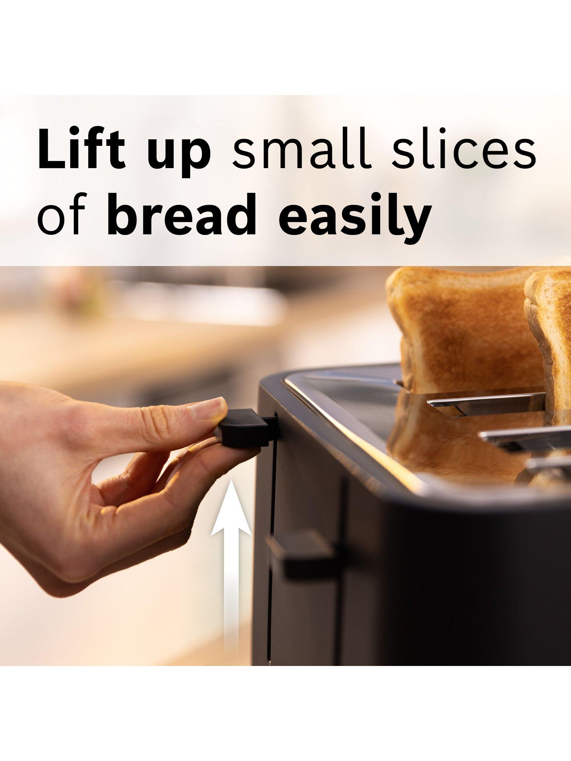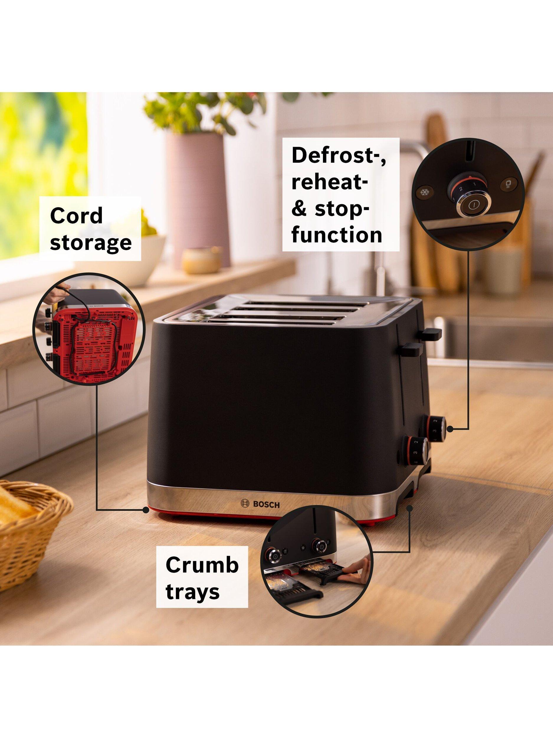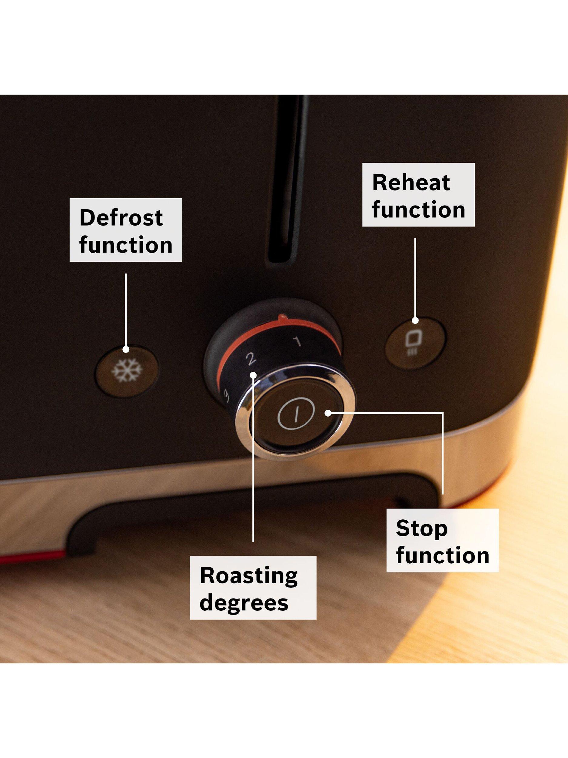 Indulge in deliciously golden toast or scrumptious crumpets with the Bosch MyMoment 4-slice toaster. Combining Bosch quality with a sleek matte finish, this toaster brings a touch of elegance to your kitchen. With 7 browning settings to choose from, as well as handy reheat and defrost functions, you can effortlessly create toast that suits everyone's taste. Plus, the automatic bread centring feature ensures perfectly even toasting every time. Conveniently located at the front, all controls and the crumb tray are easily accessible.