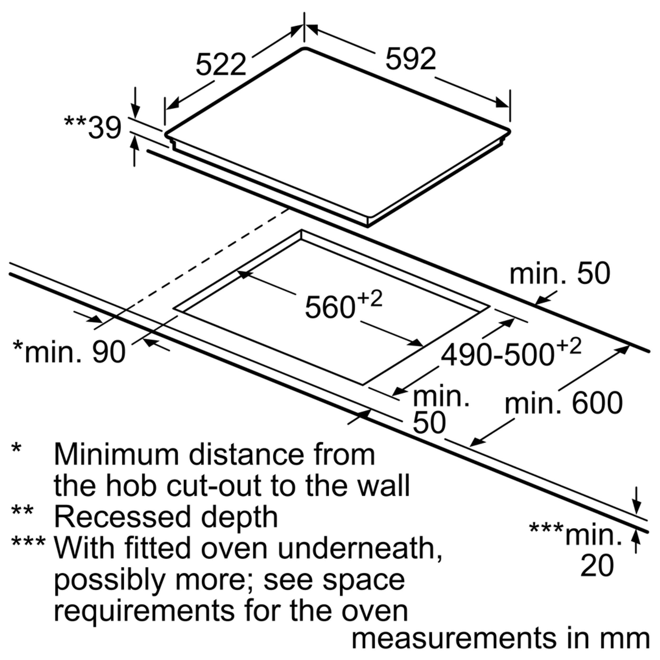 Please note: there should be a minimum height clearance of 65cm between an electric hob and the cooker hood above it.