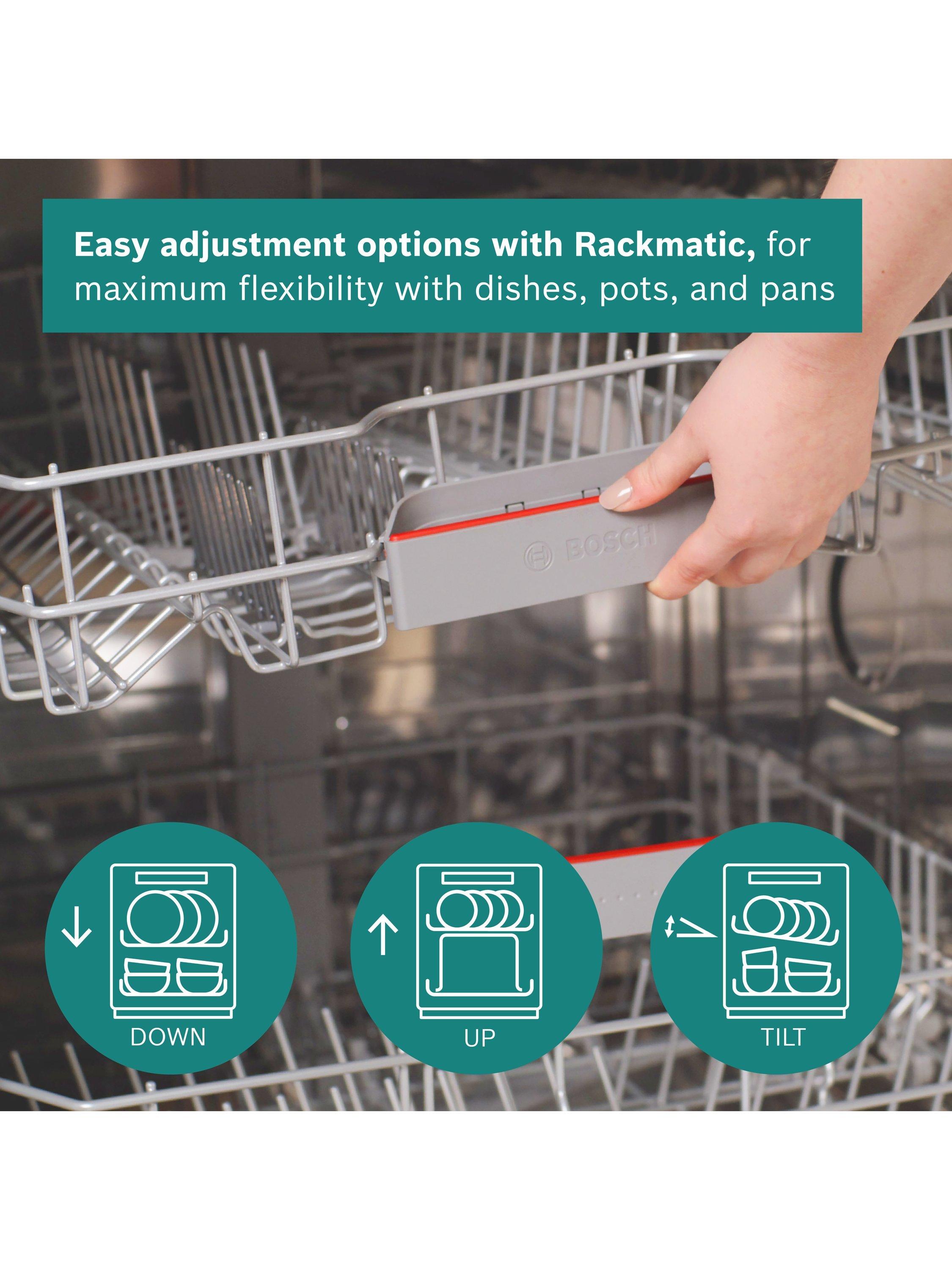 Thanks to the triple Rackmatic system, the height of the top basket can easily be adjusted by up to 5cm, or tilted to just one side so you can fit in large pots and tall stem wine glasses, and still fit your large dinner plates on the bottom rack. And you can do this when its fully loaded, giving you more adjustment options and maximum flexibility.
