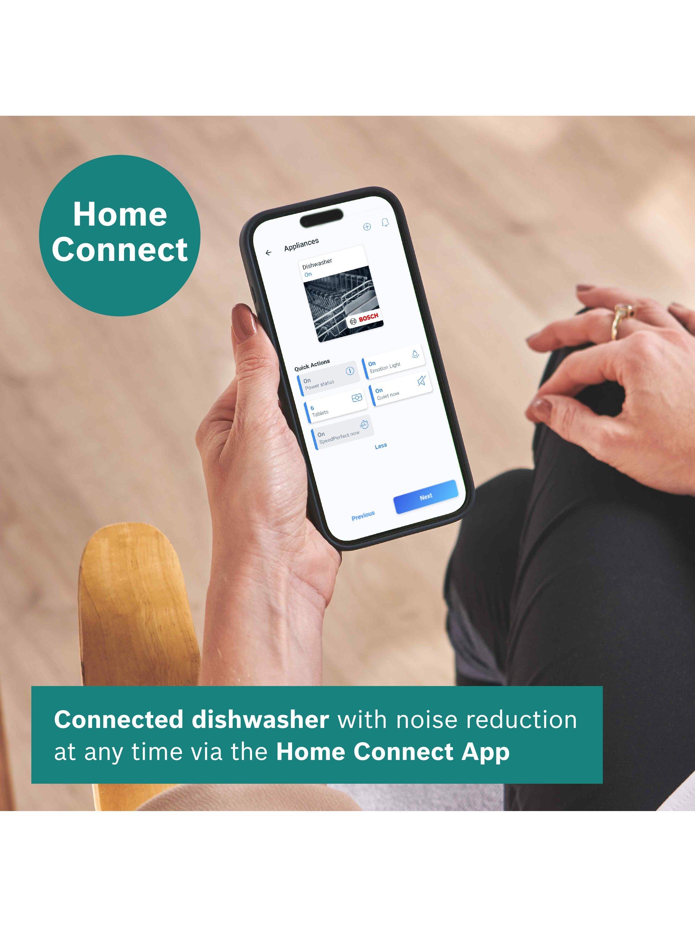 Bosch Home Connect app: an easy solution to help you get the most out of your appliance, with flexible control and additional features. Unlock a world of washing options with Program Download. Add up to 10 specialised programs to your dishwasher, offering solutions for everything from heavily used cookware to delicate glassware. Enjoy quieter cycles for open kitchens and easily monitor your water and energy usage.