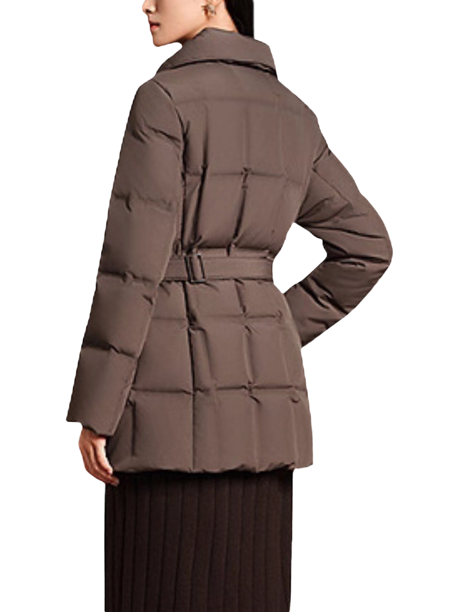 This belted down jacket offers lightweight warmth and refined elegance with its softly lustrous fabric and 700+ fill premium goose down. Its seamless direct-fill construction provides consistent insulation without bulk, while the cinched-waist silhouette creates a flattering, feminine shape. Designed for both commutes and gatherings, it brings effortless sophistication to every winter setting.