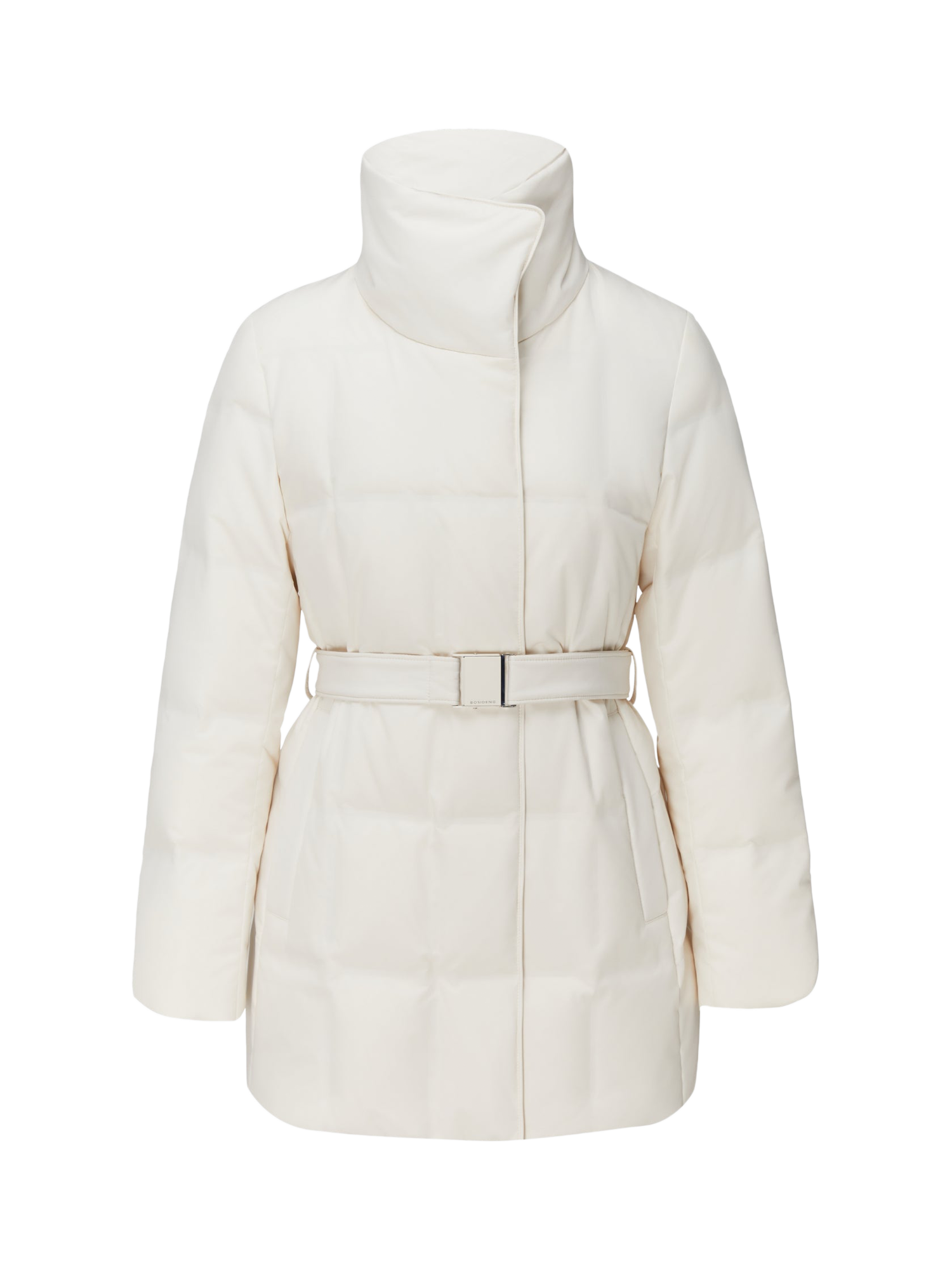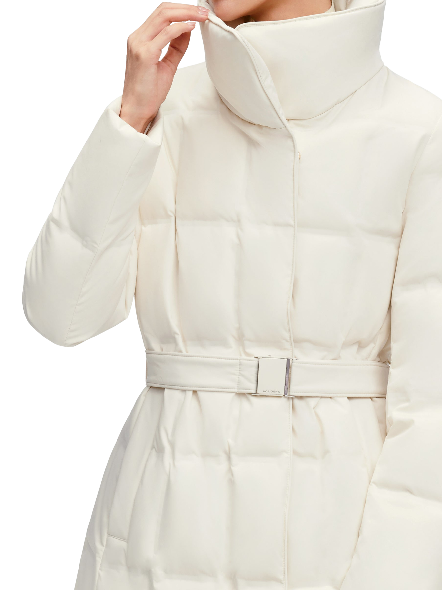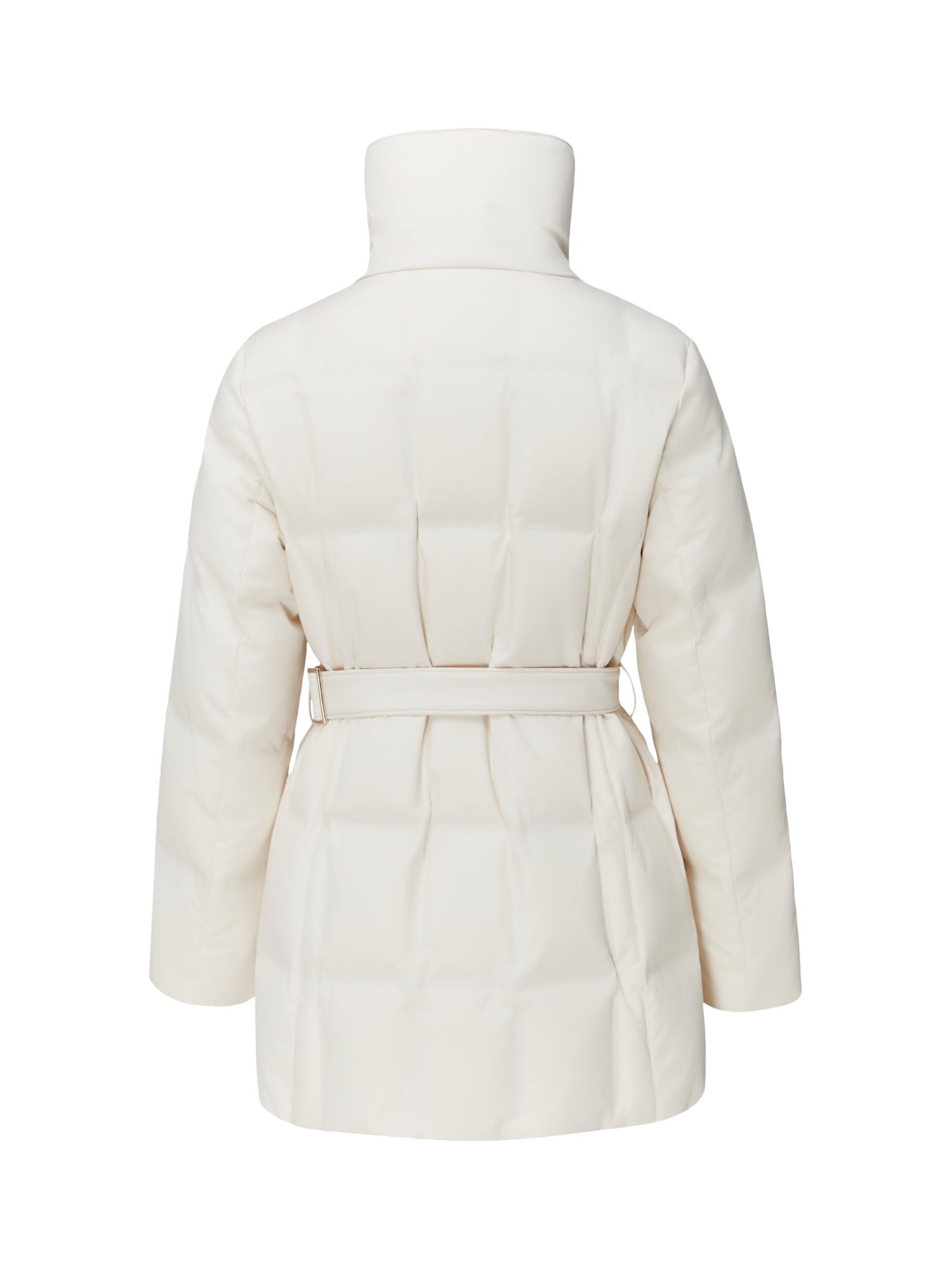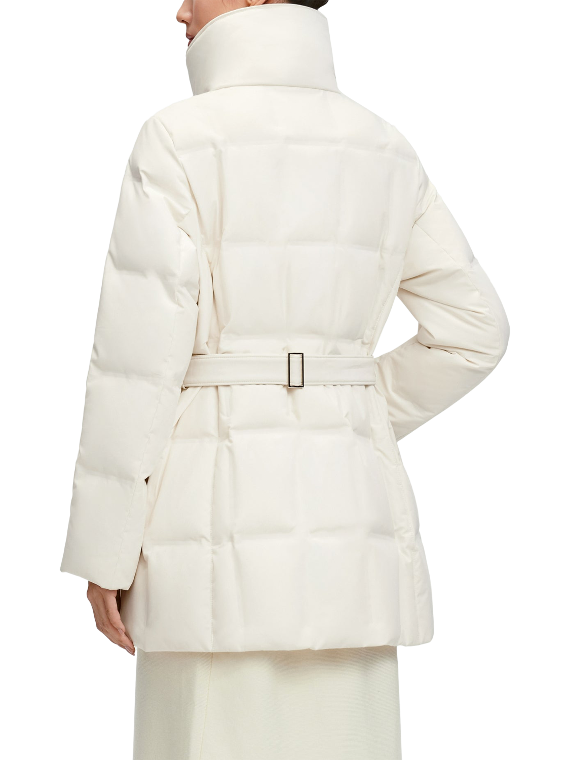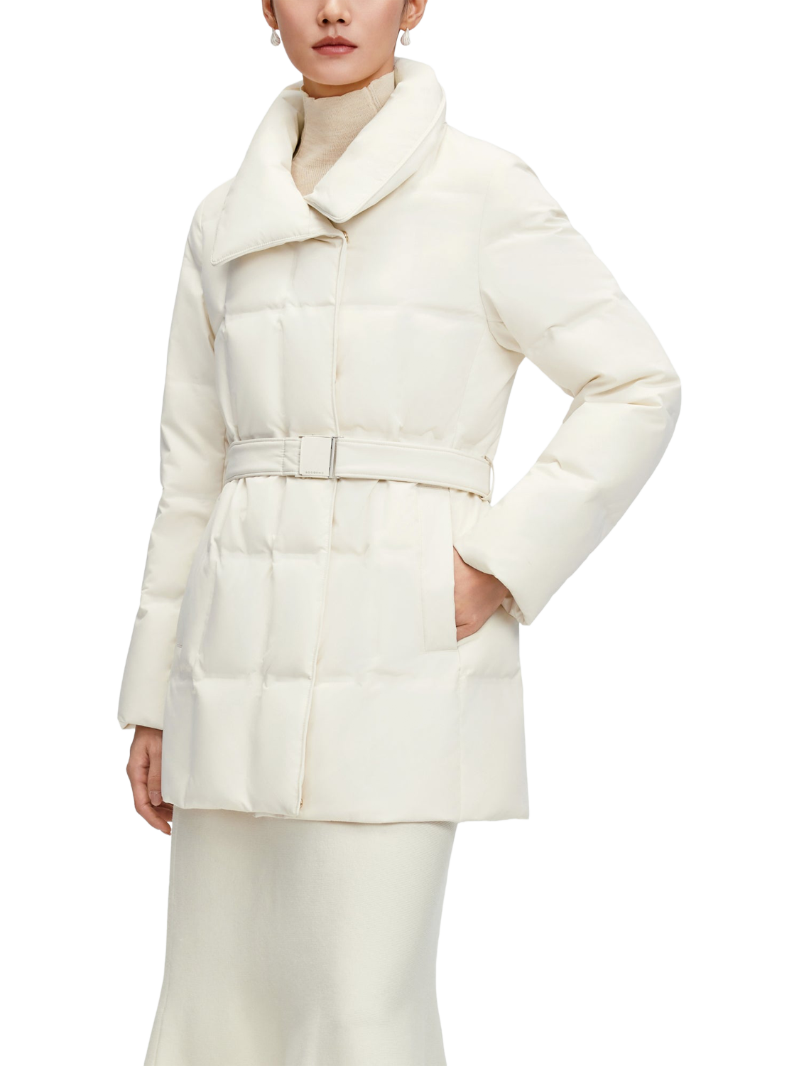 This belted down jacket offers lightweight warmth and refined elegance with its softly lustrous fabric and 700+ fill premium goose down. Its seamless direct-fill construction provides consistent insulation without bulk, while the cinched-waist silhouette creates a flattering, feminine shape. Designed for both commutes and gatherings, it brings effortless sophistication to every winter setting.