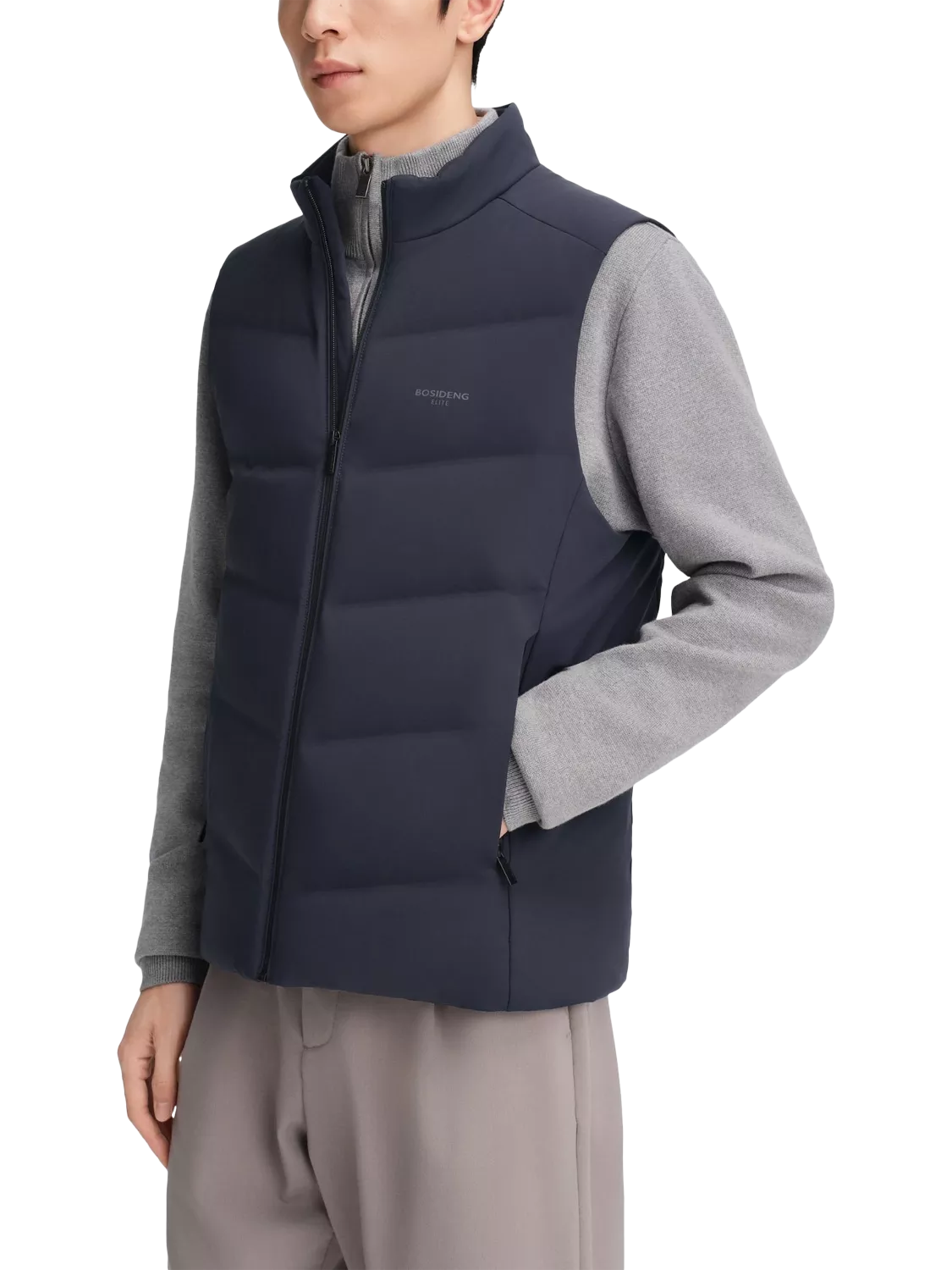 A smart choice for business meetings yet relaxed enough for daily wear, this gilet is defined by its sleek, seamless silhouette and clean stand collar. Crafted from fine mini-grid textured fabric, it feels soft and skin-friendly while offering lasting comfort. Premium 700+ fill power goose down with 90% pure content delivers exceptional warmth without bulk, enhanced by a brushed fabric detail at the back collar for added coziness and easy care. With its shorter length and classic fit, it transitions effortlessly from polished business looks to everyday layering.