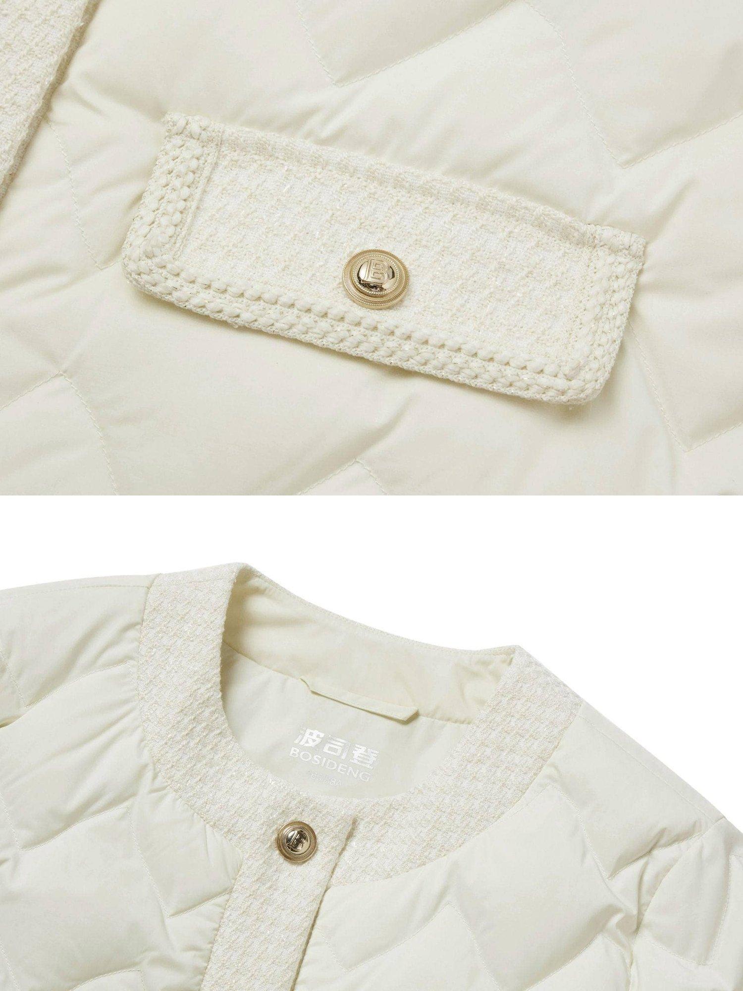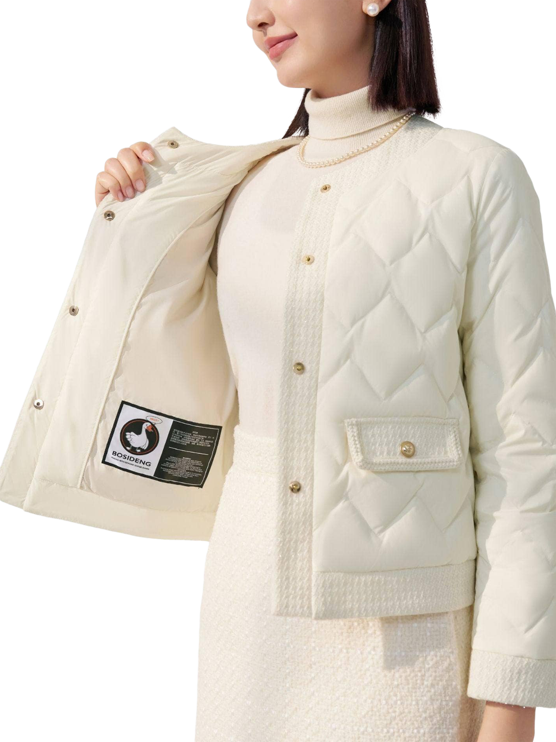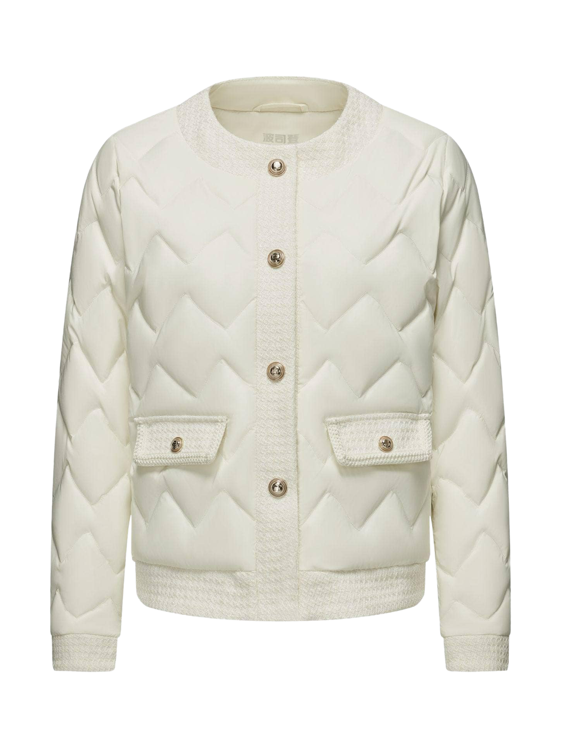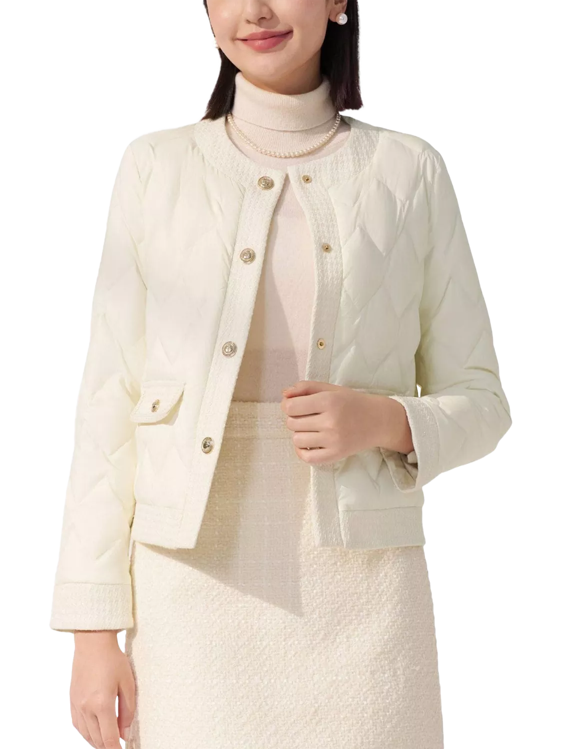 Featuring a chic, slightly loose silhouette and a classic round neckline, this jacket blends luxurious houndstooth tweed with subtle metallic accents for timeless sophistication. Filled with 700+ fill power premium goose down, it offers ultra-light warmth and comfort, enhanced by refined quilting and exclusive custom-made buttons.