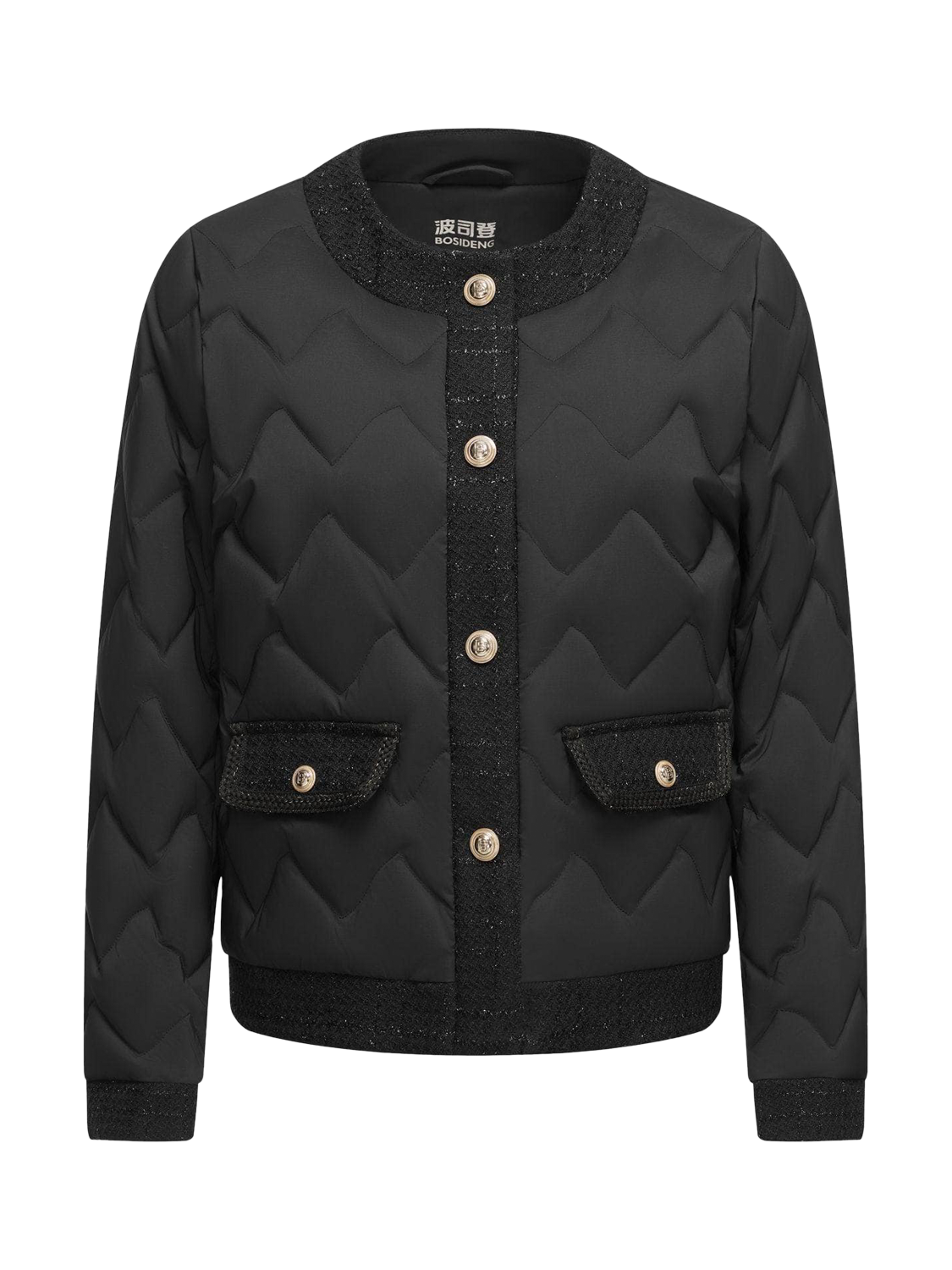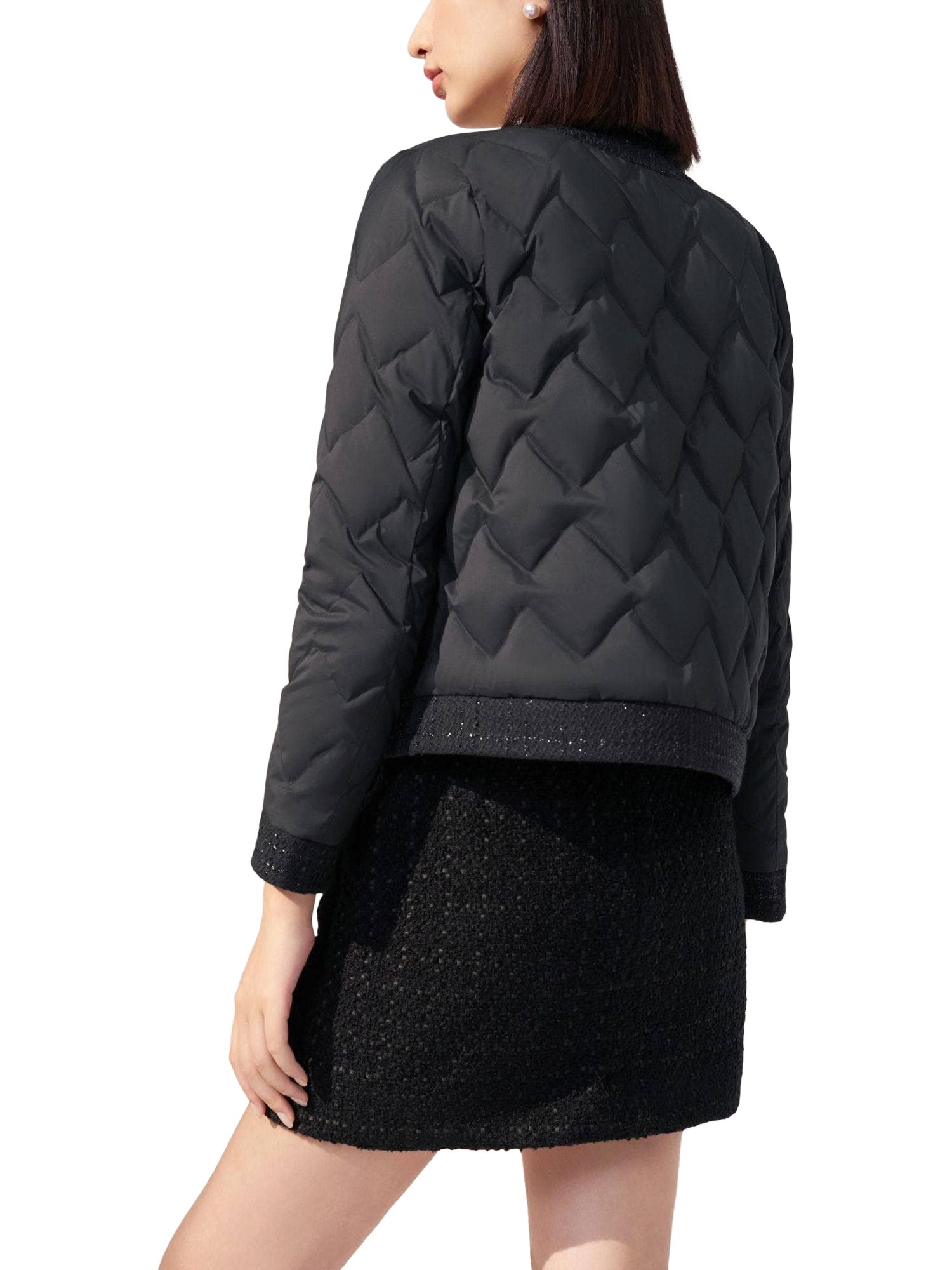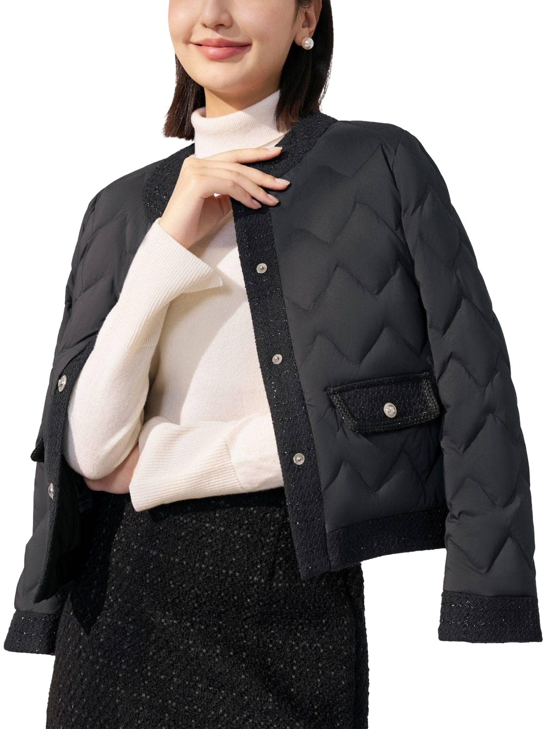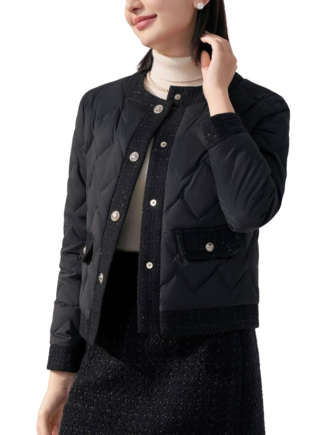 Featuring a chic, slightly loose silhouette and a classic round neckline, this jacket blends luxurious houndstooth tweed with subtle metallic accents for timeless sophistication. Filled with 700+ fill power premium goose down, it offers ultra-light warmth and comfort, enhanced by refined quilting and exclusive custom-made buttons.