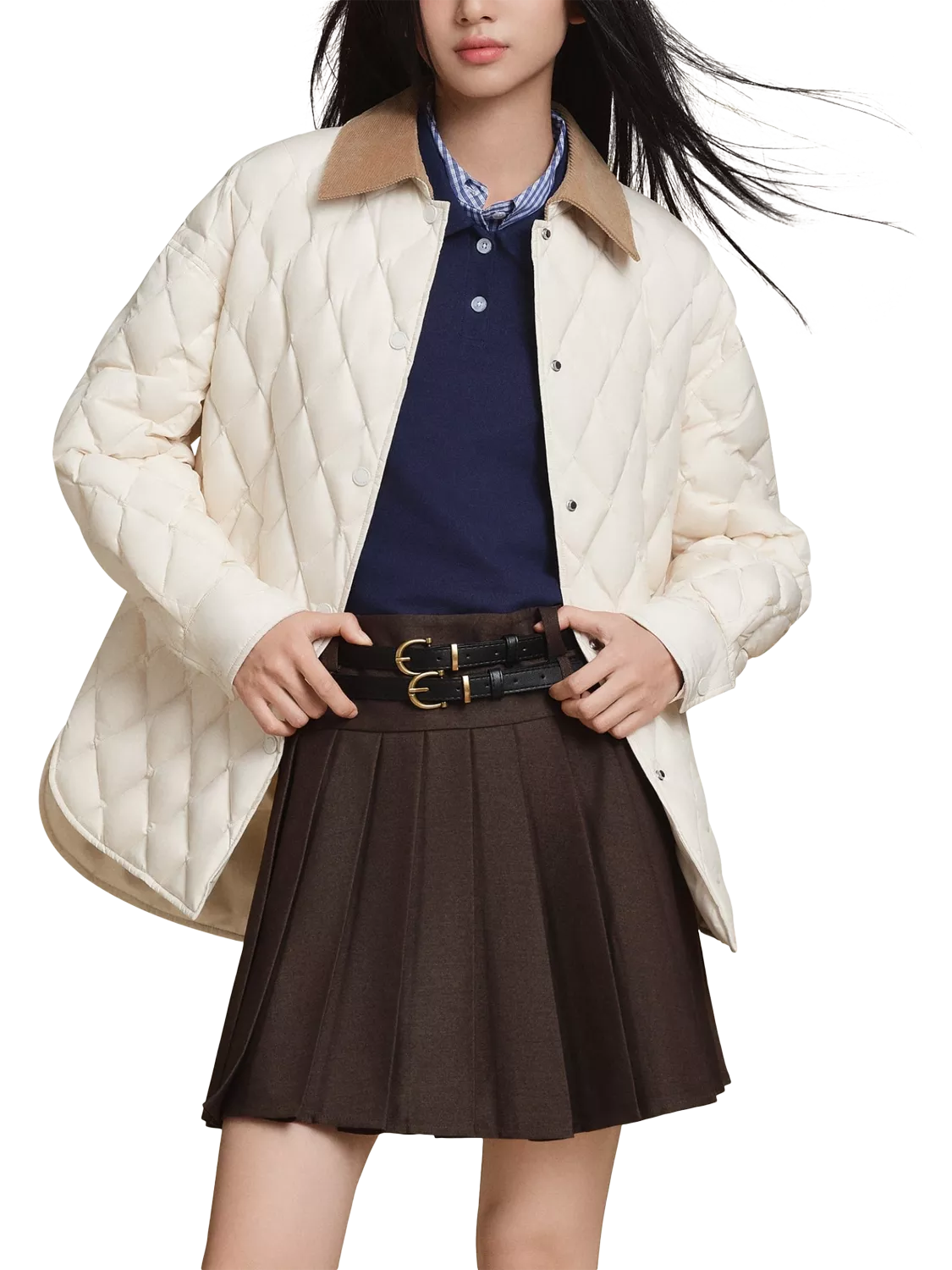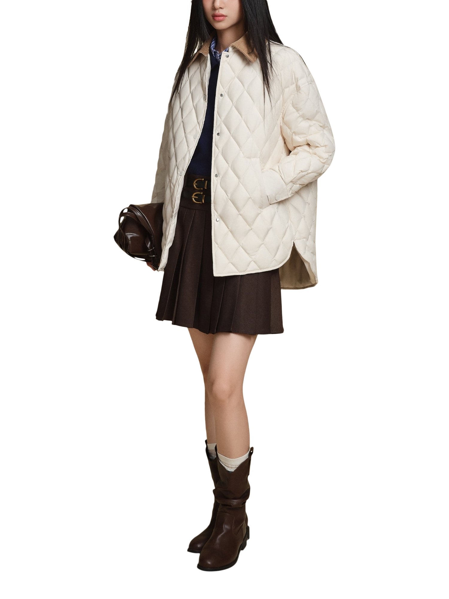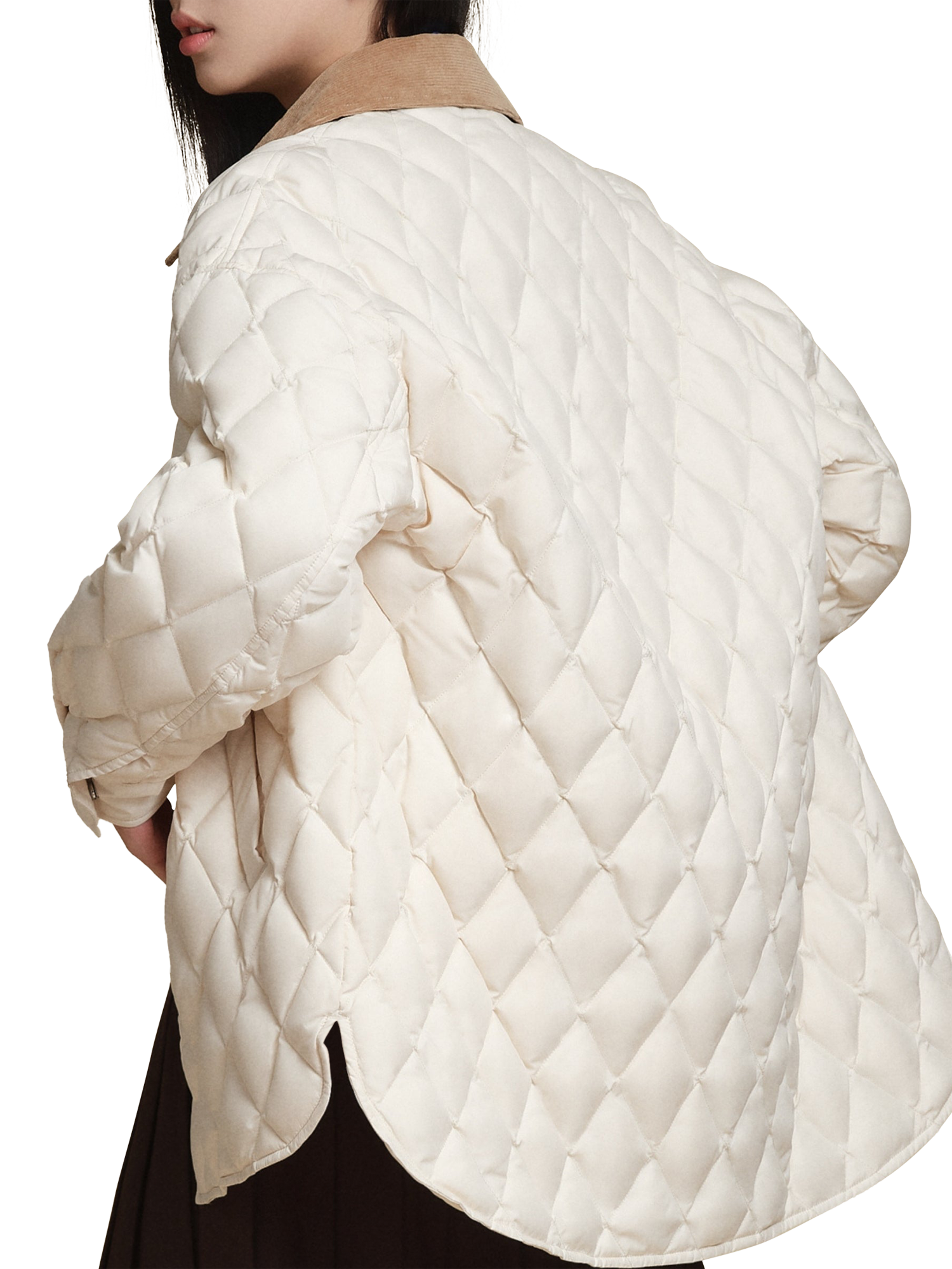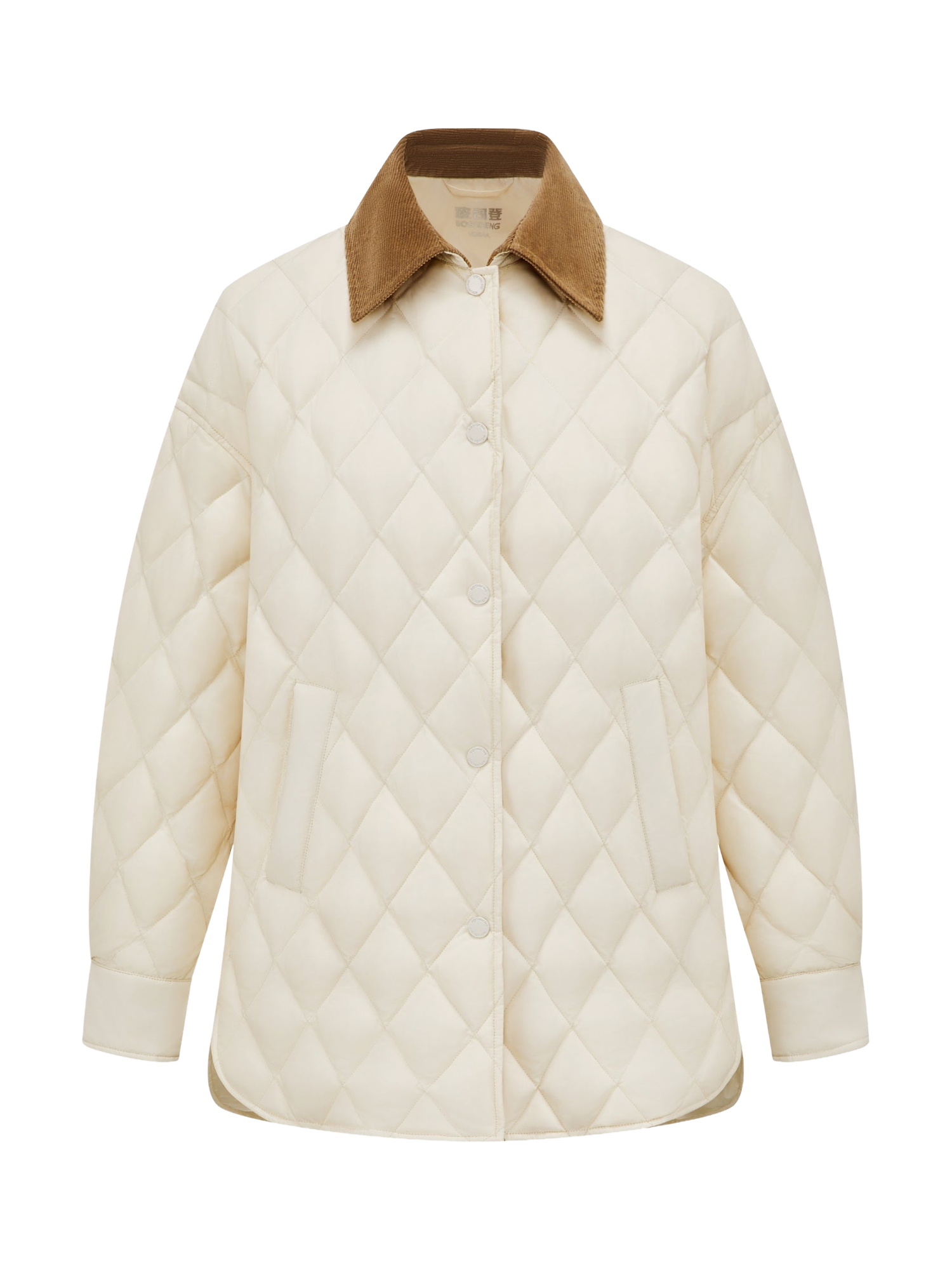 This relaxed quilted jacket blends countryside charm with urban flair, perfect for strolls or city weekends. Crafted from glossy tech yarn, it features a soft corduroy collar for a refined contrast. The diamond quilting adds structure, while the slightly oversized fit offers easy layering.