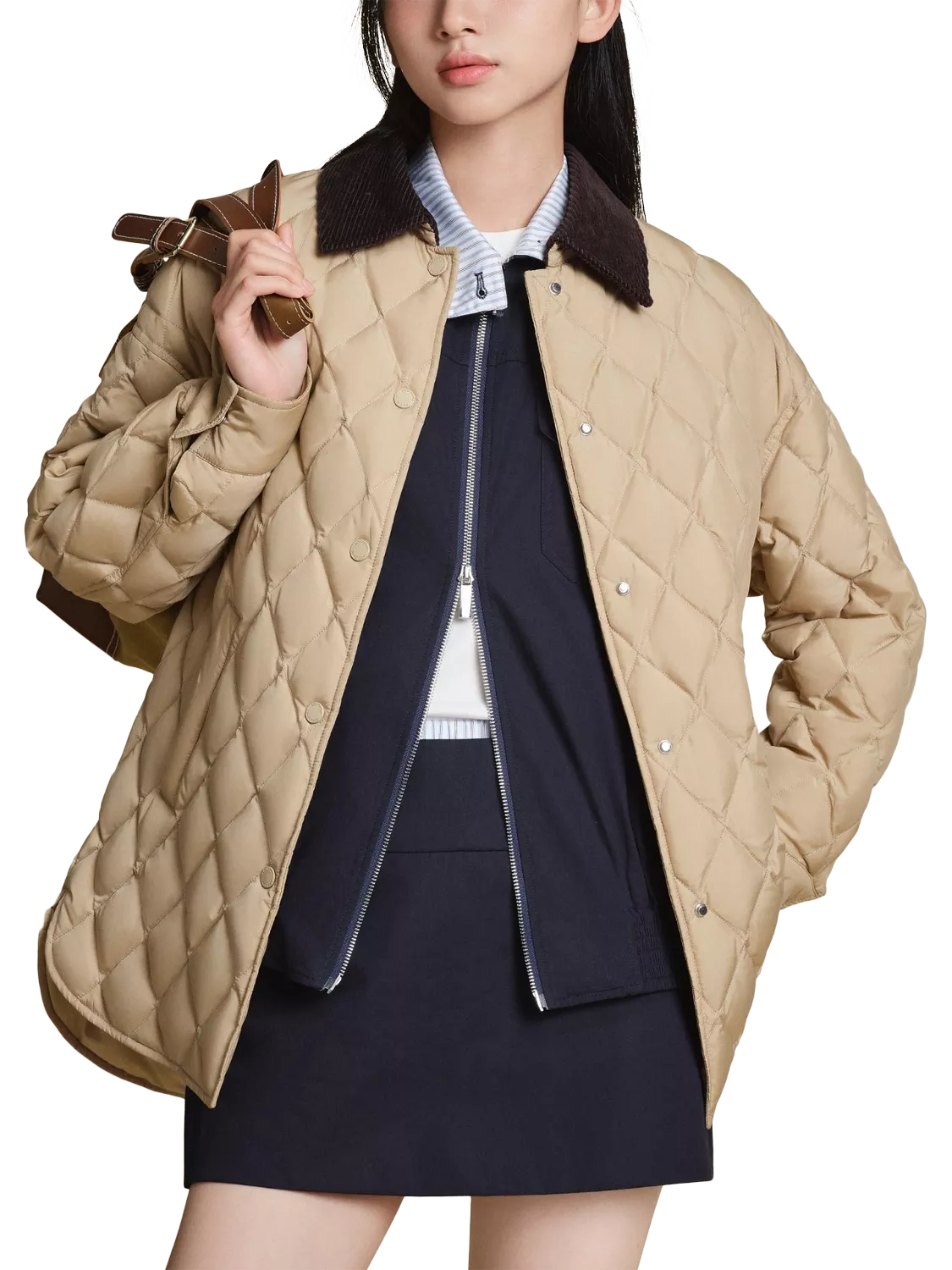 This relaxed quilted jacket blends countryside charm with urban flair, perfect for strolls or city weekends. Crafted from glossy tech yarn, it features a soft corduroy collar for a refined contrast. The diamond quilting adds structure, while the slightly oversized fit offers easy layering.