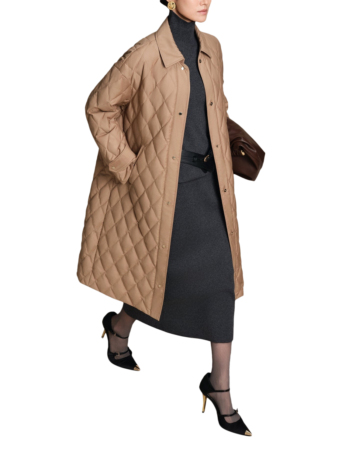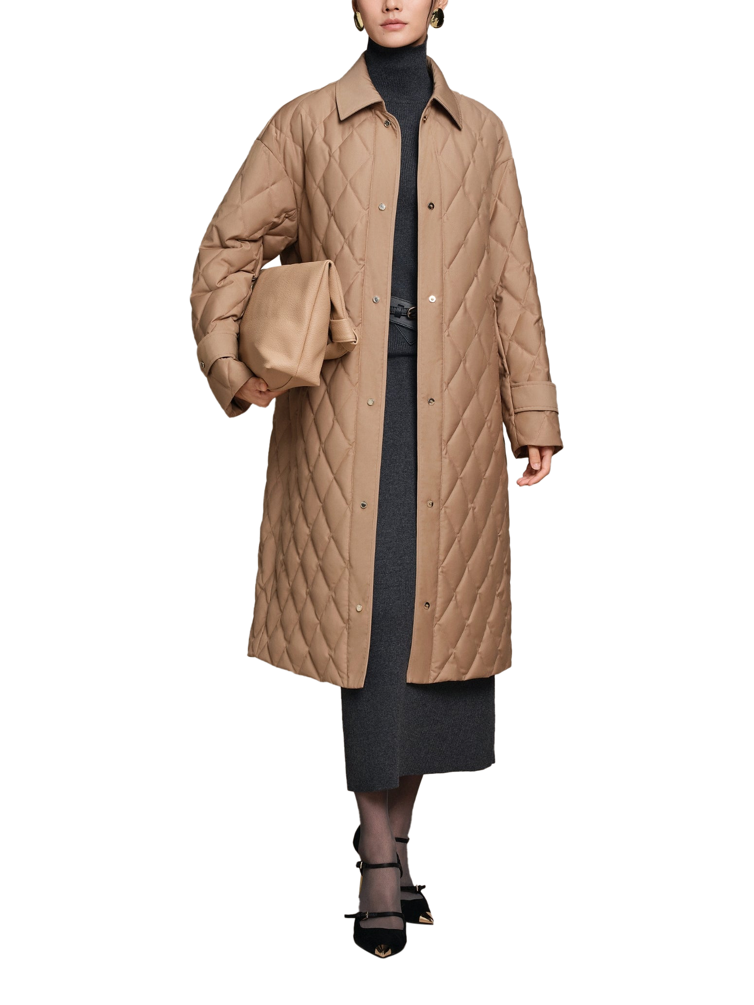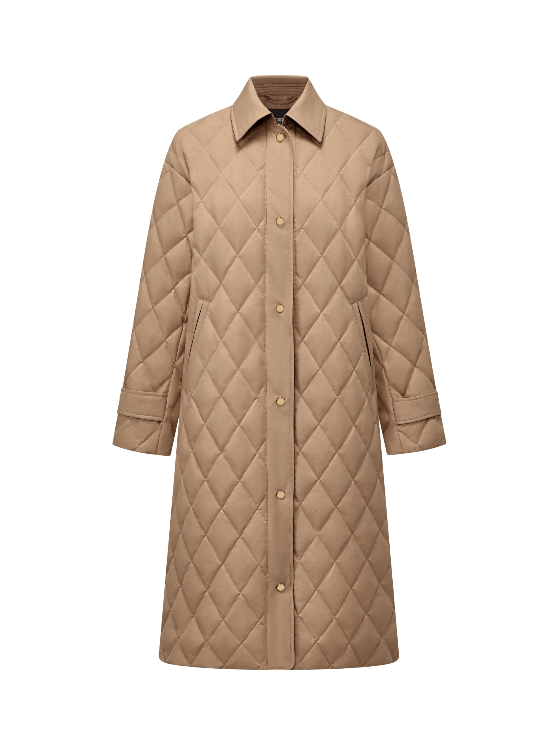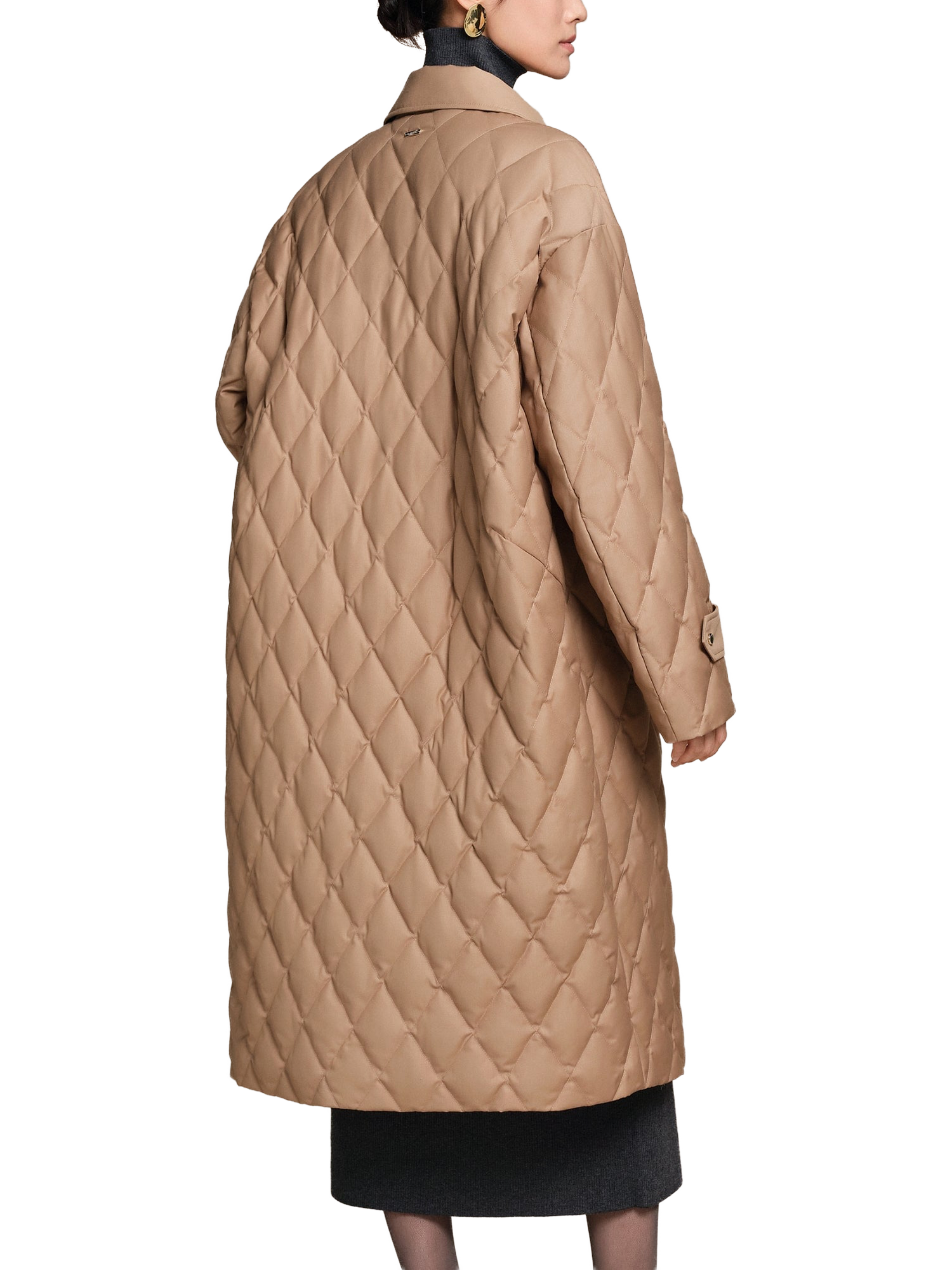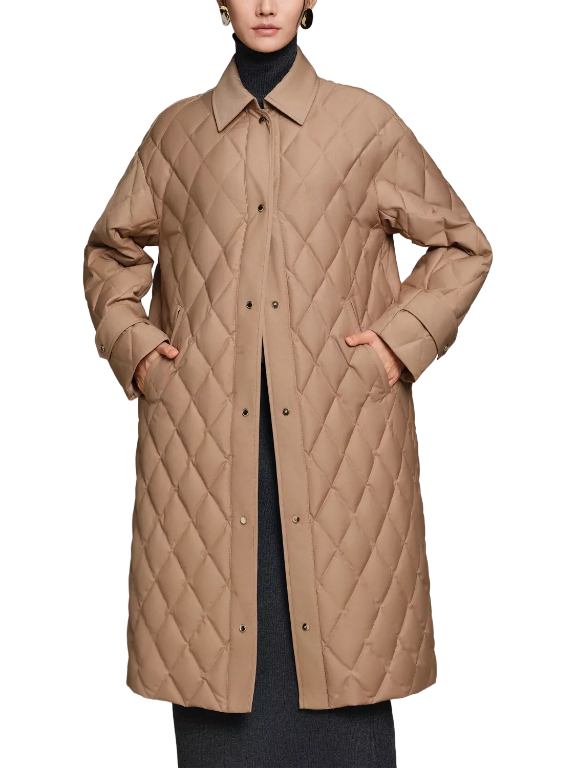 Stay warm and refined in this full-length jacket, crafted from silky quilted fabric and filled with 700+ premium goose down. Featuring a shirt collar and clean, flattering silhouette, it’s ideal for winter walks or evening outings. Thoughtful details like custom-made buttons complete the timeless design.