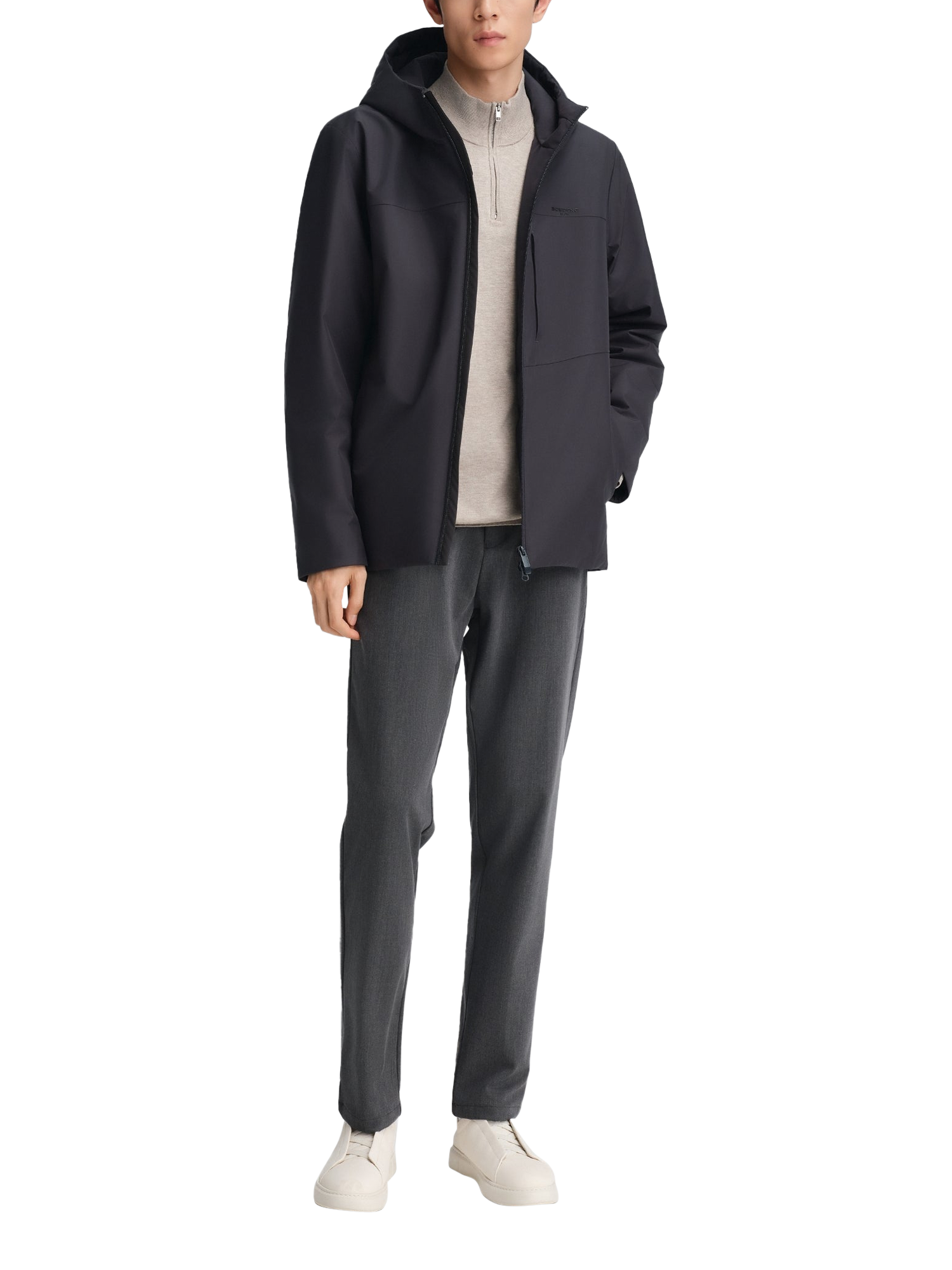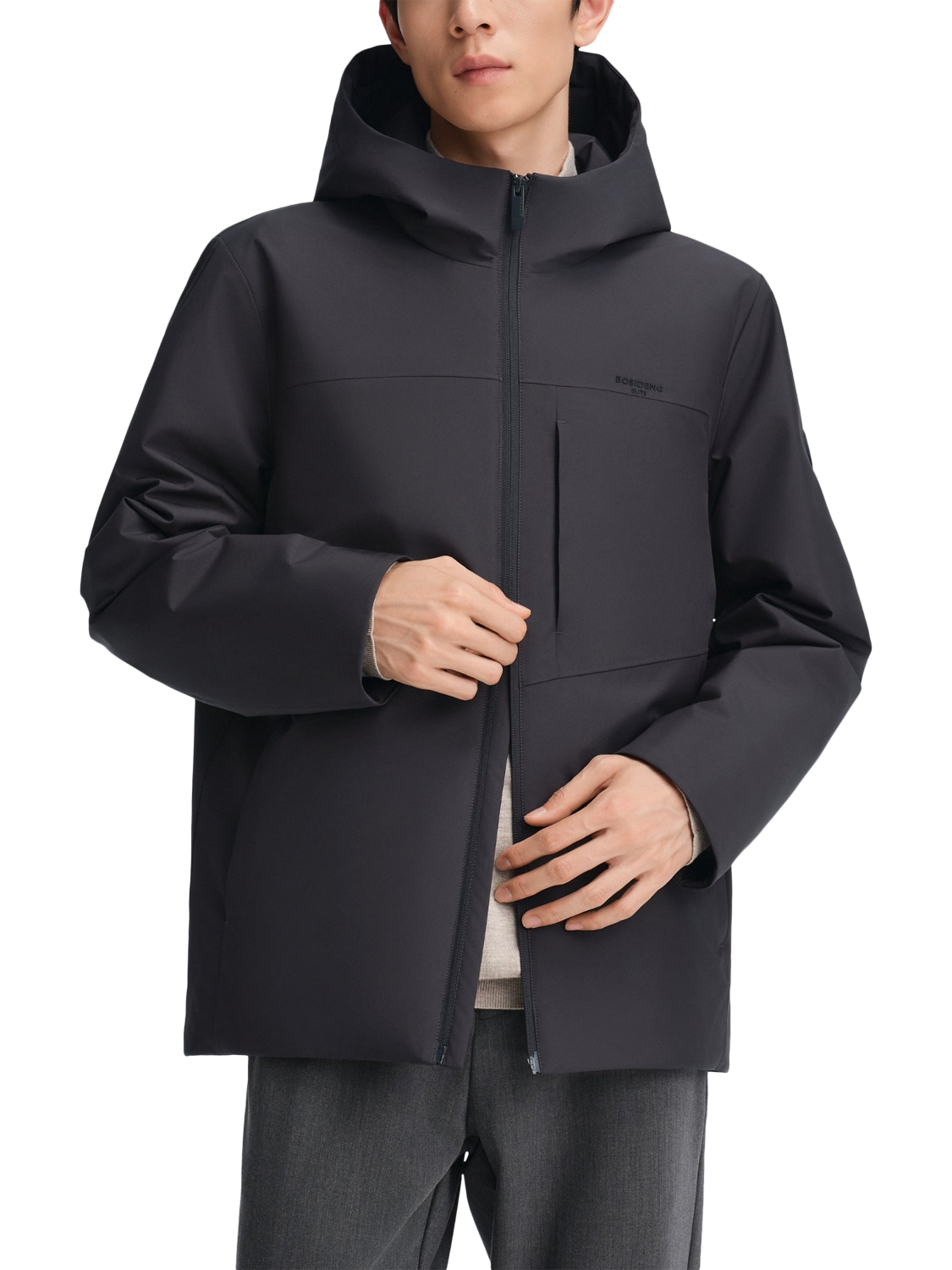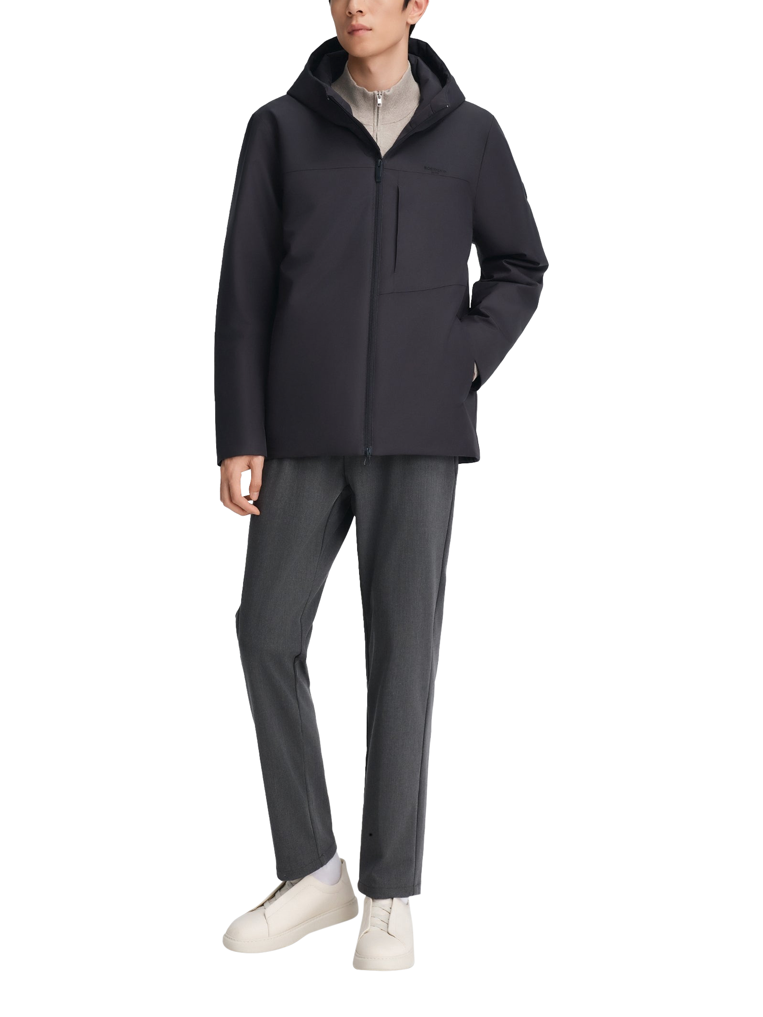 This short jacket blends refined business style with lasting warmth, thanks to premium goose down and German-engineered insulation. The structured, water-repellent fabric offers a subtle sheen and a high-quality feel. Designed with a clean hooded silhouette, it’s ideal for on-the-go comfort from morning to evening.