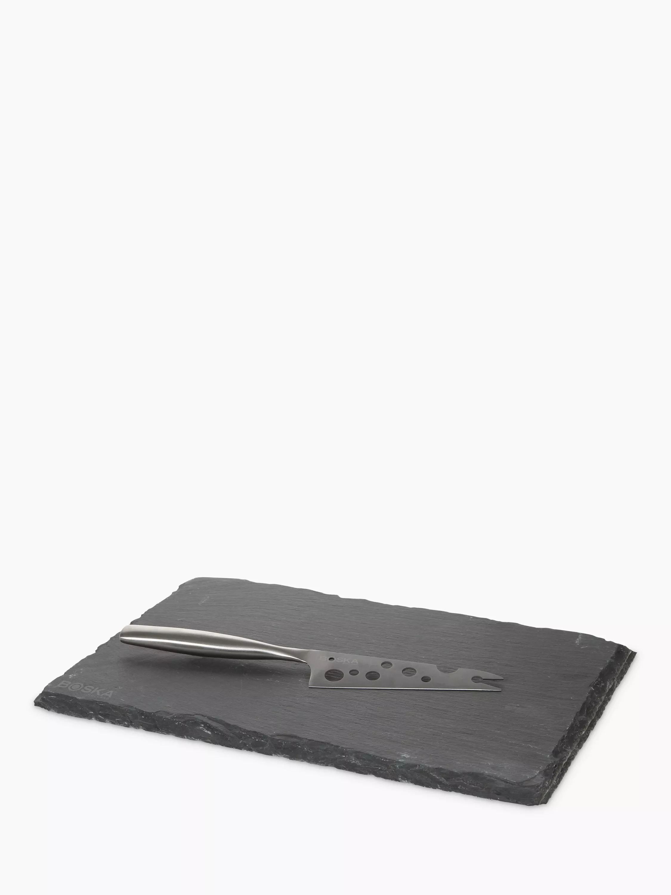 This beautiful, practical set includes a large slate cheese board and a stylish stainless steel cheese knife. The knife is best suited for use with soft to semi-hard cheese. It has holes in the blade to ensure that cheese does not stick to it.