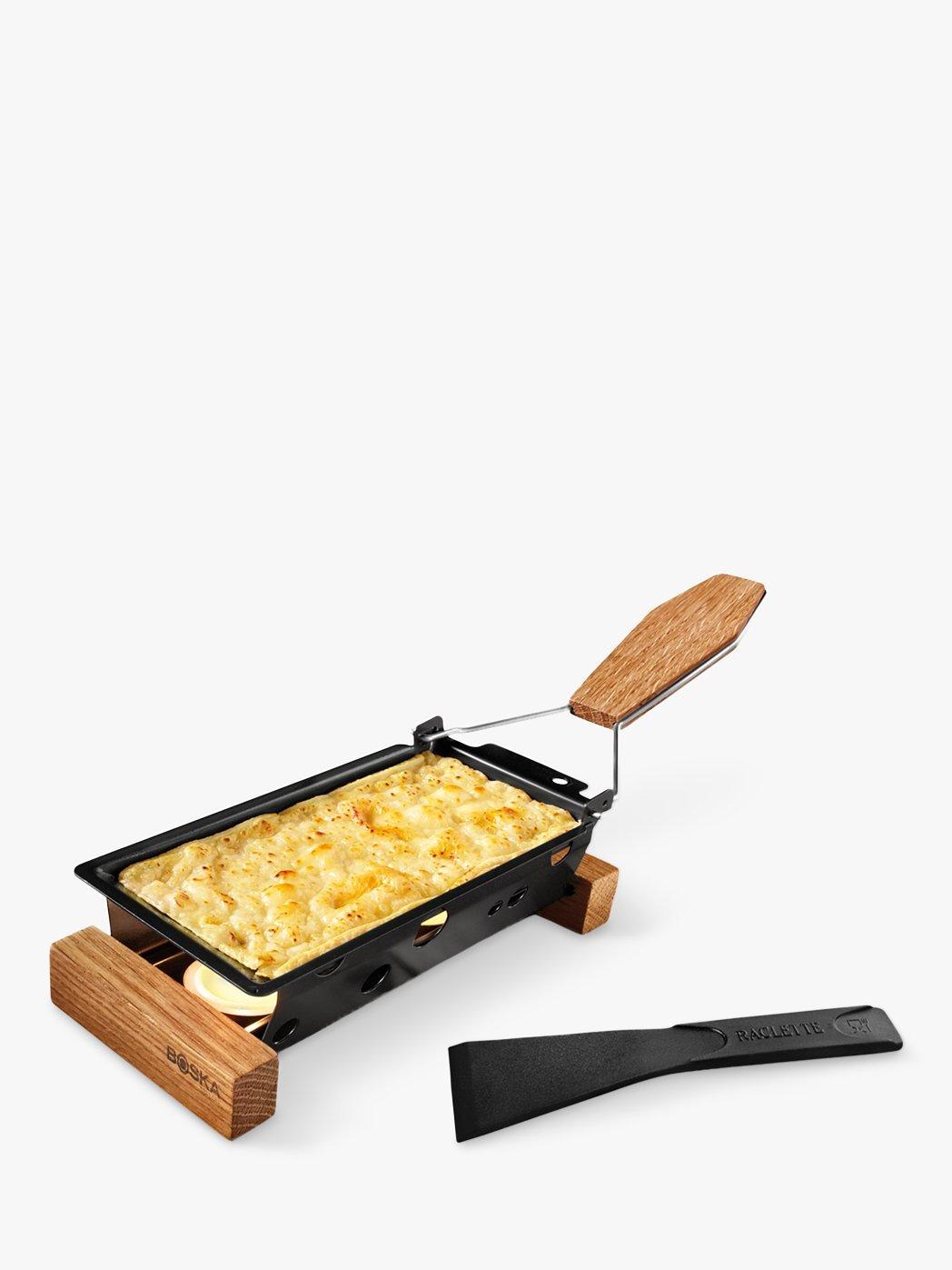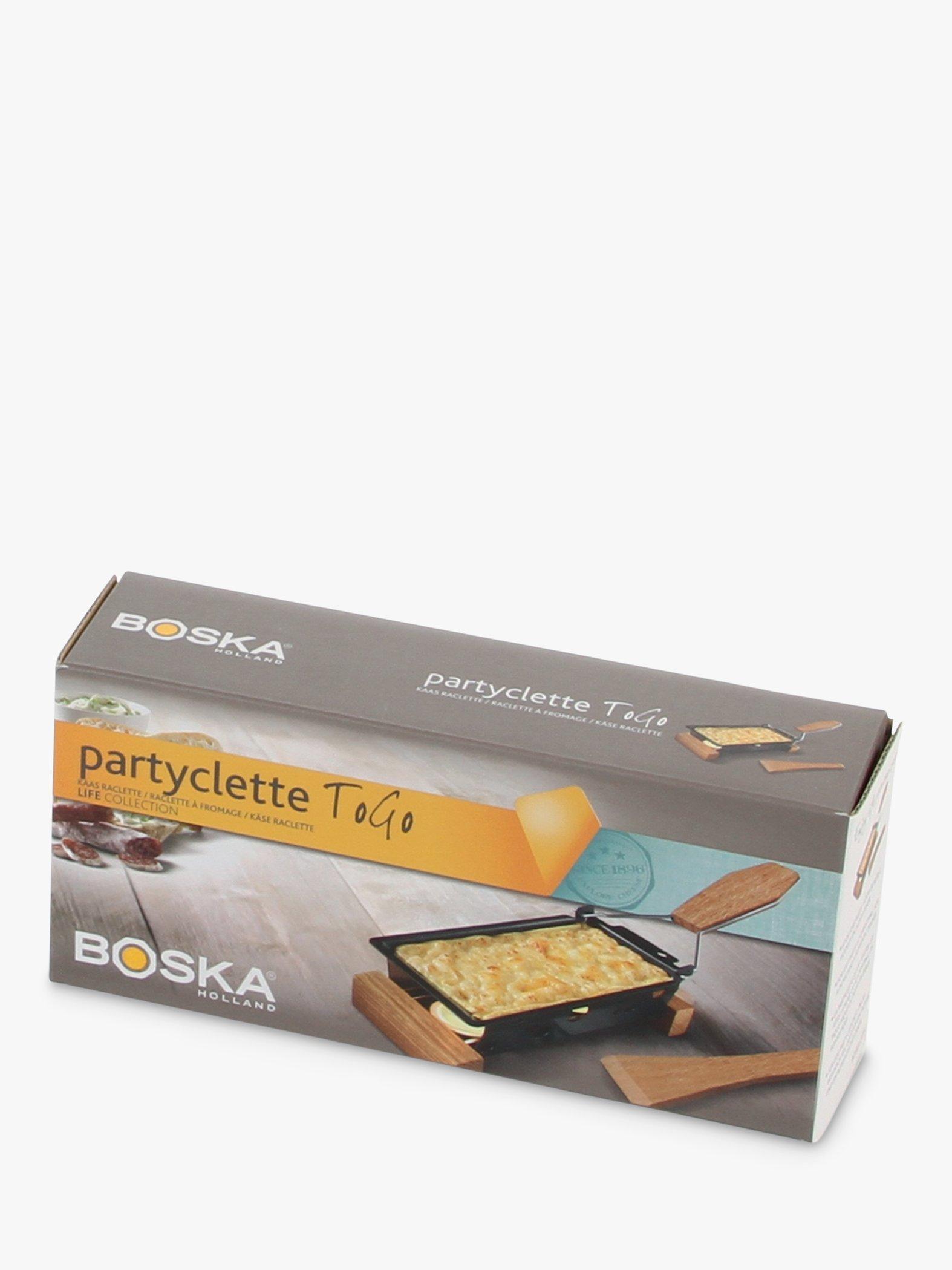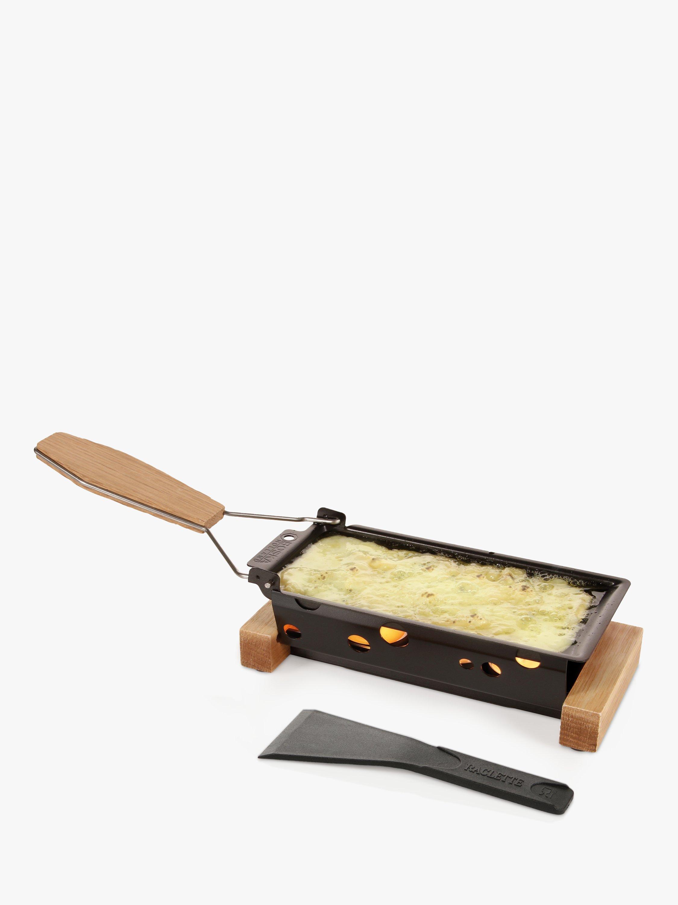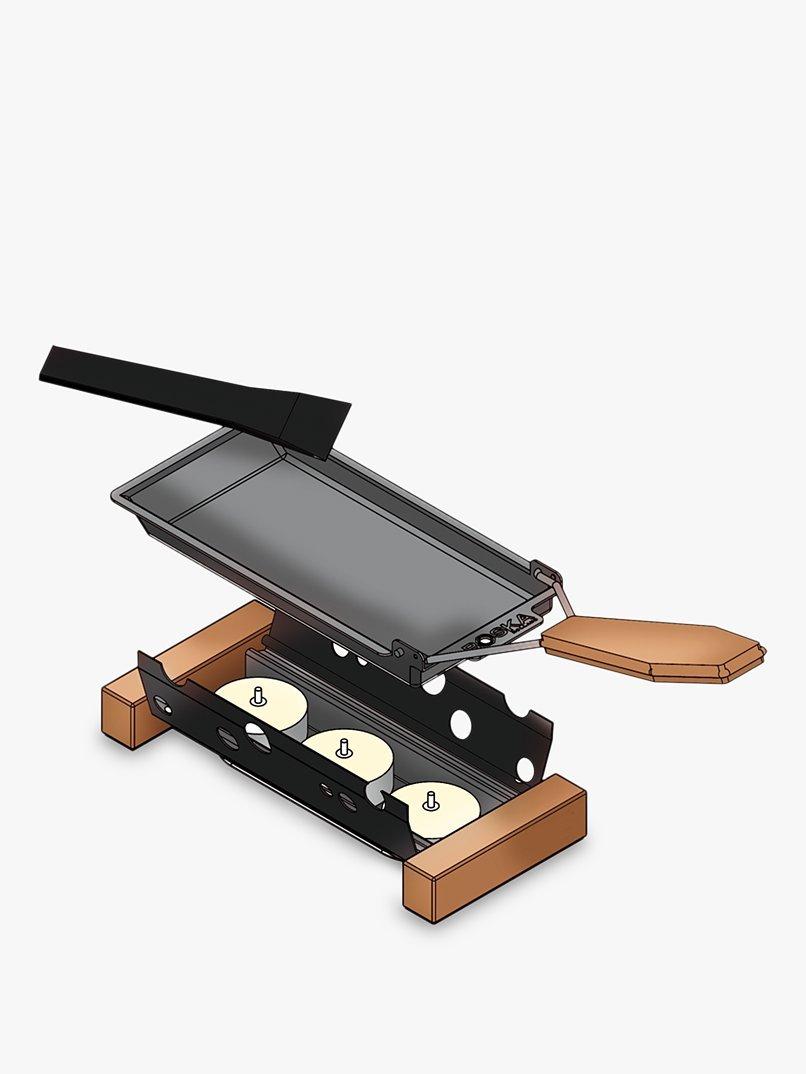 The Partyclette makes it possible to have a raclette party anywhere, anytime you wish. With a sturdy dark wooden frame, a barbeclette, three tea lights and a special spatula for serving and scraping your melted cheese onto baguette slices or toast.