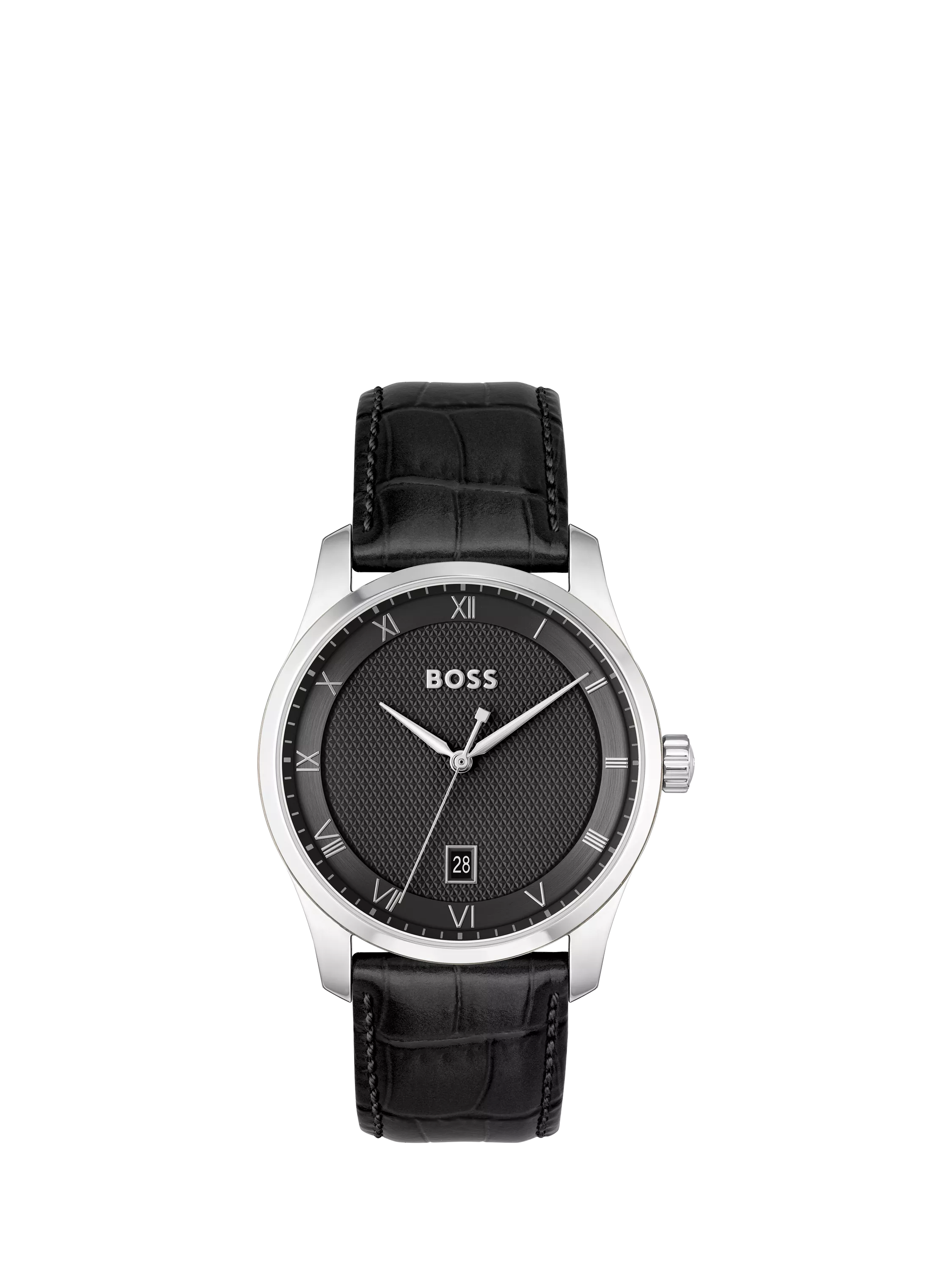 BOSS Gents watch from the Principle family. Featuring a 41mm stainless steel case, black dial and black leather strap. Water-resistant to 3ATM.