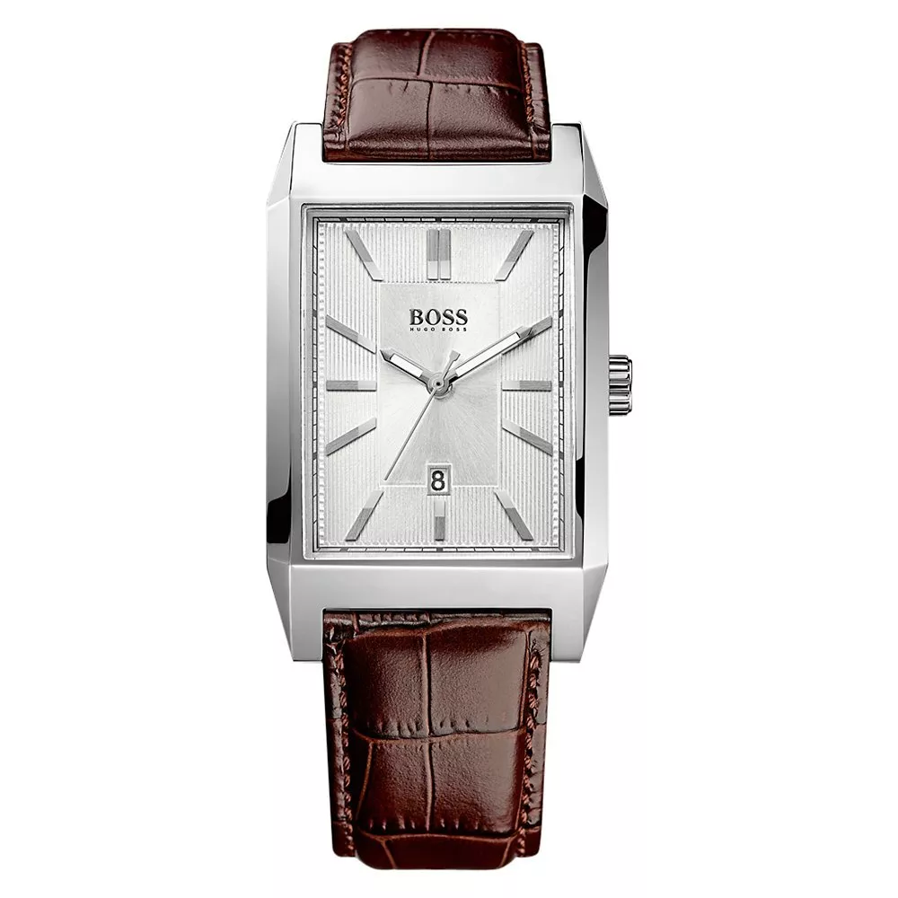 A sophisticated men's dress watch from Hugo Boss. The rectangular stainless steel case keeps the design slim and practical, featuring a multi-textured dial set with a date display and polished baton hour markers.