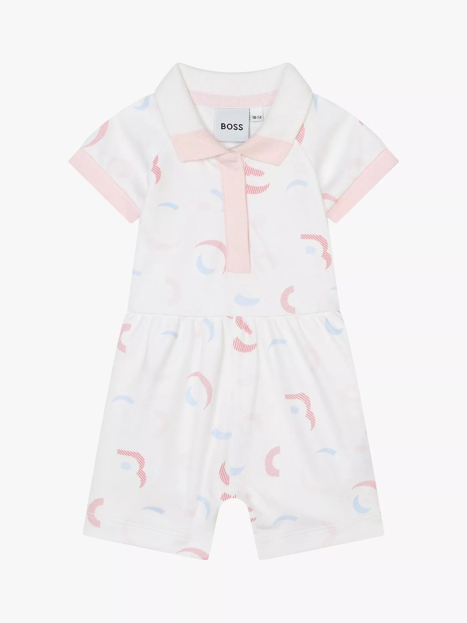 A cotton-rich all in one for baby with an all over print, polo neckline, and snap closure at the crotch.