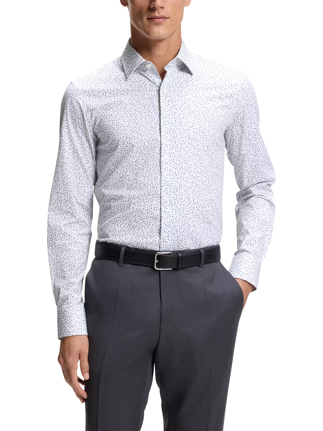 BOSS slim-cut shirt. Its geometric pattern and soft cotton blend make every meeting feel sharper while the comfortable stretch lets you move effortlessly through anything your schedule throws at you.