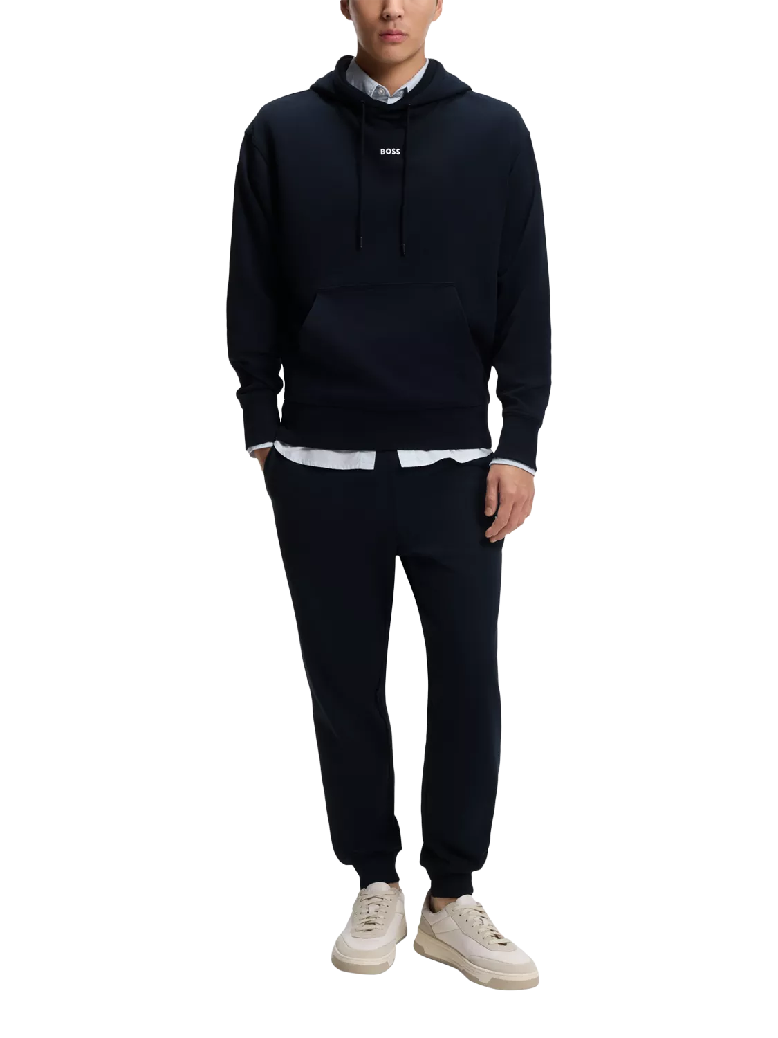 A luxe take on easy-wear casuals, made from soft cotton terry fabric. This BOSS Menswear tracksuit set features a straight fit, contrast logo details, cuffed jogger bottoms and a top with a drawcord hood.