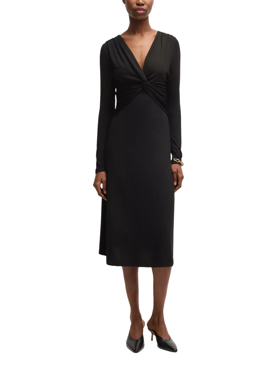 A timeless choice thanks to a sheath cut, this twist front knee length dress from BOSS is dreamt up from a whisper-weight viscose blend. With a universally flattering v-neckline and long sleeves, it is kept minimal for a truly seasonal collection.