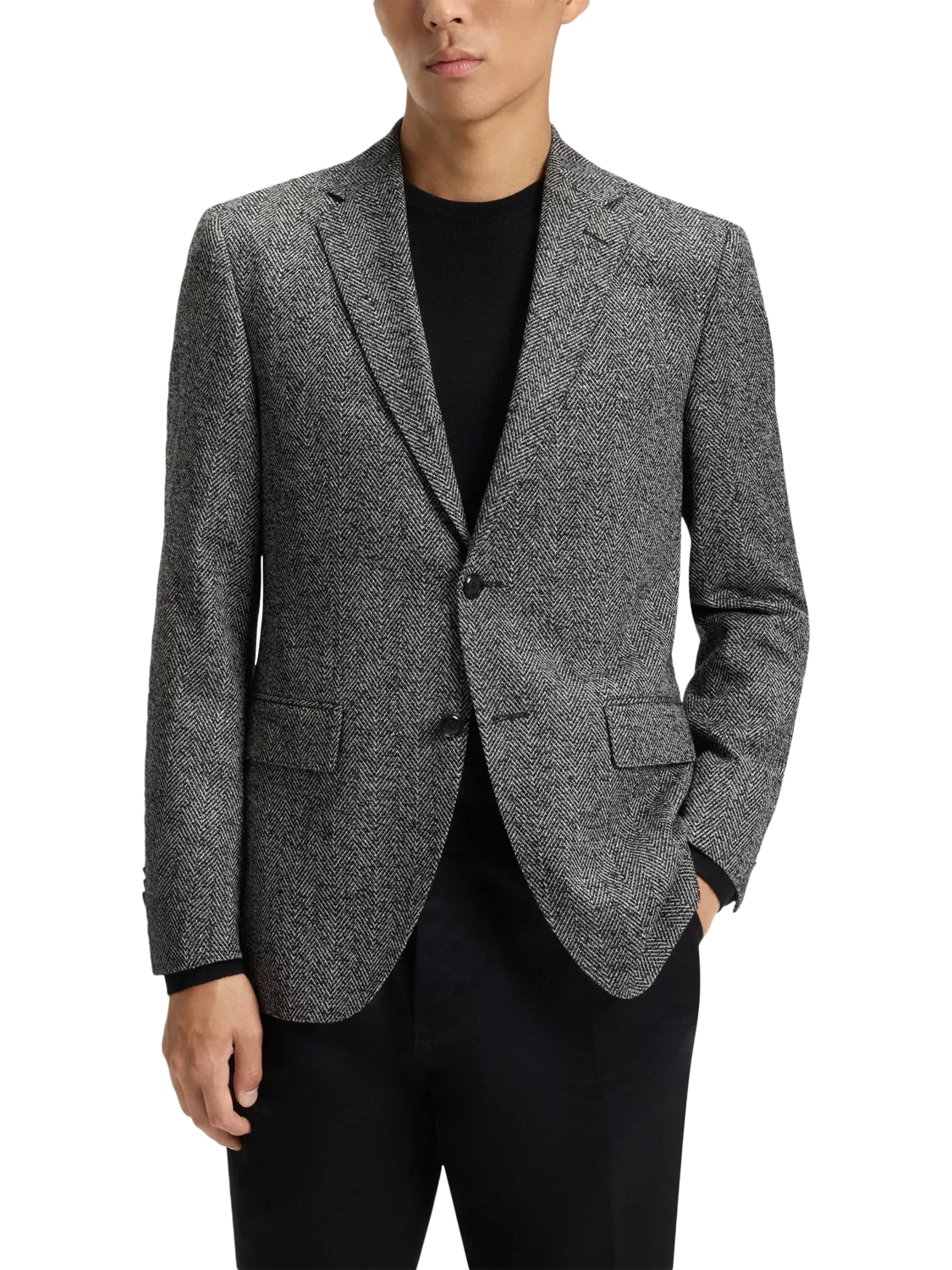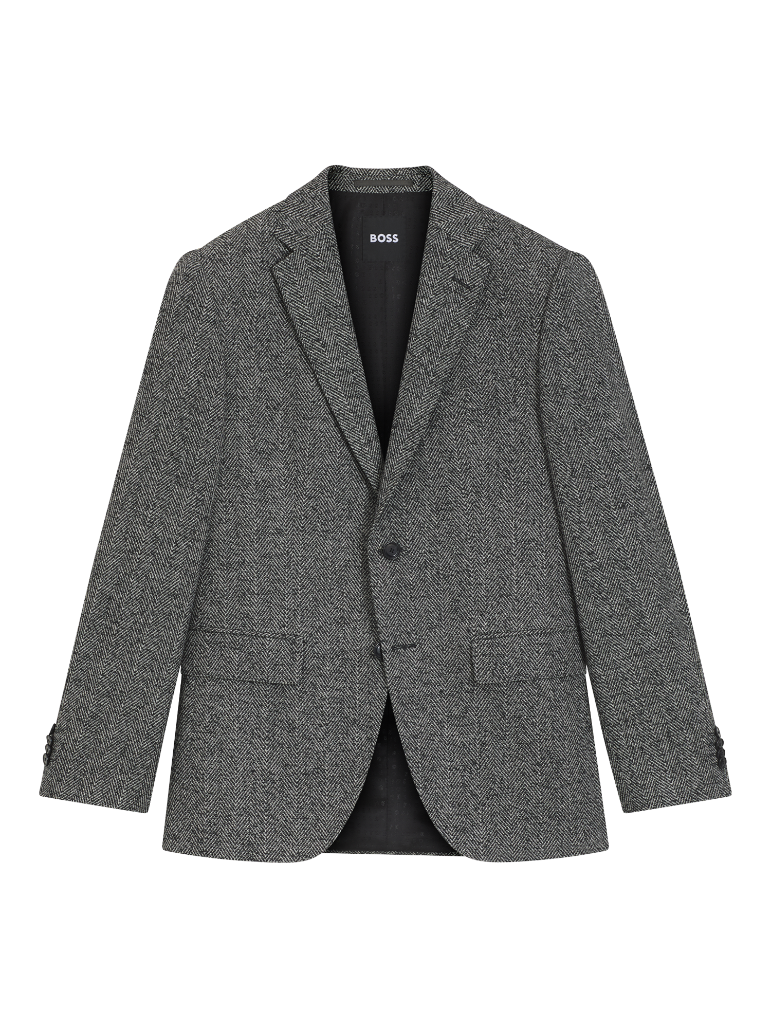 Crafted from a virgin wool blend, this suit jacket from BOSS will make a sharp addition to your formal wardrobe. Cut to a regular fit, the single-breasted jacket features a two-button front, notch lapels, a welt breast pocket, two flap side pockets, and kissing buttons at the cuff.