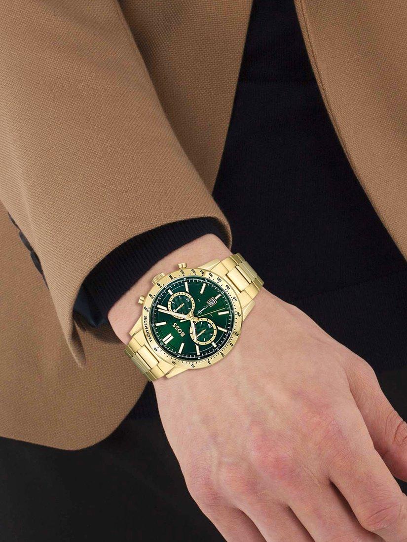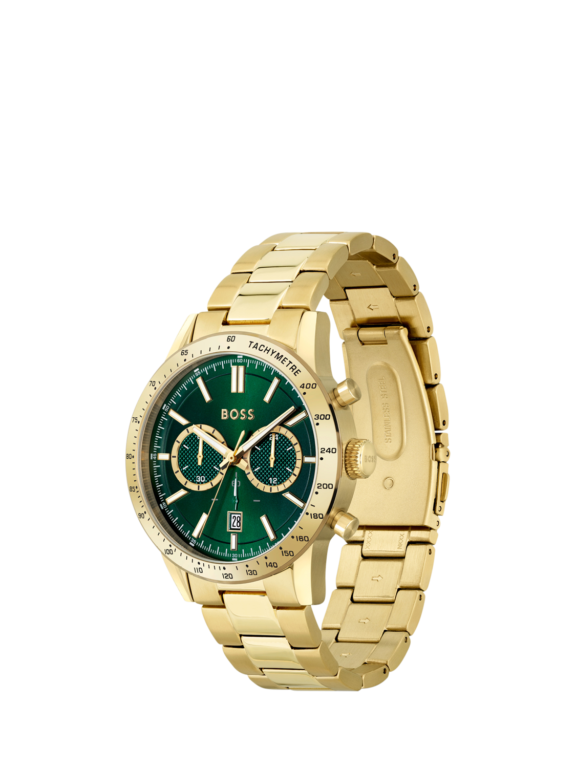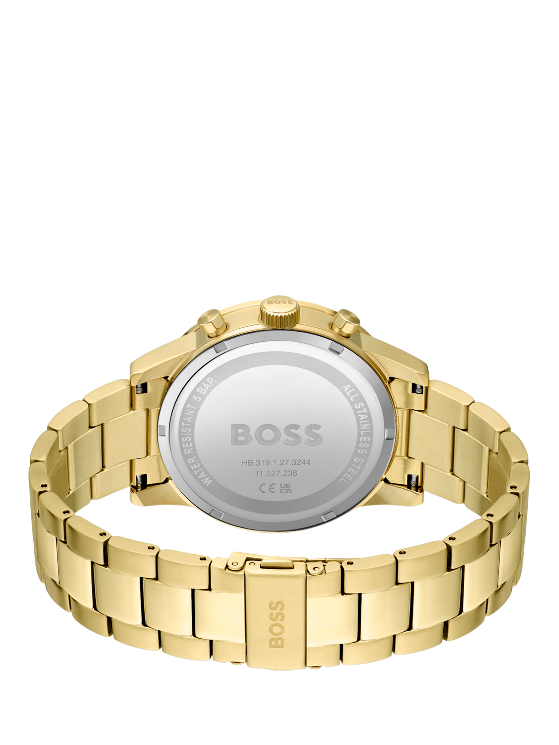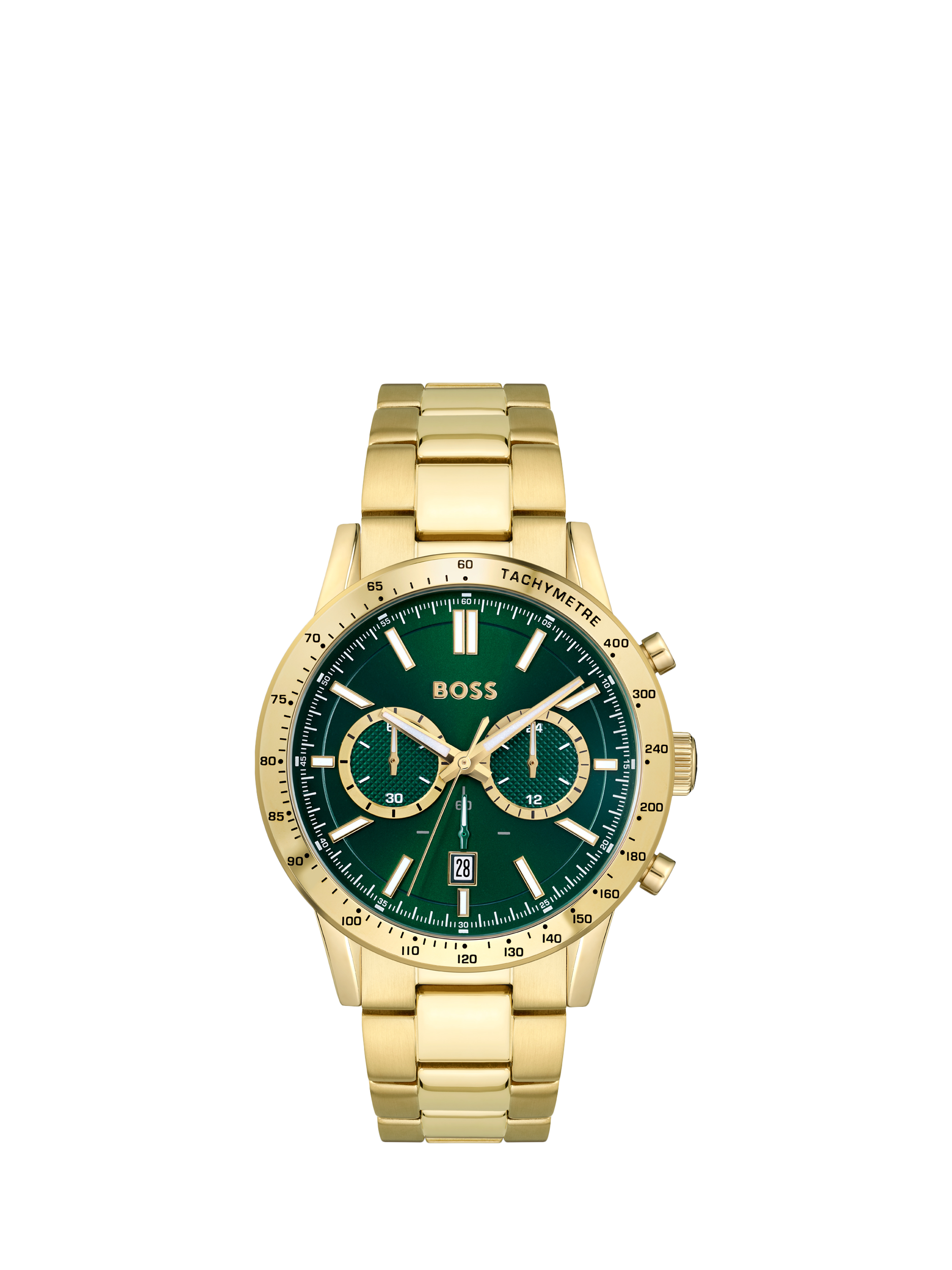 Designed with excellence, this timepiece from HUGO BOSS is set with classic elegance in its smooth round case and features chronograph sub-dials as well as a date display window and a tachymeter on the bezel converting time into speed.