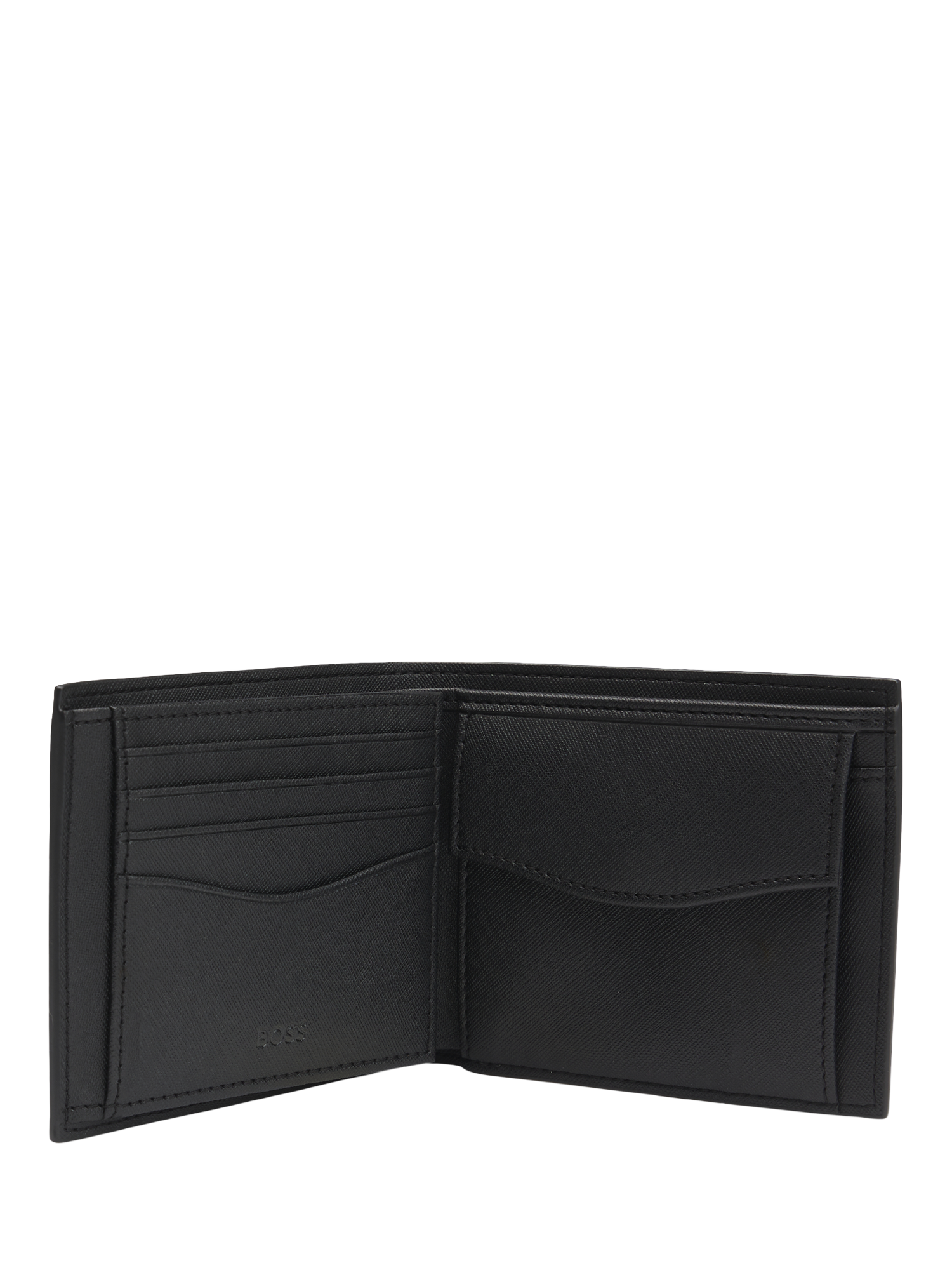 This BOSS Menswear trifold wallet offers plenty of space to organise your daily essentials, in a mix of structured and monogrammed effects for contemporary elegance. Fully lined, it features two bill compartments, eight credit card slots, and is finished with polished silver hardware.