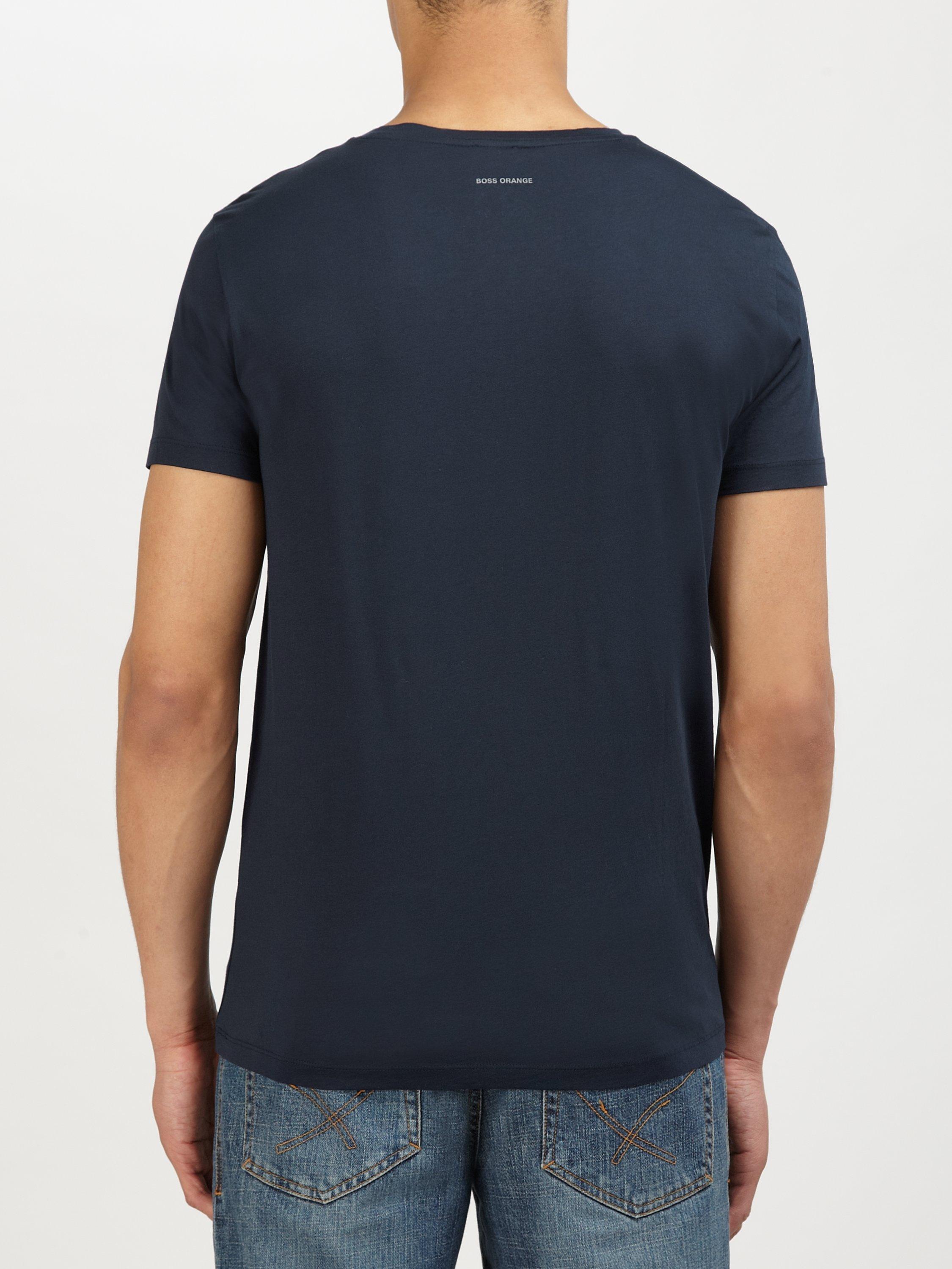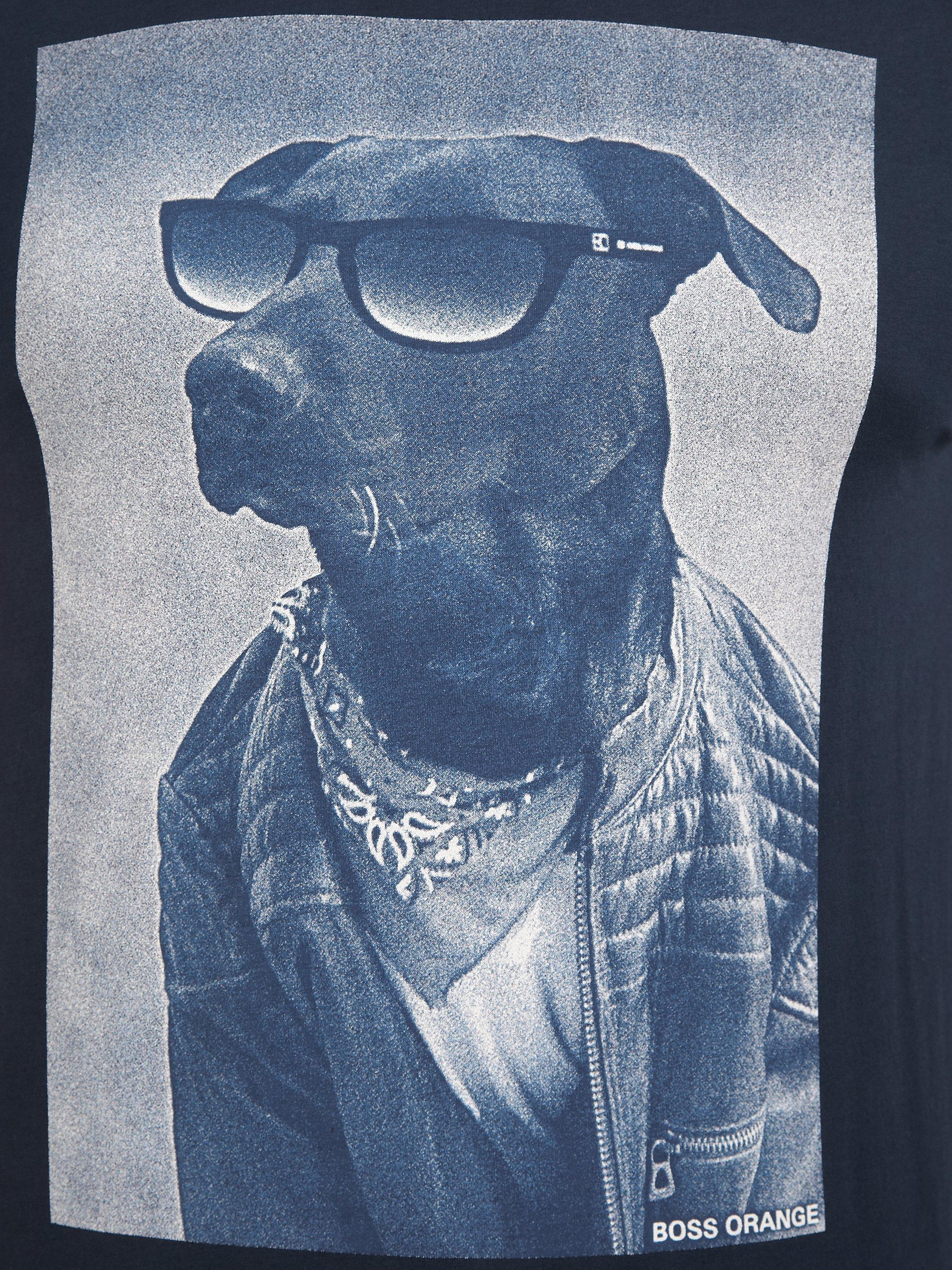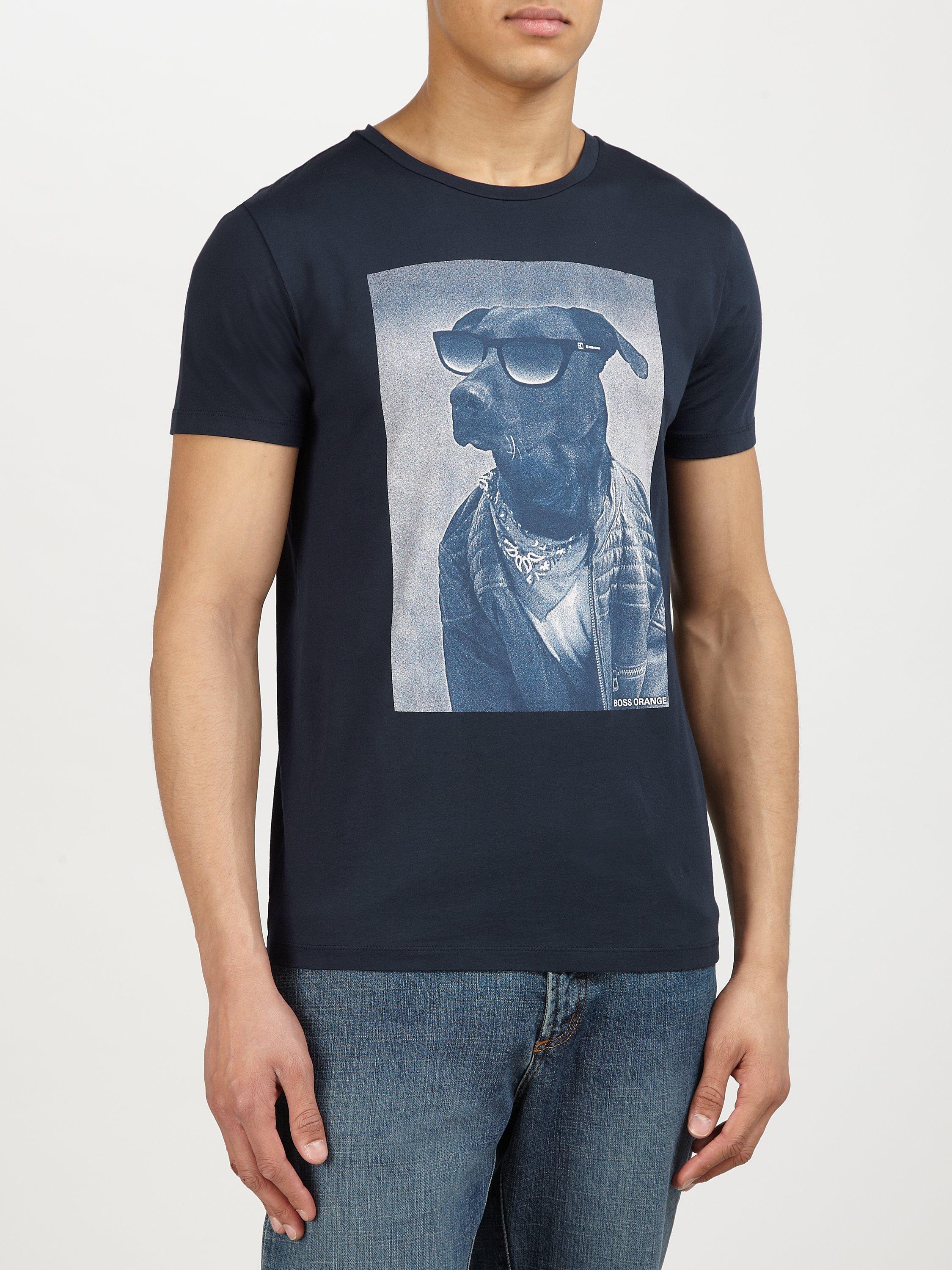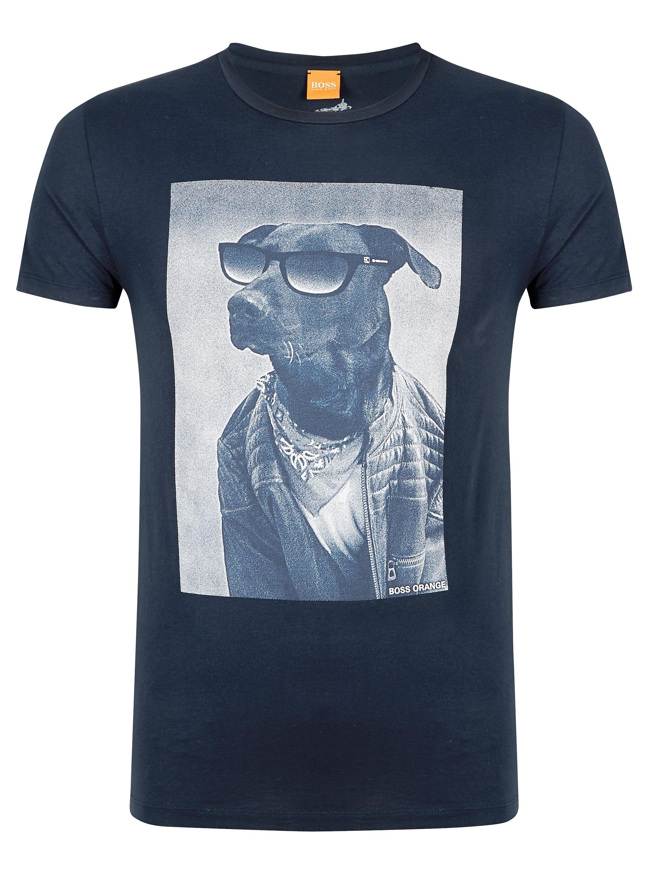 This t-shirt from BOSS Orange sports a photo of a cool canine rocking some fetching sunglasses. The t-shirt also features short sleeves and a crew neck detail, the brand's logo is located at the bottom of the photograph. Pair with jeans and canvas trainers, for a winning combination. It is often said, a dog is a man's best friend.