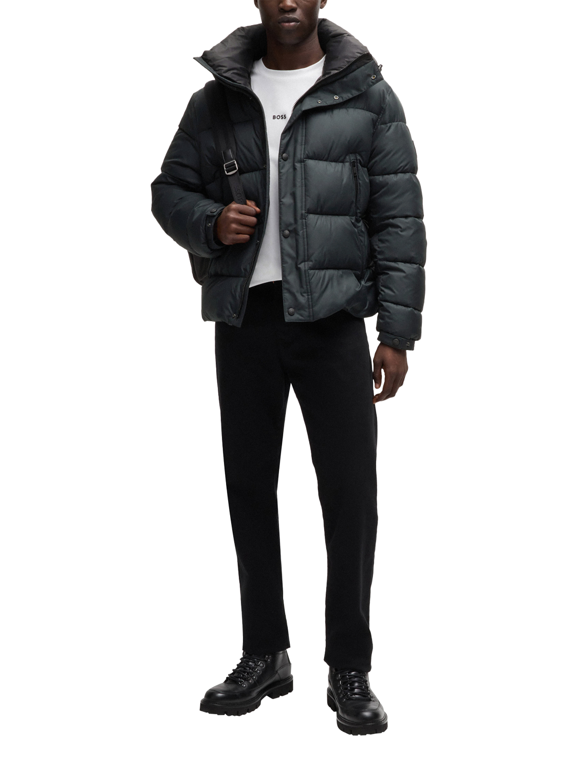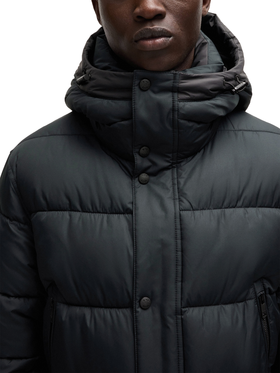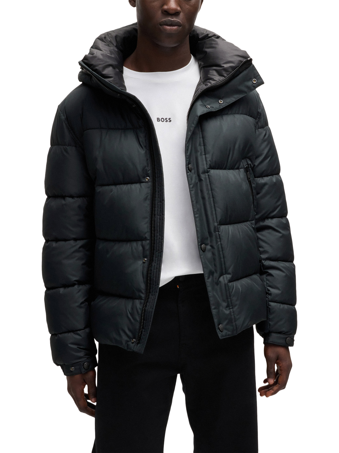 Stay warm in this basic, high tech fill puffer jacket from Hugo Boss. Made from Matt lightweight Nylon and featuring a centre front placket with exposed snaps, attached hood, zipper sides pockets and adjustable cuffs, this is an everyday piece you’ll want to add to your winter wardrobe.