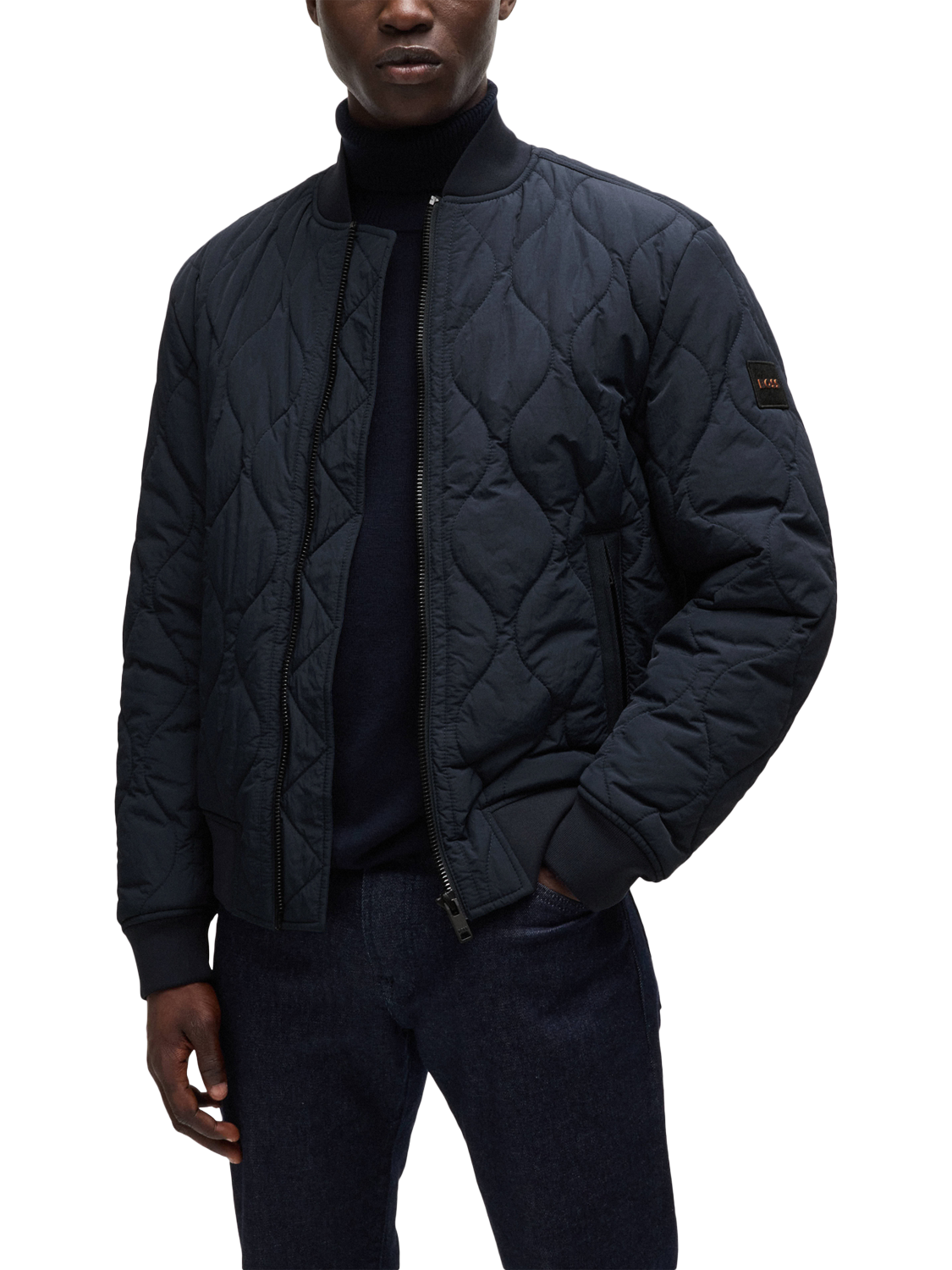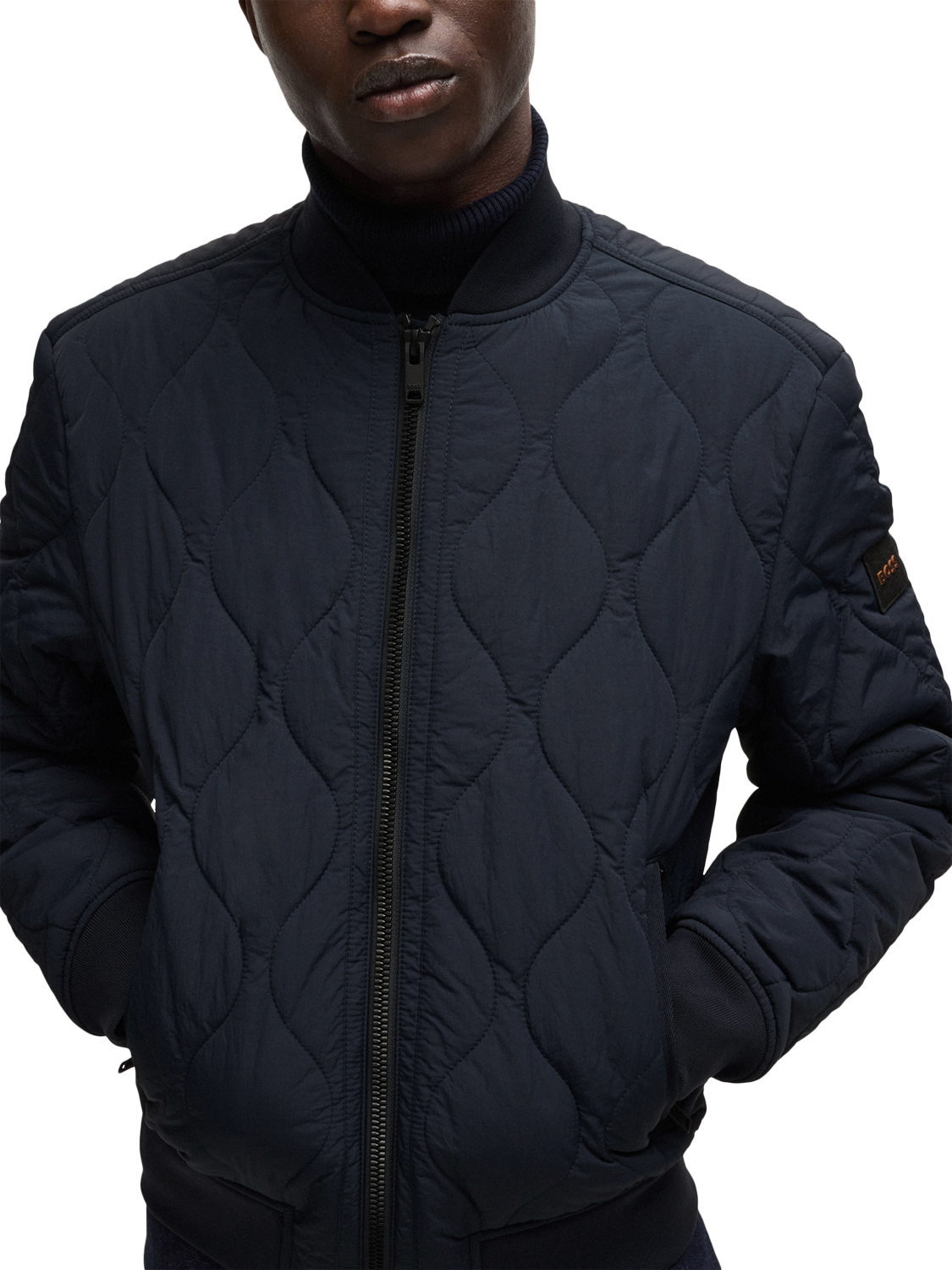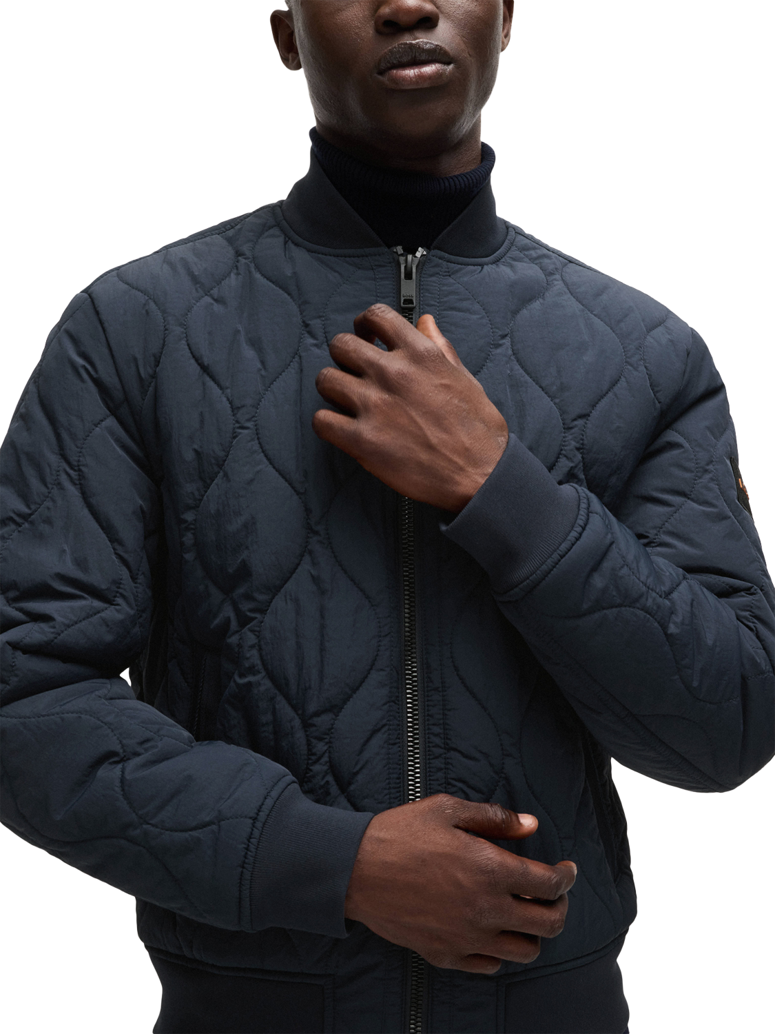 Wear the iconic medium weight quilted bomber from Hugo Boss again and again. It’s designed with a semi matte crinkle nylon fabric, a bomber collar, logo trims, warm pocketing, an inner welt pocket, a tonal rib at the cuffs, collar and bottom hem, and herringbone tape zip pockets.
