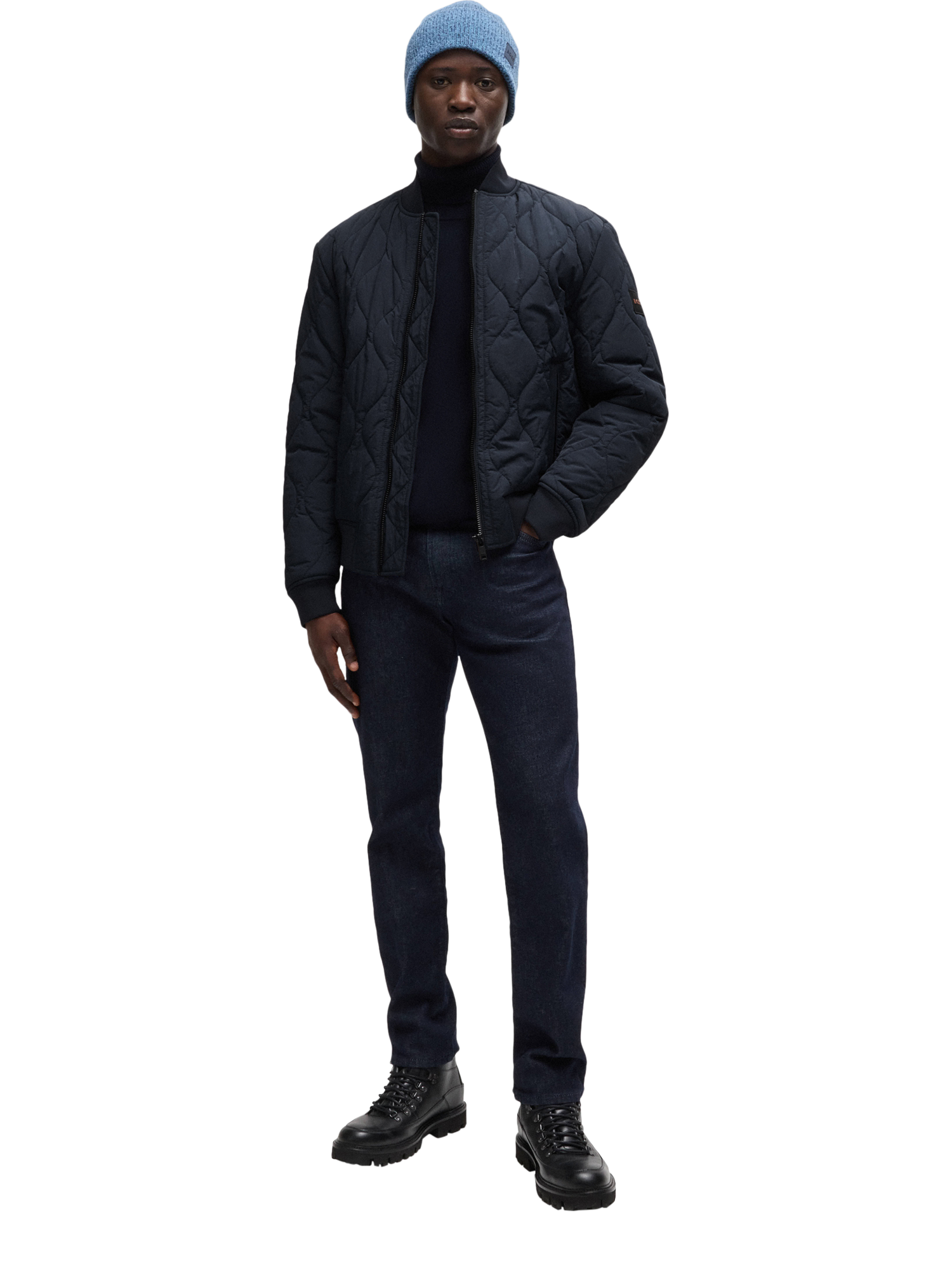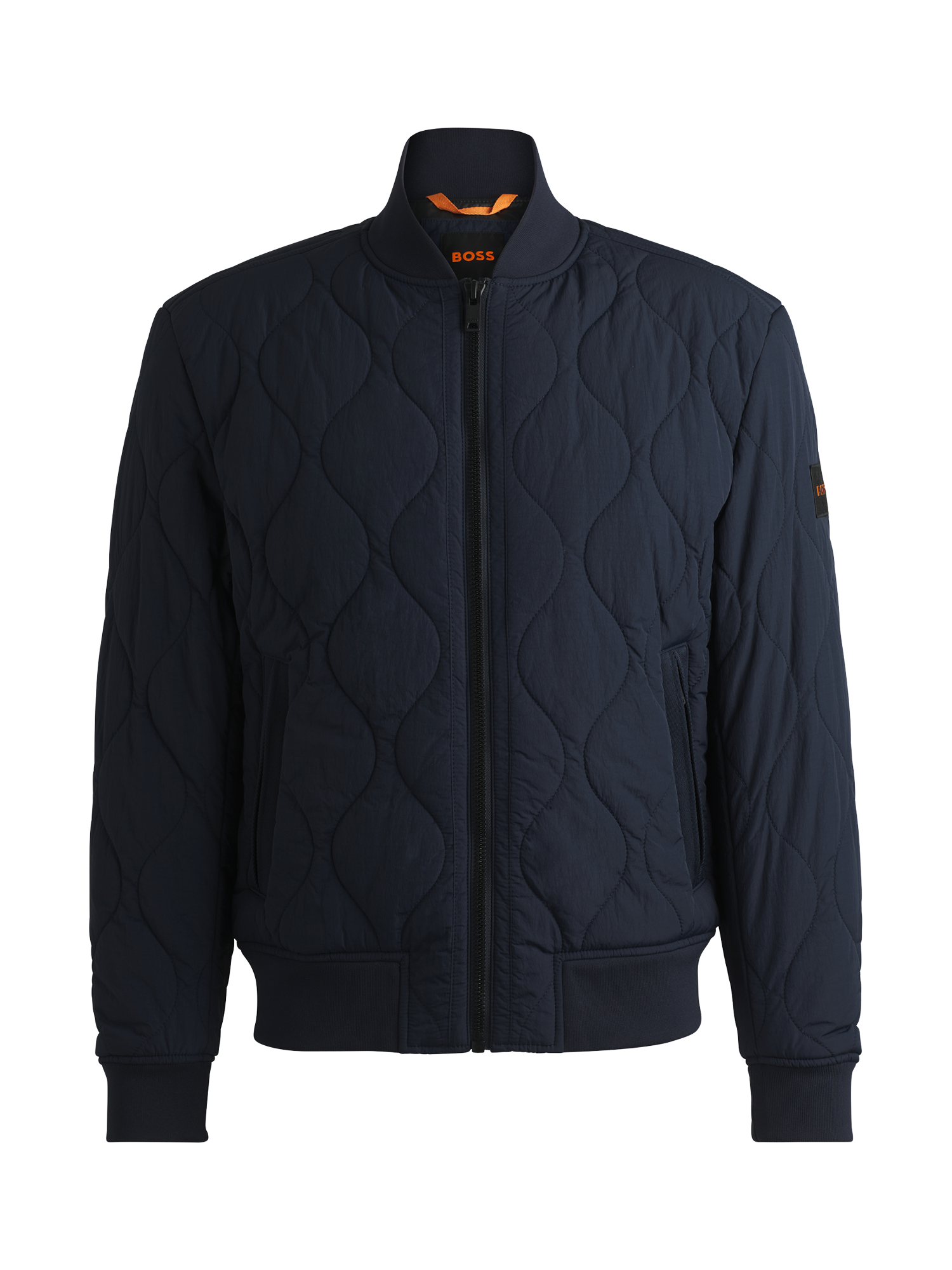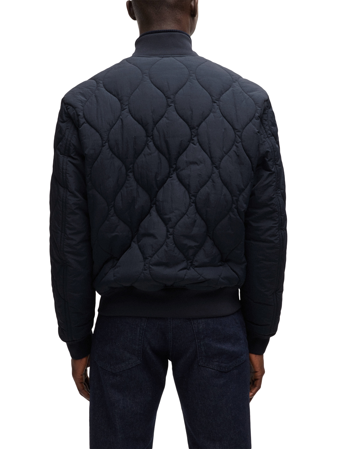 Wear the iconic medium weight quilted bomber from Hugo Boss again and again. It’s designed with a semi matte crinkle nylon fabric, a bomber collar, logo trims, warm pocketing, an inner welt pocket, a tonal rib at the cuffs, collar and bottom hem, and herringbone tape zip pockets.