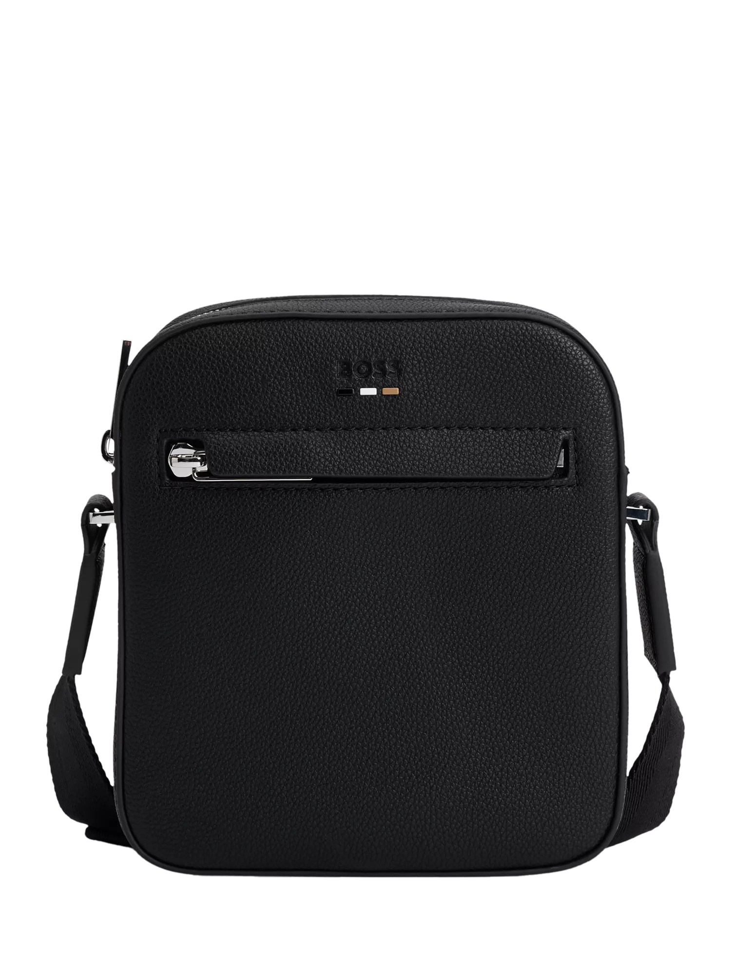 The BOSS Ray crossbody bag features a signature embossed logo complemented by tri-colour stripe plates on the front, offering a distinctive appeal. It ensures utility is paramount with a flat zipped front pocket for essential access and an adjustable shoulder strap for comfort and versatility.