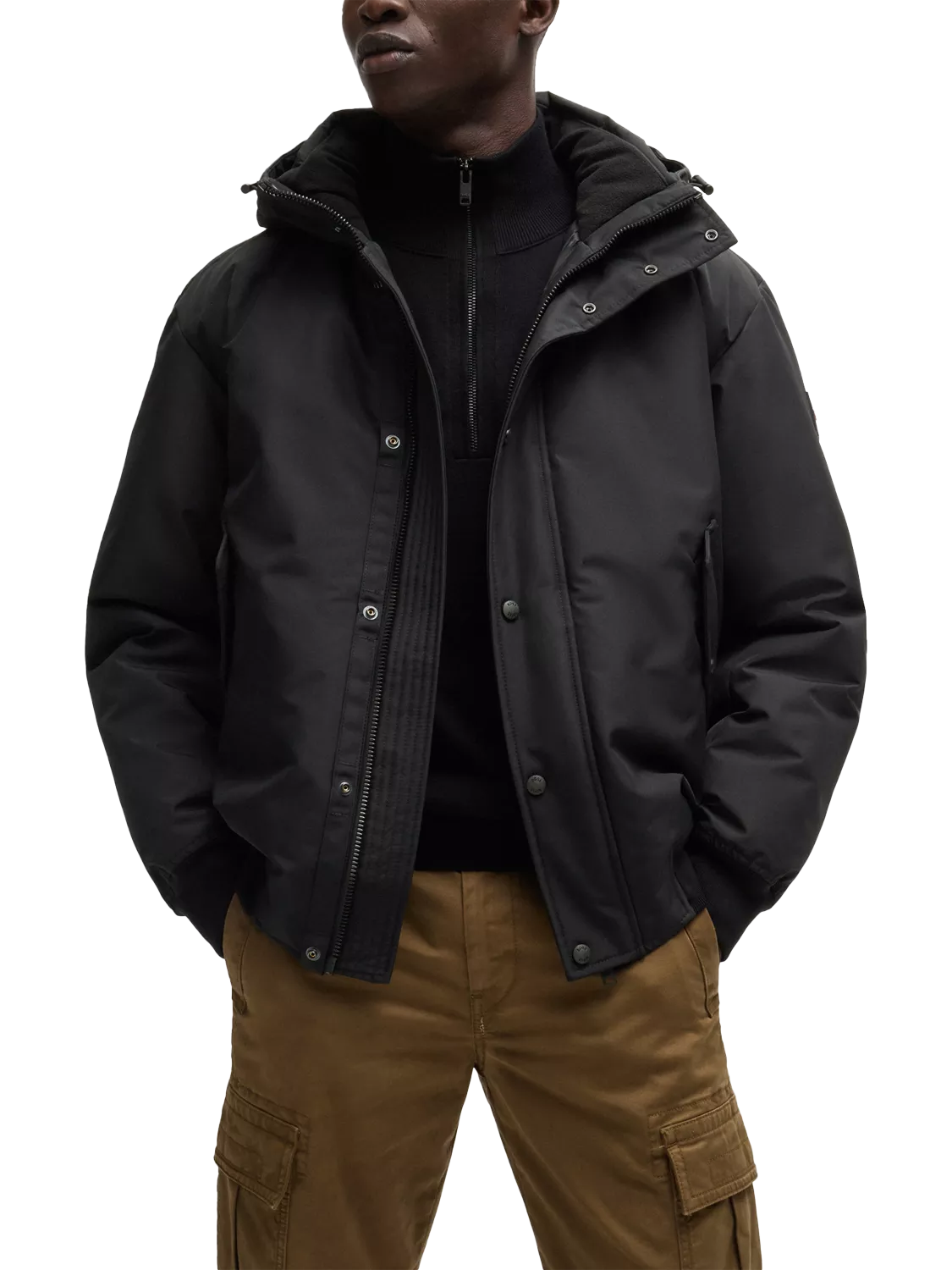 This iconic winter short parka from Hugo Boss is a timeless piece. It features high tech filling, micro textured durable nylon fabric, warm pocketing, an inner welt pocket and polar fleece details at the inner collar.