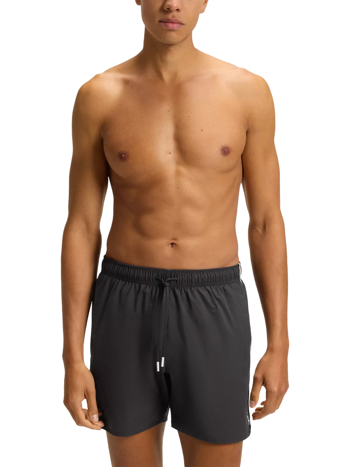 Swim shorts with a woven BOSS stripe tape on the side seam. Comes with side pockets, a back patch pocket and metal tips on the drawcord for the adjustable waist.