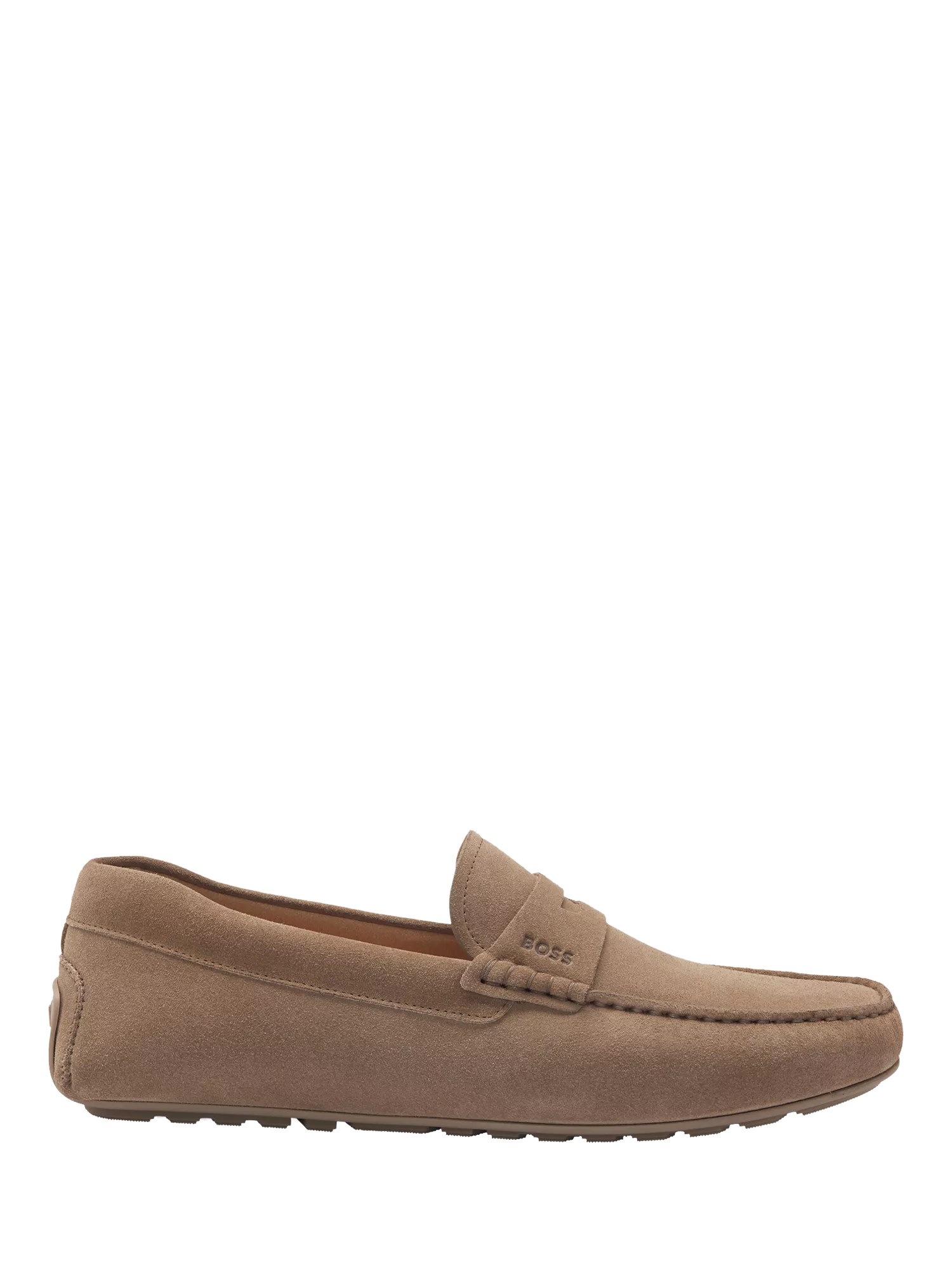 Iconic BOSS penny loafer moccasin featuring soft and comfortable full suede upper, providing a comfortable yet luxurious feel. This style offers durability, flexibility, and traction. This timeless and versatile shoe is crafted in Portugal, known for its skilled craftsmanship and attention to detail.