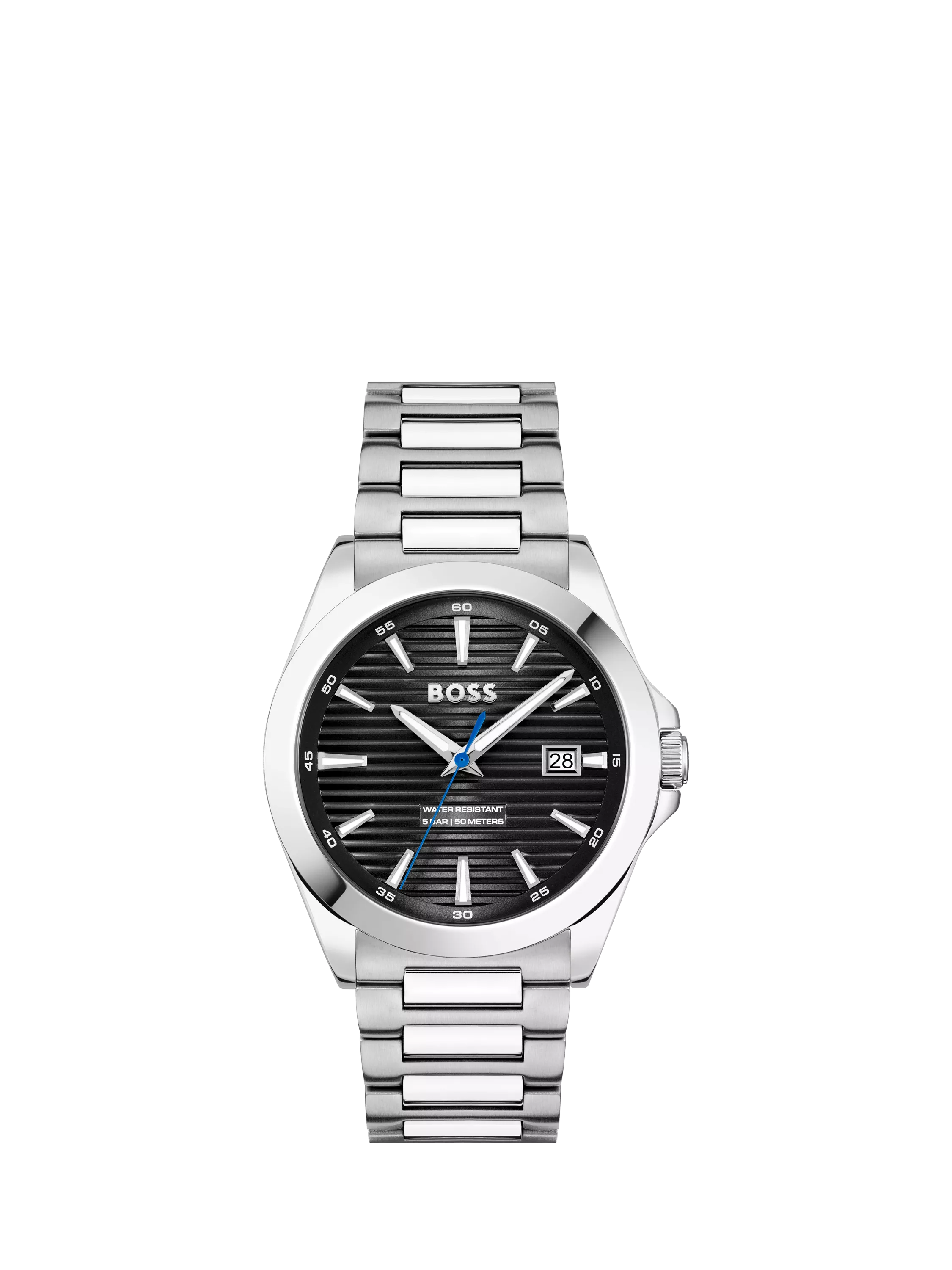 From BOSS's Strike family, this watch features a 41mm stainless steel case with a three-hand movement and is secured with a stainless steel bracelet strap. Water resistant to 50m.