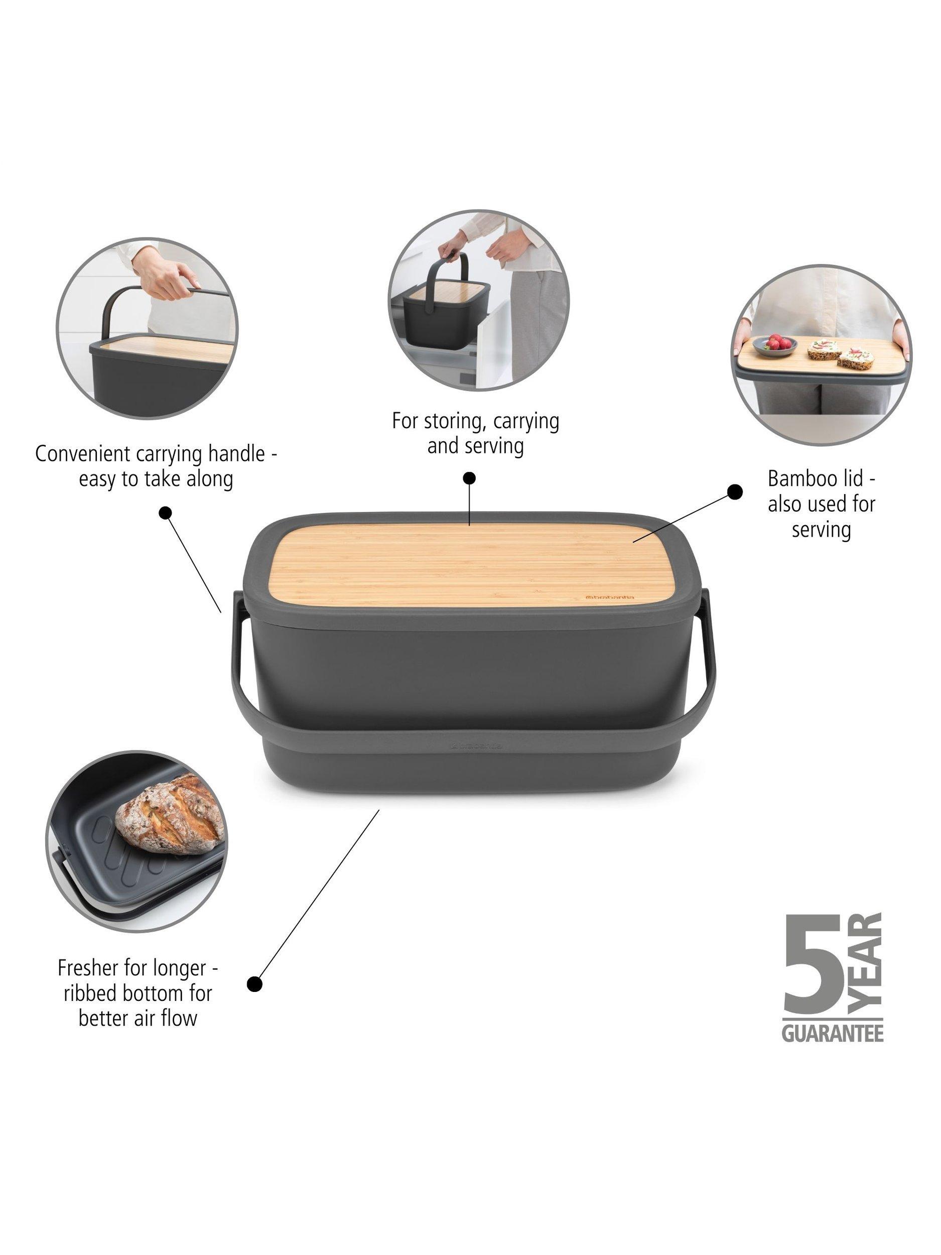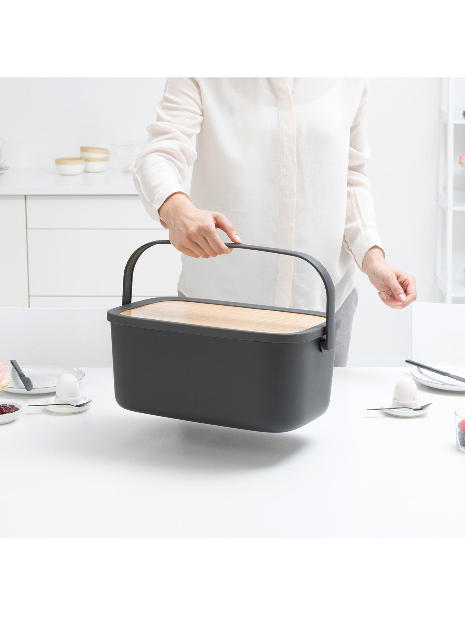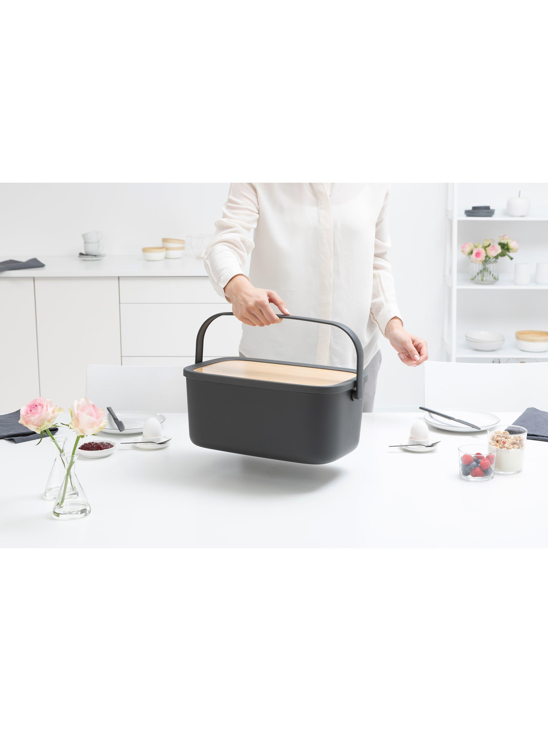 This Brabantia bread bin has a bamboo lid that doubles as a breadboard or serving board. Compact and easy to store on a countertop, it also has a handle to carry to and from the kitchen to the table, when dining indoors or outdoors.