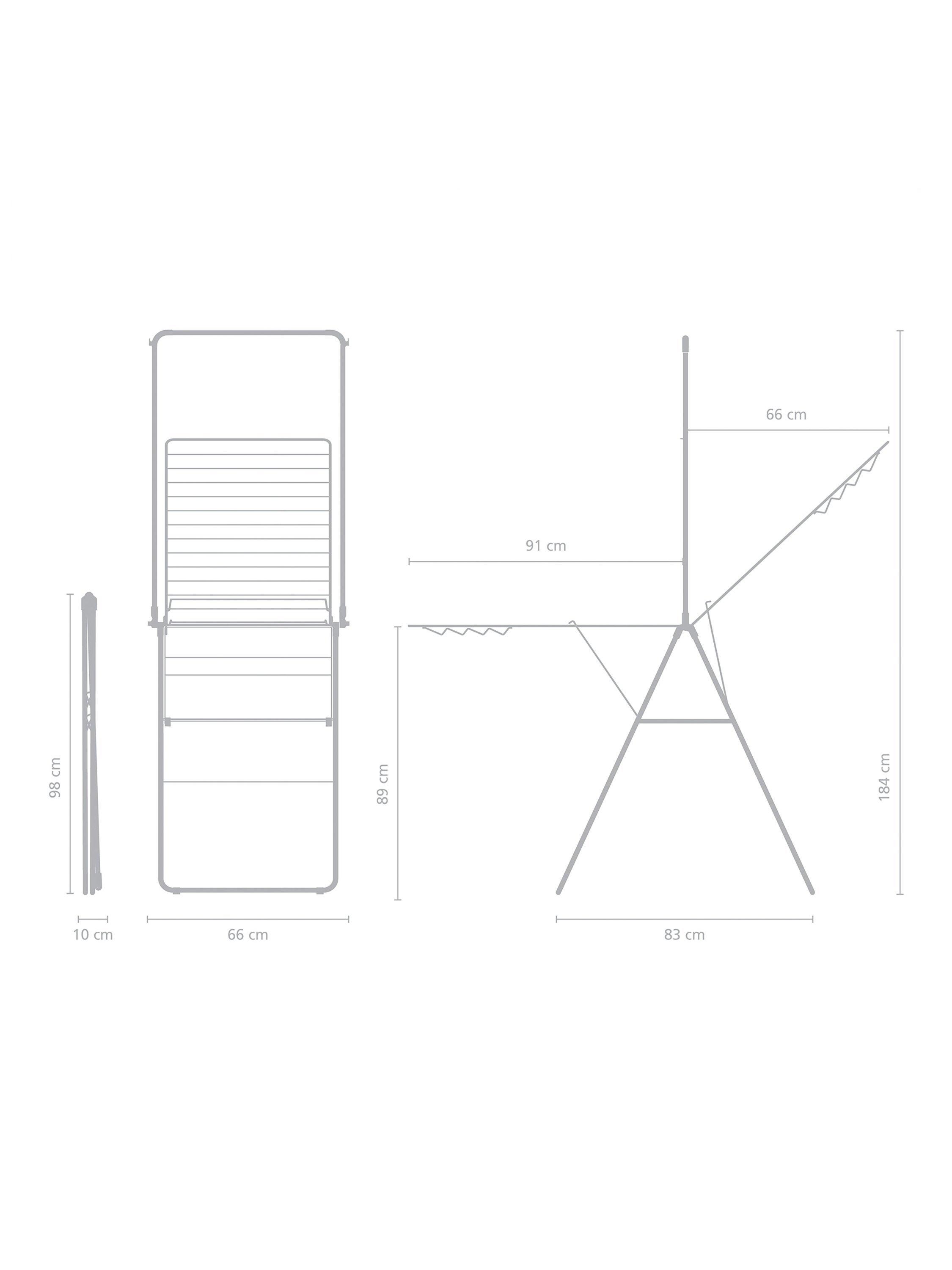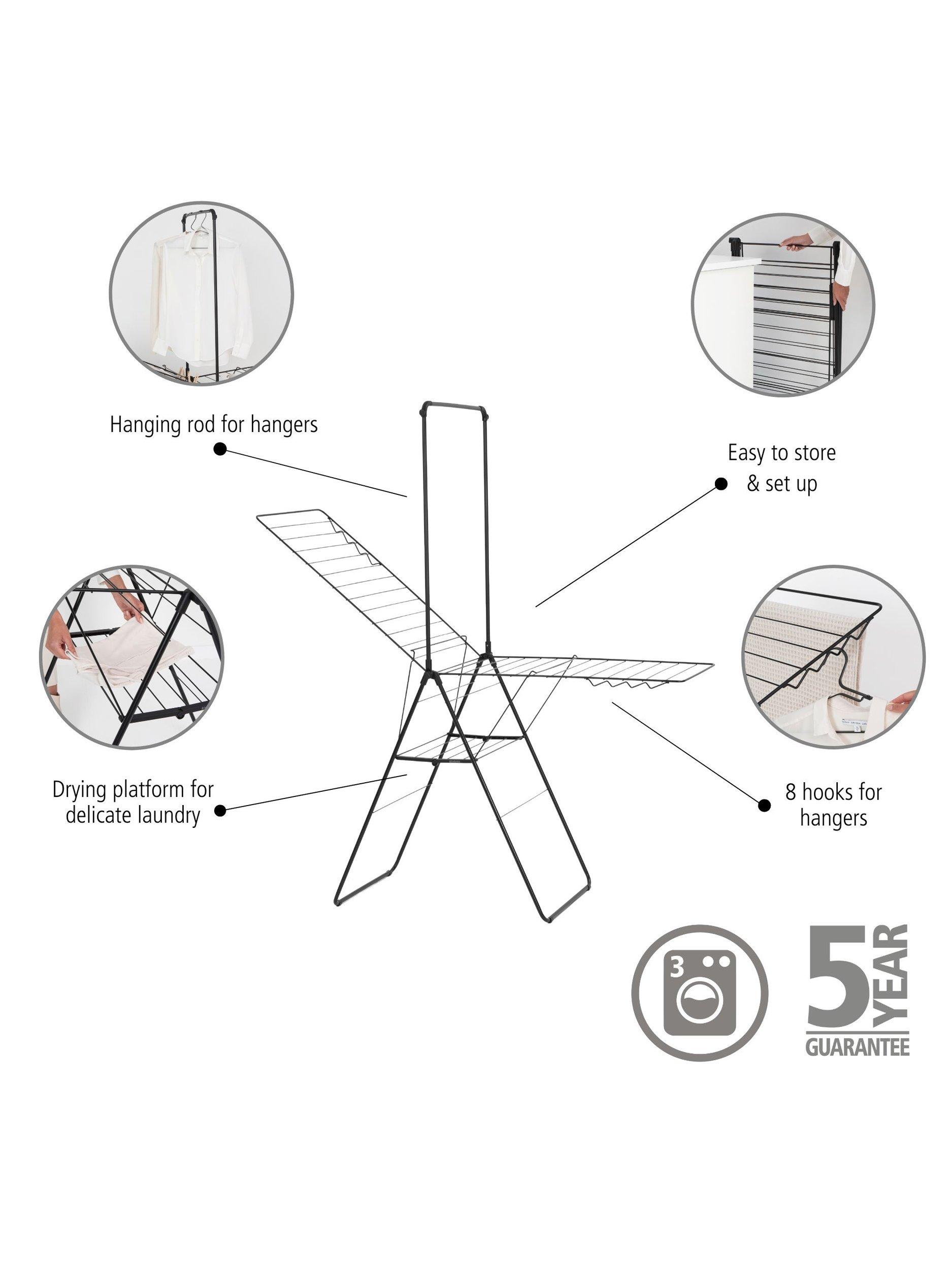 8x hanger hooks are included, so you can hang blouses and shirts while keeping them crease-free and the wing top can be used as a drying platform for delicate items. The centre hanging rod holds at least 10 hangers more and can be loaded up to a maximum of 10kg.