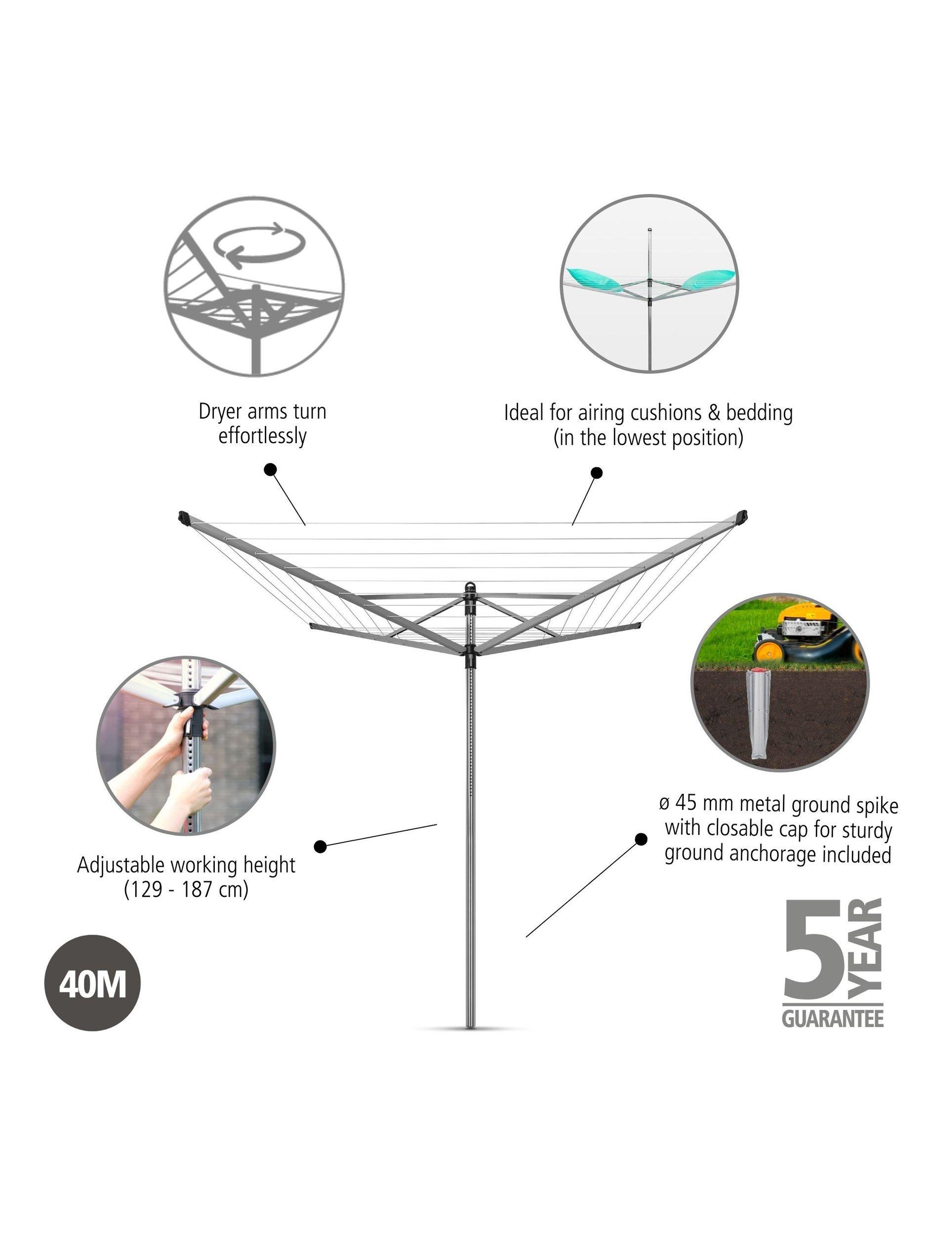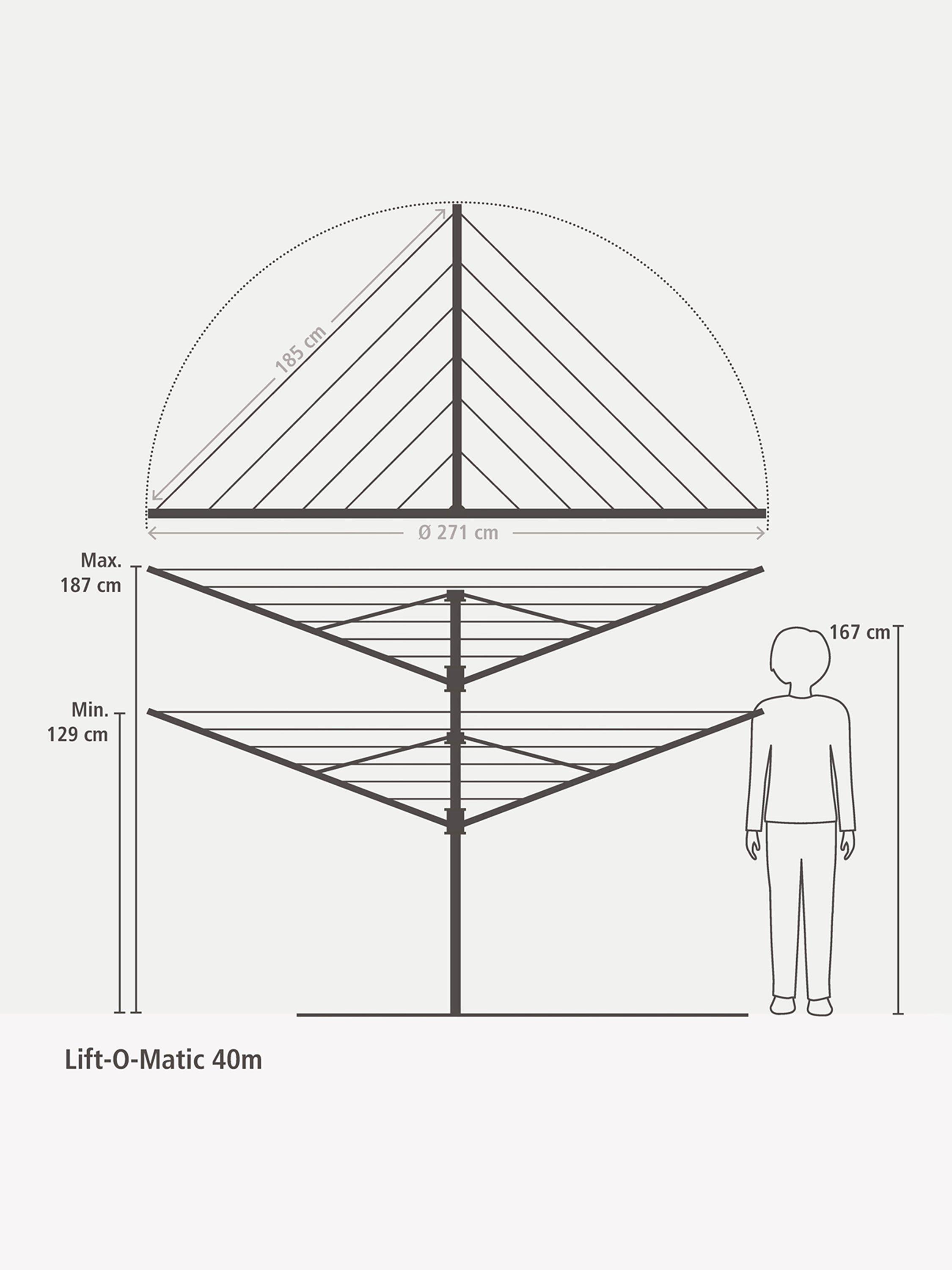 Take a load off your shoulders with this Lift-O-Matic Rotary Dryer. Adjust the rotary clothesline seamlessly to your ideal working height (from 129 to 187 cm). Easy to turn, always taut lines and it will take your clothes hangers too! A great dryer for outdoor launderers big or small.
