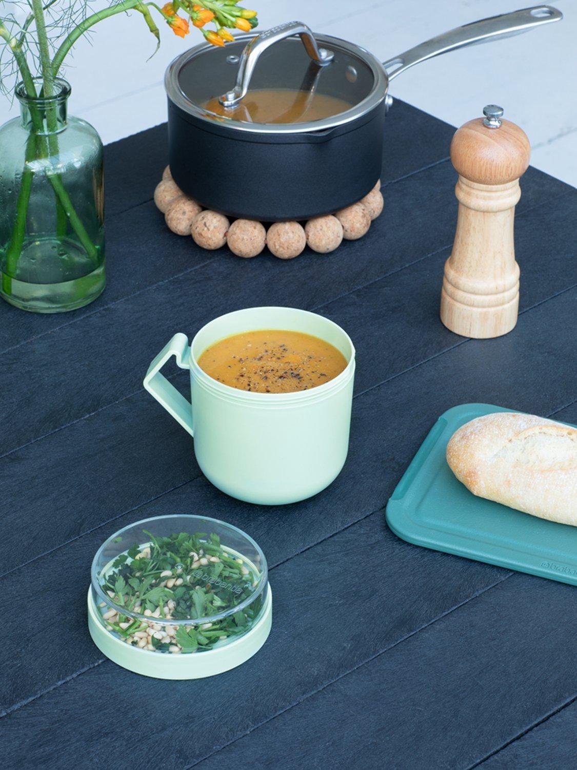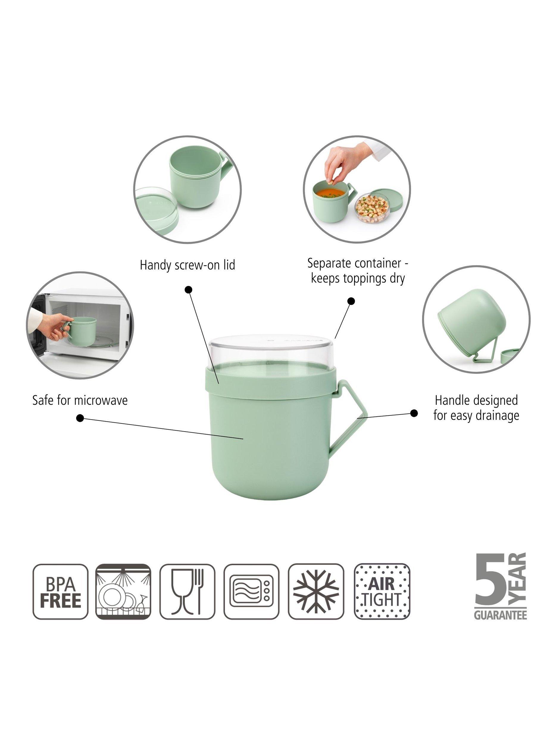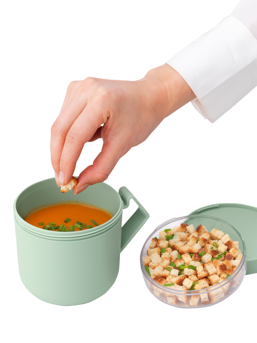 Take your soup with you without worrying about spills with the Brabantia Make & Take Soup Mug. This smart soup-to-go container fits up to 600 ml of your favourite broth and is microwave-proof. And to top it off, this miracle mug has a screw-on toppings container, keeping ingredients separated and fresh.