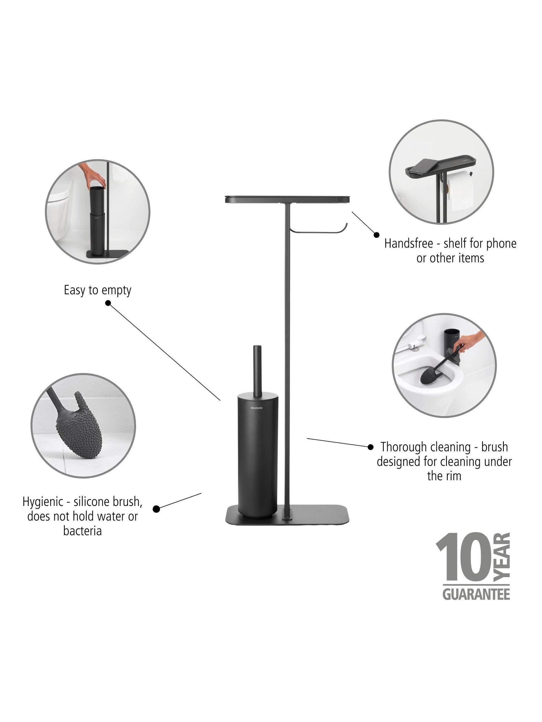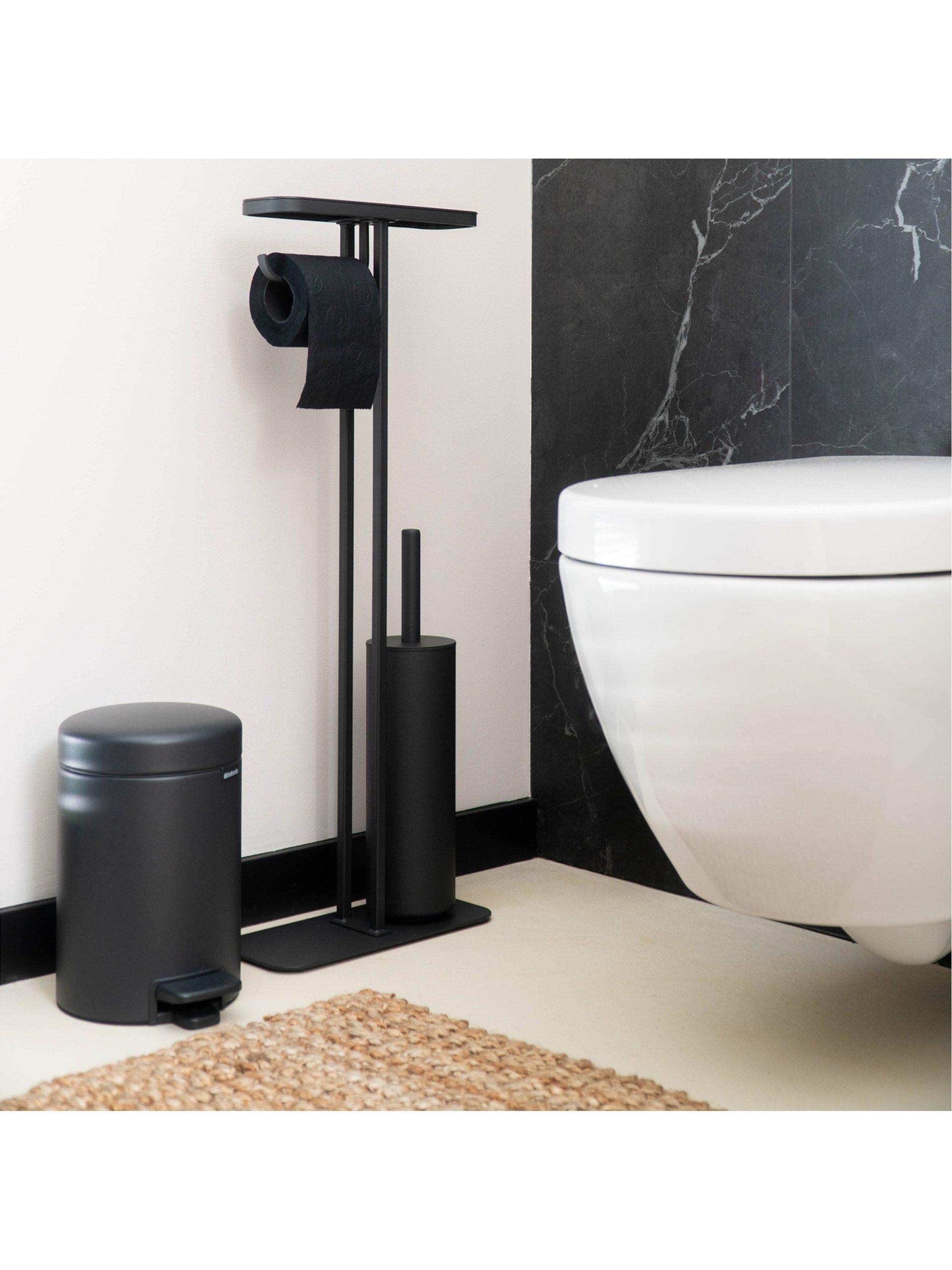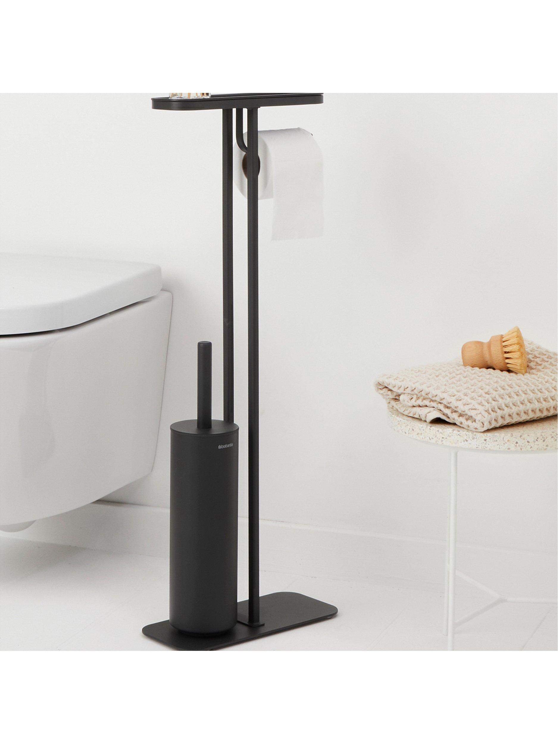 Brabantia's MindSet bathroom accessories all have a mineral coating that gives them a contemporary look and textured feel. This all-in-one toilet butler includes a shelf, integrated roll holder and toilet brush in one stand so you have everything you need within easy reach and without having to mount anything to your wall.
