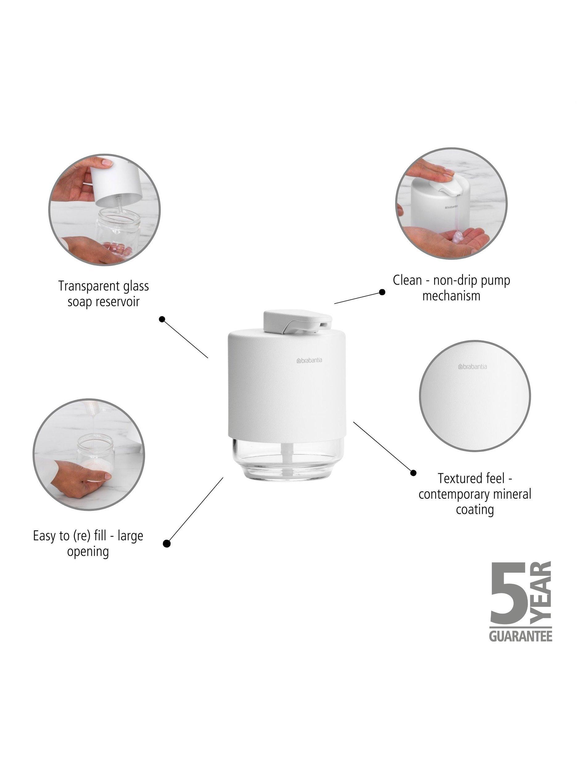 Brabantia's MindSet bathroom accessories all have a mineral coating that gives them a contemporary look and textured feel. This soap pump can hold up to 200ml and the large nozzle works with both soap and hand lotion so you can have matching dispensers for your hand wash and cream.