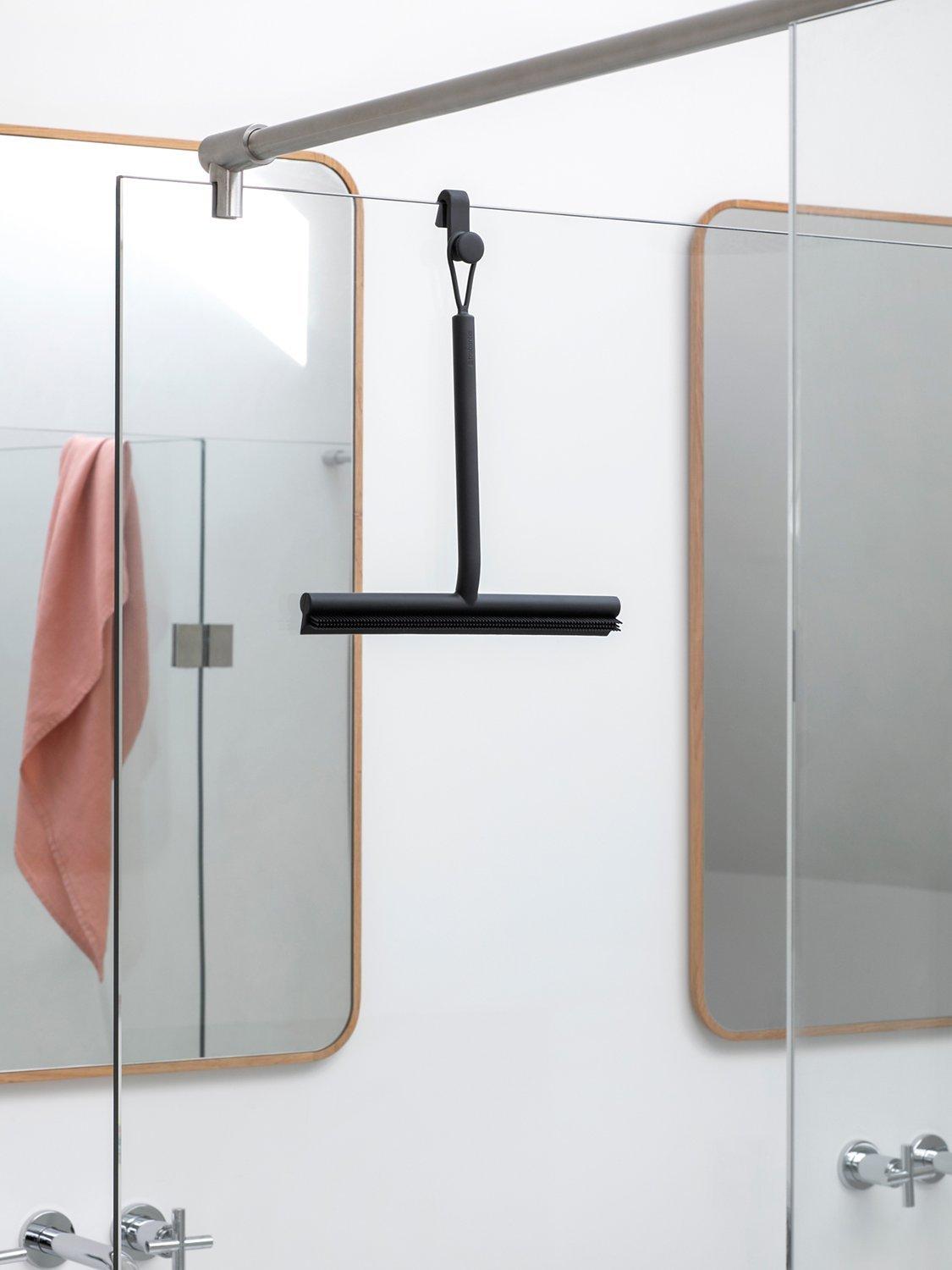 Brabantia's ReNew double-sided shower squeegee is ideal for glass, tiles and other smooth surfaces. The brush side cleans soap residue while the wiper blade side dries.