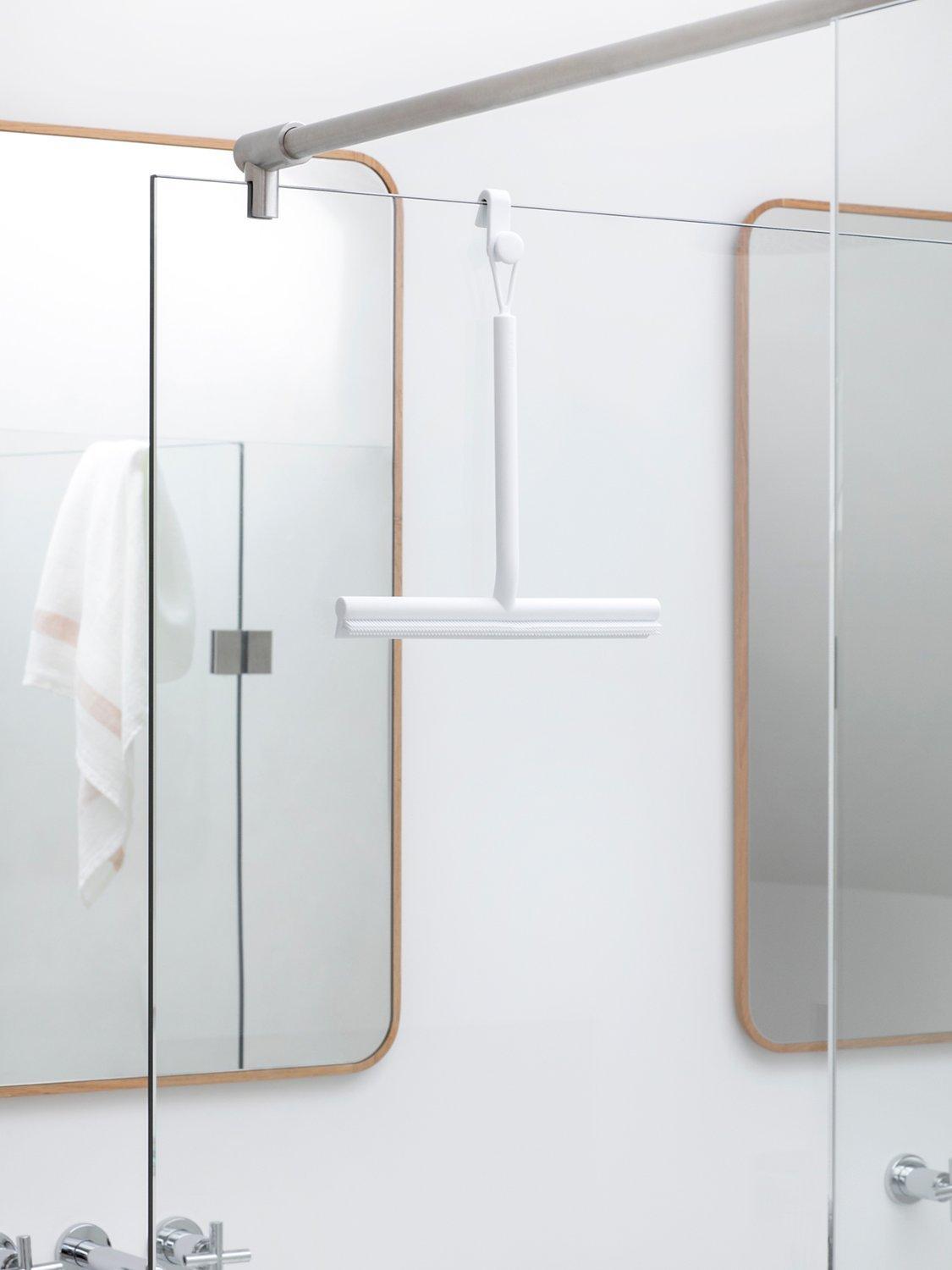 Brabantia's ReNew double-sided shower squeegee is ideal for glass, tiles and other smooth surfaces. The brush side cleans soap residue while the wiper blade side dries.