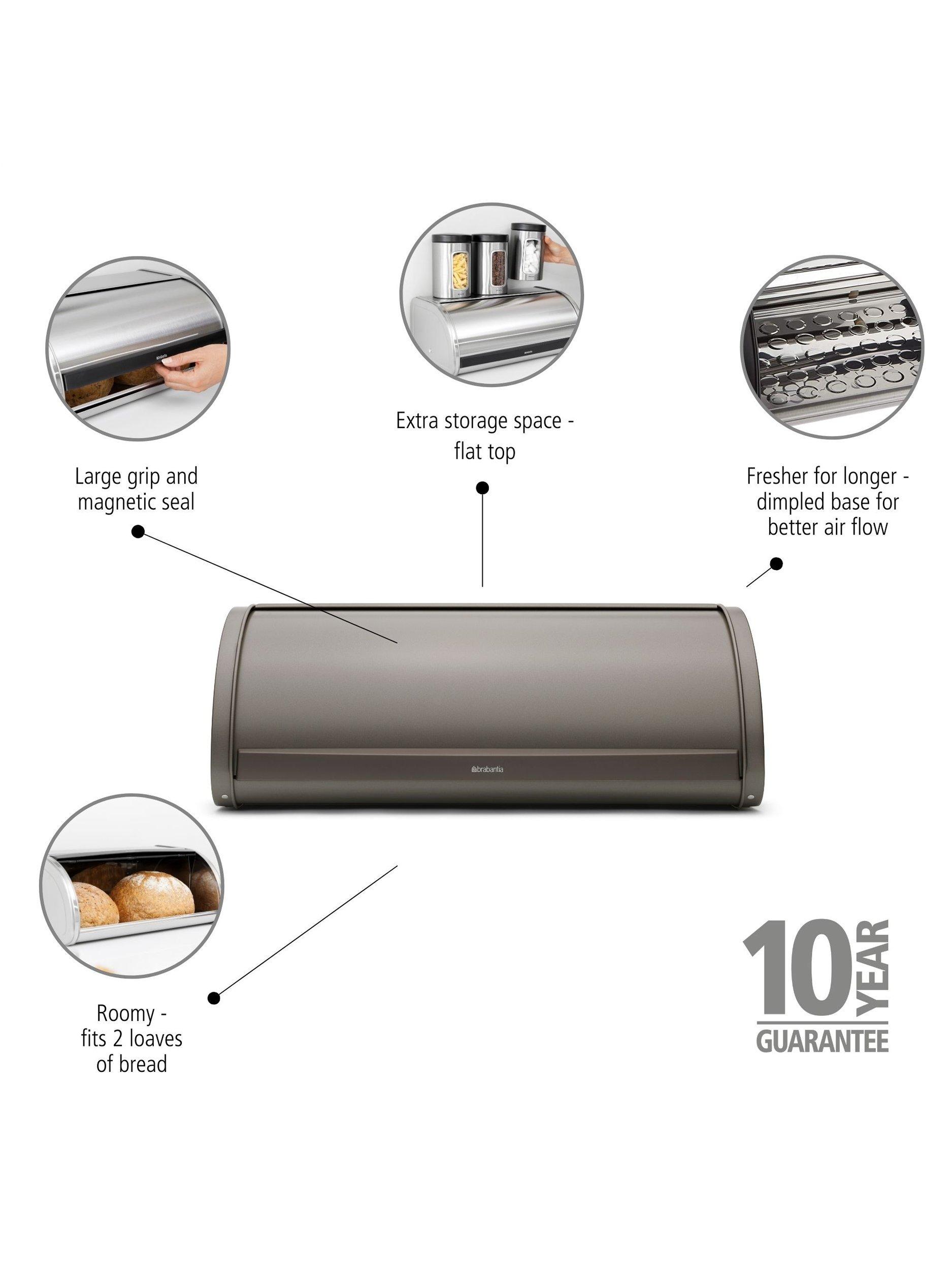 Featuring a classic and easy-to-open roll top lid with a full-width grip, it has a flat top giving you a little extra space for storing canisters. The bread bin has plenty of space for two loaves of bread and opens and closes smoothly and quietly, thanks to a plastic stop on the inside that dampens noise.