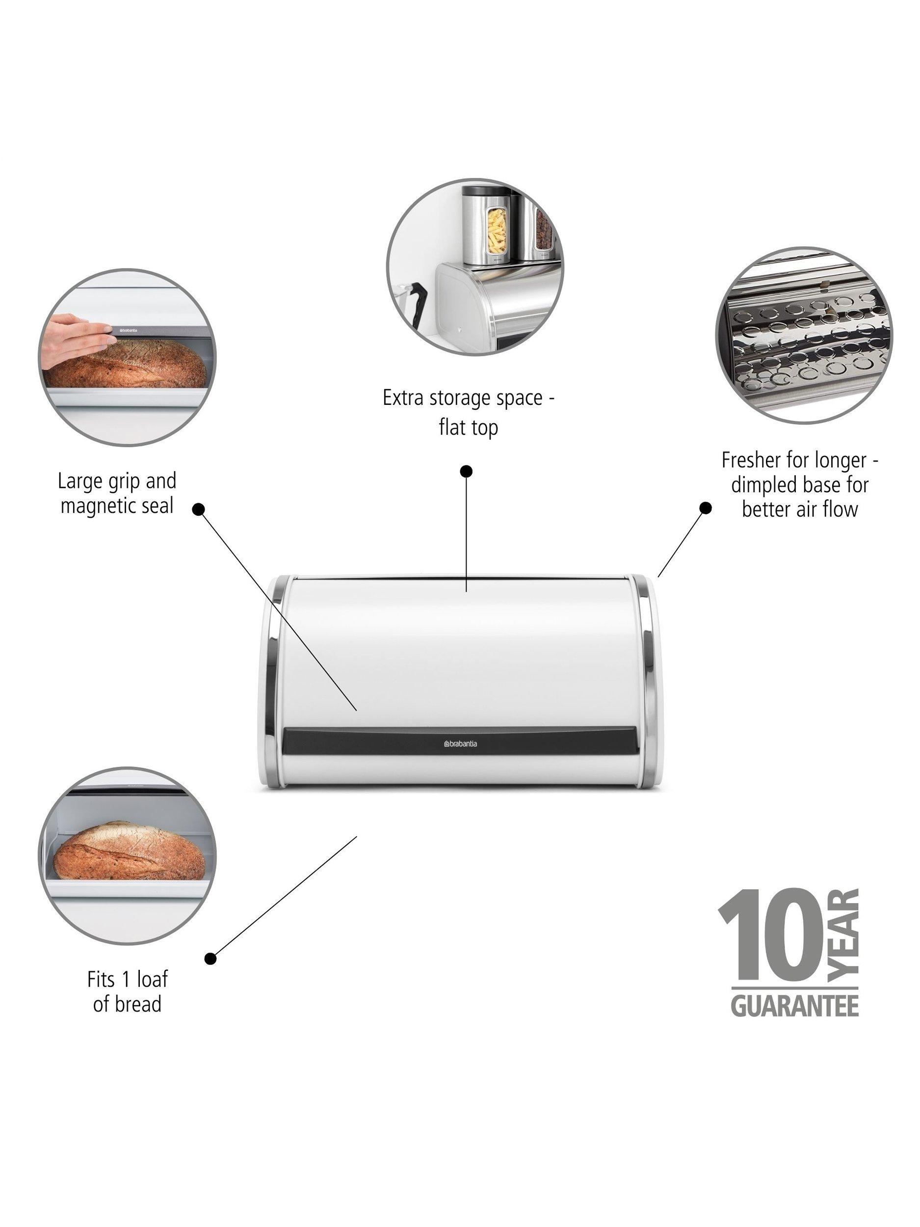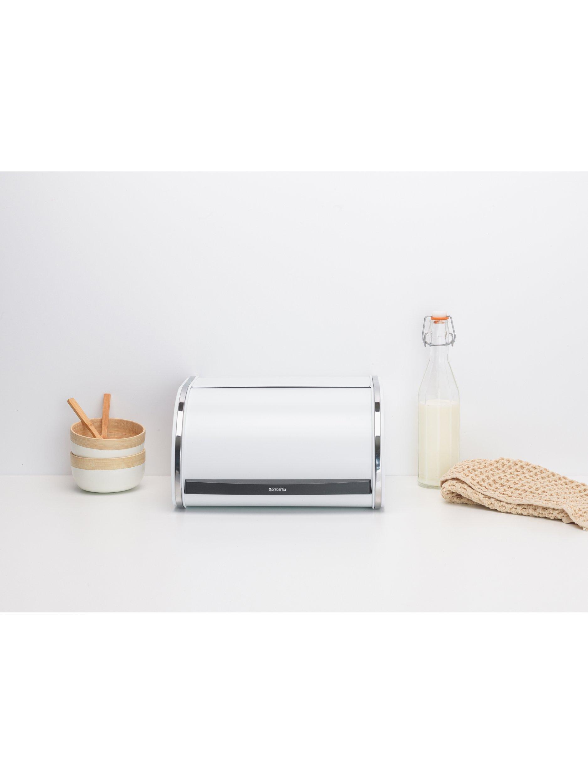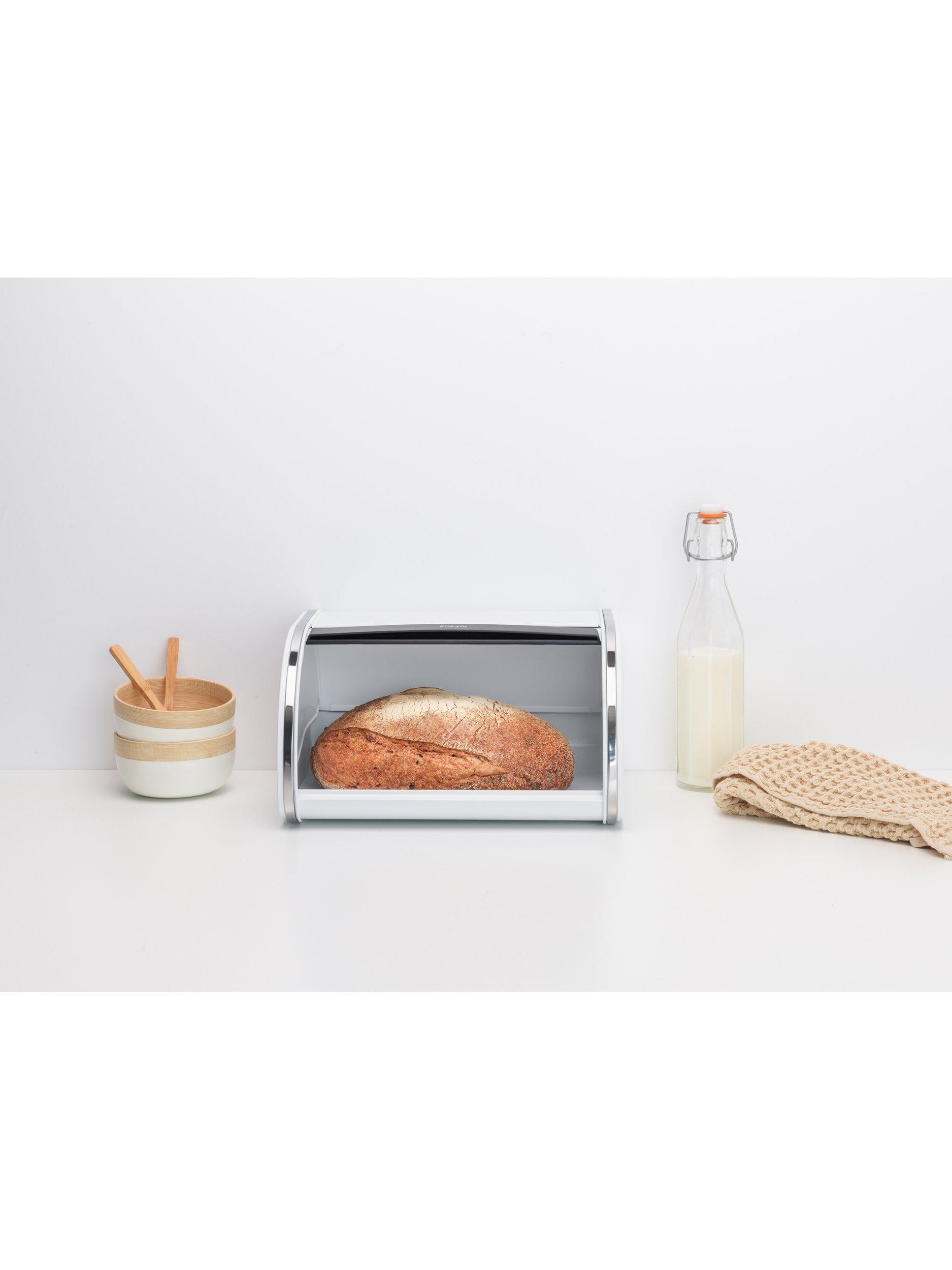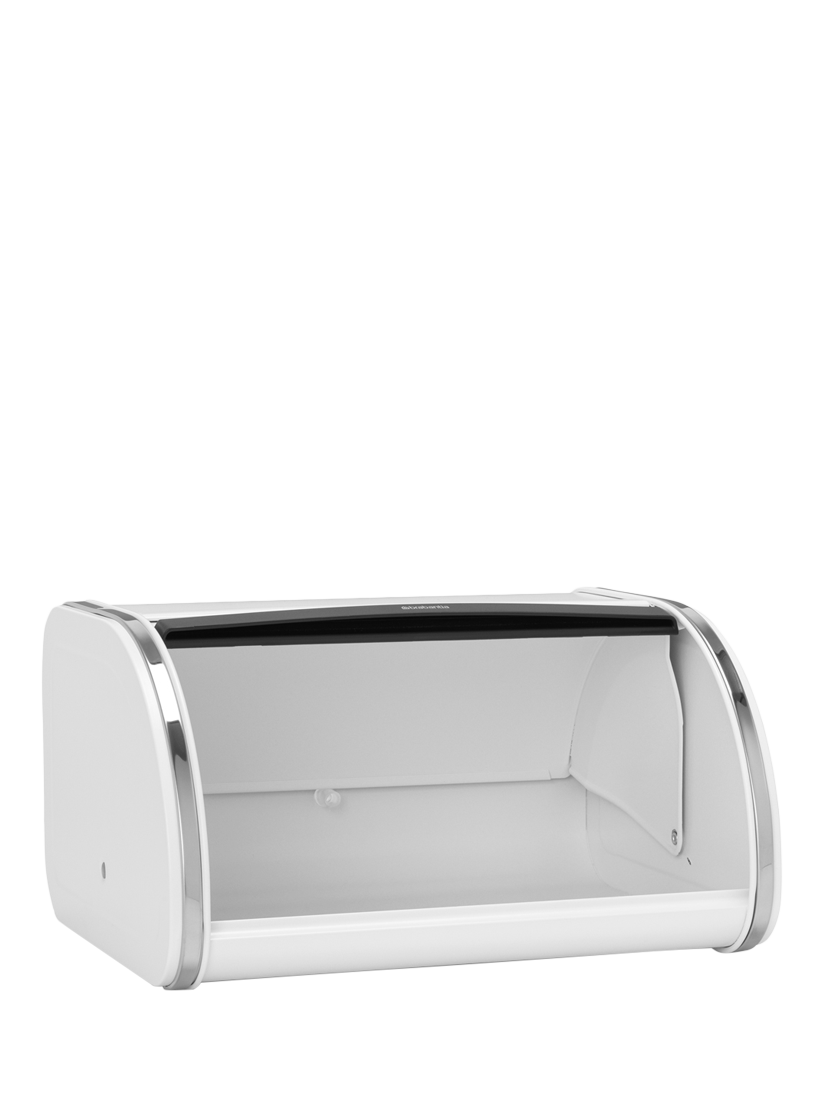 Keep your bread handy and fresh in this medium-sized Brabantia Roll Top Bread Bin. This compact bread bin happily holds up to one loaf or anything else you want to store. The lid has a large grip for easy opening and slides smoothly into the back of the bin. To top it off, this bread bin has a partially flat top to put your canisters on.