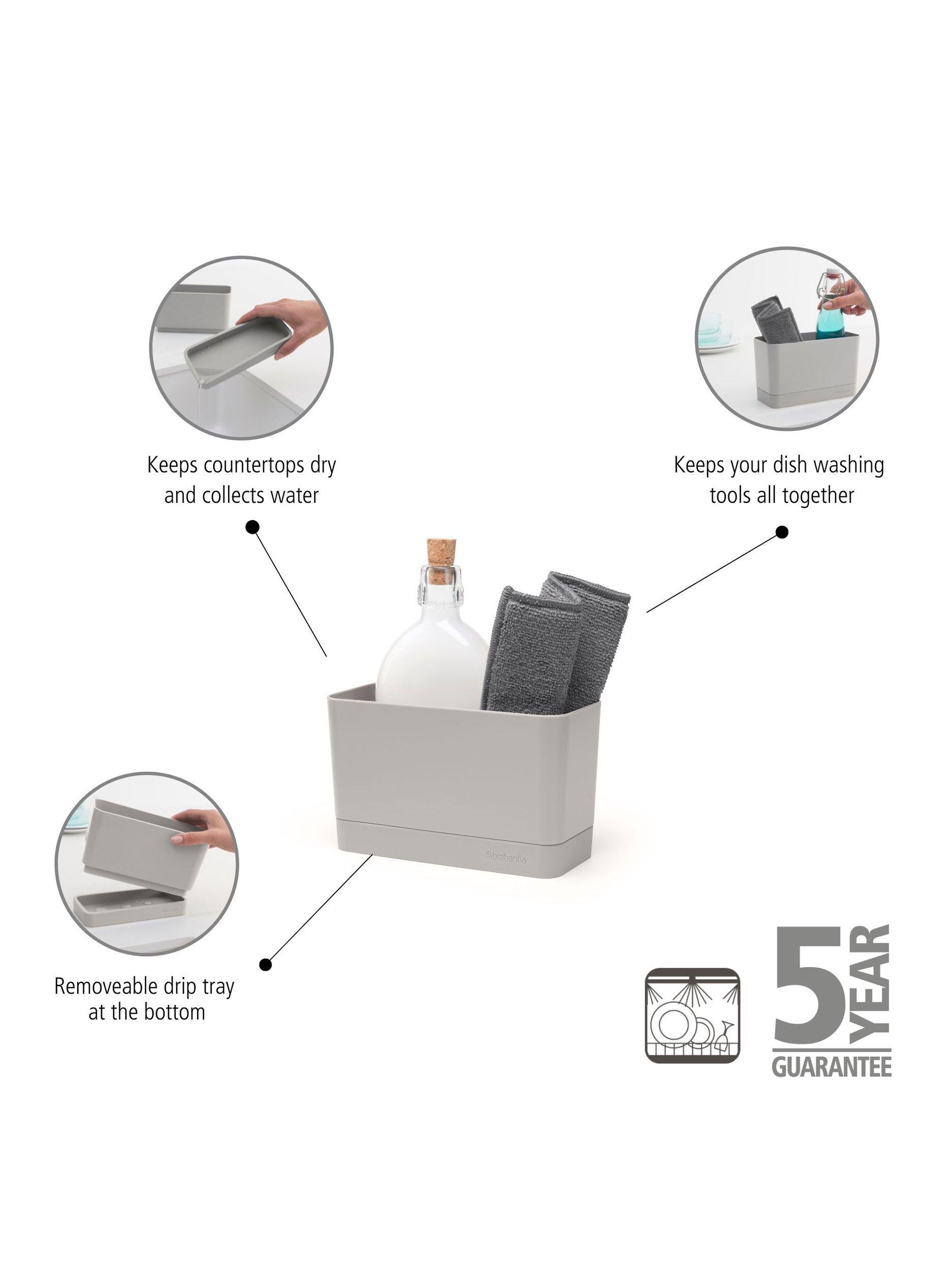 This simple, compact sink organiser features plenty of room to hold a bottle of detergent, sponges and other cleaning accessories.